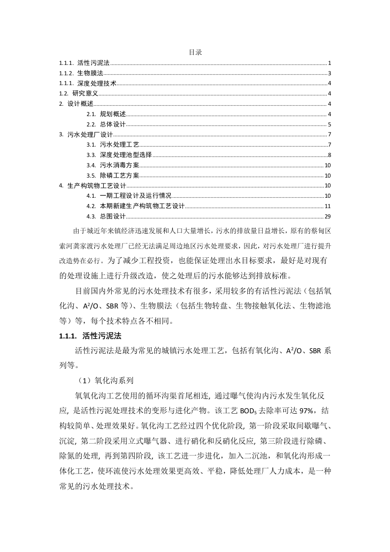 目录1.1.1.活性污泥法…11.1.2.生物膜法…31.1.1.深度处理技术.41.2.研究意义…2.设计概述.…2.1.规划概述42.2.总体设计.53.污水处理厂设计…3.1.污水处理工艺73.3.深度处理池型选择3.4.污水消毒方案.103.5.除磷工艺方案…4.生产构筑物工艺设计…104.1.一期工程设计及运行情况4.2.本期新建生产构筑物工艺设计114.3.总图设计由于城近年来镇经济迅速发展和人口大量增长,污水的排放量日益增长,原有的蔡甸区索河龚家渡污水处理厂己经无法满足周边地区污水处理要求,因此,对污水处理厂进行提升改造势在必行。为了减少工程投资,也能保证处理出水目标要求,最好是对现有的处理设施上进行升级改造,使之处理后的污水能够达到排放标准。目前国内外常见的污水处理技术有很多,采用较多的有活性污泥法(包括氧化沟、A2/O、SBR等)、生物膜法(包括生物转盘、生物接触氧化法、生物滤池等)等,每个技术特点各不相同。1.1.1.活性污泥法活性污泥法是最为常见的城镇污水处理工艺,包括有氧化沟、A2/O、SBR系列等。(1)氧化沟系列氧氧化沟工艺使用的循环沟渠首尾相连,通过曝气使沟内污水发生氧化反应,是活性污泥处理技术的变形与进化产物。该工艺BOD5去除率可达97%,结构较简单、处理效果好。氧化沟工艺经过四个优化阶段,第一阶段采取间歇曝气、沉淀,第二阶段采用立式曝气器、进行硝化和反硝化反应,第三阶段进行除磷、除氮的处理,再到第四阶段,该工艺进一步进化,加入二沉池,和氧化沟形成一体化工艺,使环流使污水处理效果更高效、平稳,降低处理厂人力成本,是一种常见的污水处理技术。(2)A2/0系列A2/O工艺,又称A-A-O工艺,是一种同时可以脱氮除磷的污水处理工艺。A2/O生物池分为三个独立的区:厌氧、缺氧、好氧,由于环境条件各不相同,不同种类微生物菌群有机配合,污染物去除效率高,运行稳定。且在厌氧一缺氧一好氧交替运行条件下,丝状菌繁殖困难,鲜少发生污泥膨胀现象。池中好氧区的供氧可选择鼓风曝气、表面曝气两种方式。此工艺缺点是污泥回流量大,需要较高能耗,基建费和运行费,运行管理水平要求高。(3)SBR系列SBR工艺又称序批式活性污泥法,特点是间歇曝气方式来运行。该工艺序批过程按顺序分为进水、曝气反应、沉淀、排水、闲置待机五个工序,五个工序在同一容器中进行。序批时间根据进水浓度和设计符合有机负荷不同而有所差异。SBR工艺优点较多,最大的特点是集中所有反应、沉淀工序于同一反应器中进行,省去了很多构筑物和设施,从而达到节省占地,降低基建投资的目的。SBR工艺近来不断发展,出现多种改良型,主要有:传统SBR、CAST、CASS、Unitank工艺等。(a)传统SBR工艺其反应在同一容器中进行。工艺步骤是在同一容器中进水时,形成厌氧一缺氧一停止进水一曝气充氧一脱氮除磷一沉淀一出水。缺点是构筑物总容积利用率低,一般小于50%,较小污水量情况时才比较适用。(b)CAST工艺CAST工艺是一种新技术,是在传统SBR工艺和ICEAS工艺基础上优化发展起来的。每组CAST系统通常都有进水、反应、沉淀、闲置和出水四道工序,在四个池子中轮流运转工作。预反应区通常位于每个池子的前端,部分污泥回流回该区域。该技术优点是,具有很强的抗冲击负荷、适应水质变化的能力,处理效果也比较明显。缺点是每座池子都需要安装沉淀的滗水器及控制系统、曝气设备,不仅间歇排水,增加水头损失,而且设备的闲置率较高、利用率低,另外要求自动化程度较高。(c)Unitank工艺Unitank工艺比较先进,它同时拥有SBR和传统活性污泥法两种技术的优点恒定水位,连续运行,占地小,系统灵活。(d)CASS工艺CASS工艺就是周期循环活性污泥法,在SBR的基础上,通过在池内进水一端增加生物选择器,从而实现了连续进水,间歇排水。CASS反应池分为生物选择区(预反应区)和主反应区两部分。预反应区在反应池前端,池内微生物经过酶的快速转移机理,污水中大部分可溶性有机物被迅速吸附,在高负荷的机制快速累积过程中,进水中的水质、水量、P“和有毒物质被缓冲,同时丝状菌的成长会遭到有效的抑制。主反应区在反应池后端,在该反应区内,污水中的污染物经历一个负荷较低的基质降解过程。CASS工艺特点是将反应、沉淀、排水、功能四者融为一体,去除污染物效果明显,同时具有较好的脱氮除磷效果。1.1.2.生物膜法生物膜法也是常见的污水处理工艺,中小型的污水处理厂通常会比较使用,主要类型有生物转盘法、生物接触氧化法、生物滤池法等。(a)生物转盘法生物转盘是由接触反应槽、驱动装置、盘片、转动轴等组成的生物反应器。微生物会形成生物膜,附着在盘片外表上,转轴以下约45%的盘面淹没在污水中,工作时,随着生物转盘不停地旋转,盘片上的生物膜与大气、污水轮替接触,从而形成厌氧、缺氧、好氧的交替环境。生物转盘的特点是(①有气味产生,对环境有一定影响:②能源消耗低,管理便利:③不会发生堵塞现象,净化效果好:④占地面积大。(b)生物接触氧化法生物接触氧化法(浸没式曝气生物池)是目前主要污水处理工艺之一,普遍应用于有机工业废水生物处理、小型生活污水处理中,在生物滤池的基础上慢慢发展演变得到。生物接触氧化法是在池中装填合成纤维、沸石、焦炭等填料,污水将填料浸没,通过向池底曝气对污水进行充氧,在填料上的生物膜利用自身的生物氧化