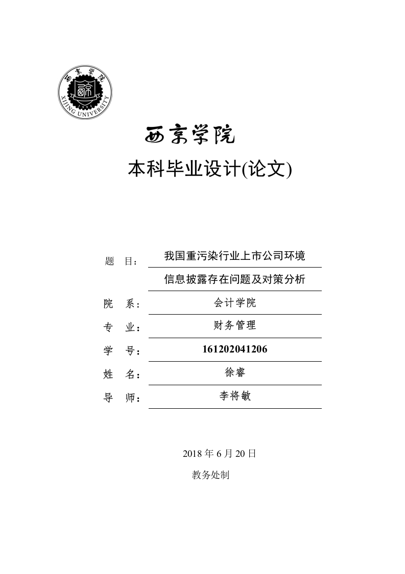 本科毕业设计(论文)题目:我国重污染行业上市公司环境信息披露存在问题及对策分析院系:会计学院专业:财务管理学号:161202041206姓名:徐睿导师:李将敏2018年6月20日教务处制西京学院原创性声明本人郑重声明:本人所呈交的毕业设计(论文),是在导师的指导下独立进行研究所取得的成果。毕业设计(论文)中凡引用他人已经发表或未发表的成果、数据、观点等,均己明确注明出处。除文中己经注明引用的内容外,不包含任何其他个人或集体已经发表或在网上发表的论文。特此声明。论文作者签名:日期:摘要“十三五”规划提出了“坚持绿色发展,着力改善生态环境”等多项关于环境保护的建议。我国近年来环境保护工作虽然取得积极进展,但仍有一些环境问题没有得到有效解决,其中经济发展与环境保护的矛盾尤为突出。企业在环境治理与环境质量的提高中承担着重要的角色,企业不仅是社会财富的创造者,更是环境污染的首要制造者。为应对这种情况,本文在学者们研究的基础上继续深入探究重污染行业上市公司的环境信息披露问题,以7大重污染行业150家上市公司为基础,研究其环境信息披露问题,从而得出相关结论以及相应对策。本文通过收集相关资料,包括招股说明书、年报、社会责任报告以及财务报表及附注等,在此基础上整理归纳分析这些公司环境信息披露现状及问题,重点分析了问题产生的原因及解决措施。笔者认为,为了使我国环境信息披露制度更加完善,应当提高企业做好环境信息披露的意识、规范并统一环境信息披露的内容、加强独立第三方对环境信息的鉴证,对我国环境信息披露的发展提供助力。关键词:重污染行业:上市公司:环境信息披露:问题:对策