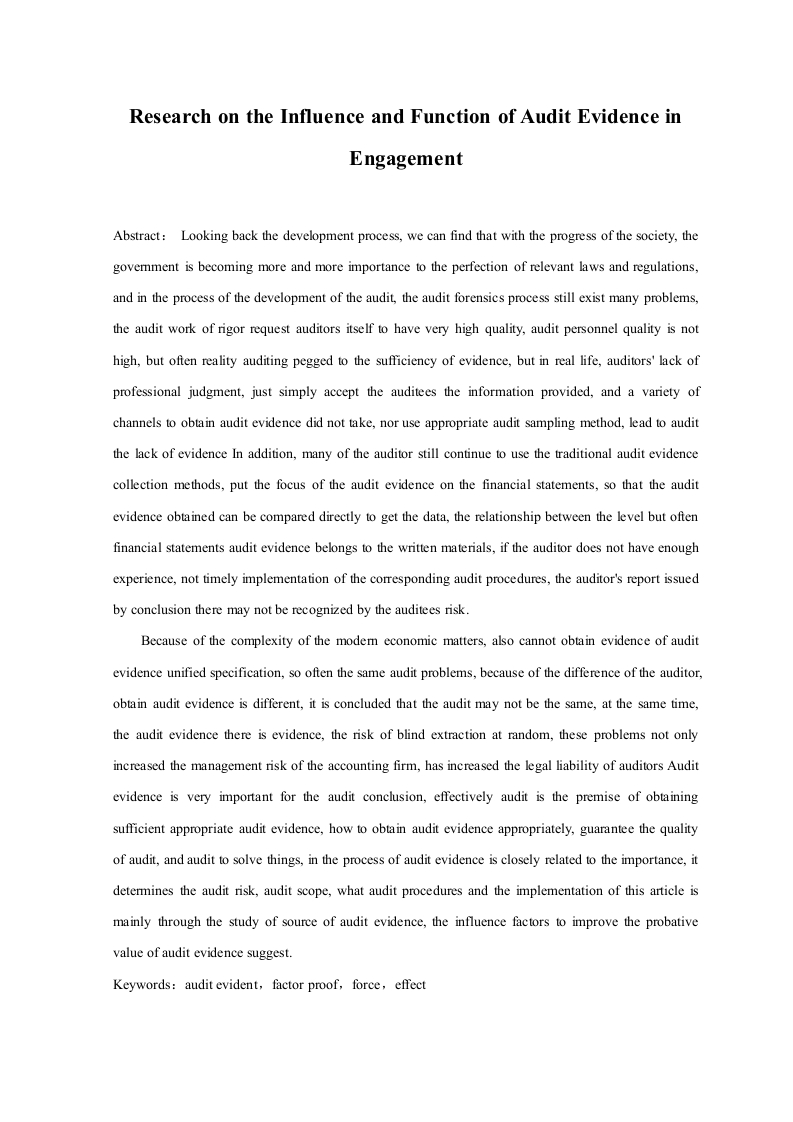 Research on the Influence and Function of Audit Evidence inEngagementAbstract:Looking back the development process,we can find that with the progress of the society,thegovemment is becoming more and more importance to the perfection of relevant laws and regulations,and in the process of the development of the audit,the audit forensics process still exist many problems,the audit work of rigor request auditors itself to have very high quality,audit personnel quality is nothigh,but often reality auditing pegged to the sufficiency of evidence,but in real life,auditors'lack ofprofessional judgment,just simply accept the auditees the information provided,and a variety ofchannels to obtain audit evidence did not take,nor use appropriate audit sampling method,lead to auditthe lack of evidence In addition,many of the auditor still continue to use the traditional audit evidencecollection methods,put the focus of the audit evidence on the financial statements,so that the auditevidence obtained can be compared directly to get the data,the relationship between the level but oftenfinancial statements audit evidence belongs to the written materials,if the auditor does not have enoughexperience,not timely implementation of the corresponding audit procedures,the auditor's report issuedby conclusion there may not be recognized by the auditees risk.Because of the complexity of the modem economic matters,also cannot obtain evidence of auditevidence unified specification,so often the same audit problems,because of the difference of the auditor,obtain audit evidence is different,it is concluded that the audit may not be the same,at the same time,the audit evidence there is evidence,the risk of blind extraction at random,these problems not onlyincreased the management risk of the accounting firm,has increased the legal liability of auditors Auditevidence is very important for the audit conclusion,effectively audit is the premise of obtainingsufficient appropriate audit evidence,how to obtain audit evidence appropriately,guarantee the qualityof audit,and audit to solve things,in the process of audit evidence is closely related to the importance,itdetermines the audit risk,audit scope,what audit procedures and the implementation of this article ismainly through the study of source of audit evidence,the influence factors to improve the probativevalue of audit evidence suggest.Keywords:audit evident,factor proof,force,effect目录第1章绪论…11.1研究背景和意义…11.1.1研究背景.…11.1.2研究意义.…11.2研究方法和内容21.2.1研究方法…21.3文献综述.…31.3.2国内研究第2章影响审计证据证明力的因素分析.....52.1审计证据的充分性和适当性.2.2审计证据的来源与审计证据的载体.52.2.2审计证据的载体.…62.3审计证据与重要性的关系.62.4审计证据与审计风险.7第3章天津中审联会计师事务所广东分所有限责任公司基本概况及审计业务现状.83.1天津中审联会计师事务所广东分所的基本概况..83.2天津中审联会计师事务所广东分所审计业务现状.8第4章审计证据对天津中审联会计师事务所广东分所业务影响研究..94.1审计证据对事务所影响的有利与不利影响.94.1.1审计证据对事务所的有利影响.。9第5章提升天津中审联会计师事务所广东分所审计证据证明力的建议...125.1事务所内部的建议..12125.1.3增强审计人员的职业素质能力…135.2社会环境外部的建议.135.2.1被审计单位应注重内部控制制度…135.2.2应该完善审计的相应法律法规...。13致谢15第1章绪论1.1研究背景和意义1.1.1研究背景审计作为经济生活的重要角色之一,具有很长的发展历史,最早的审计源于中国最早的朝代-商朝,那时候审计的内容主要是检查财产出入,具有奖赏处罚用人的权利,职责人员的权限比较小,到辛亥革命之后,现代审计也没有得到很好的发展,那时候国家更多的面临战争以及被他人掠夺,使得审计更多像是空有其表的空壳子,发挥不了它的经济监督的作用。审计真正得到重视的机会,还是源于邓小平的决策,他提出依法治国的理念,审计监督的相关法律也得到了相应地完善,2020年1月2日到3日全国审计工作会议于北京召开,本次工作会议主要贯彻新时期国家的主题,对审计工作进行抓重点,以强补弱为措施,全国审计工作会议的召开,充分表明了国家对审计工作的要求与之前相比更加的严格,也体现了党和国家对审计工作更加的重视,这对于审计监督来说是一个重要的机遇。同时,中国注册会计师协会,简称中注协也对审计监督发布了相关的文件,其中也包括对审计证据相关的具体规定作为了修改,随着国际形式的不断变化,各种审计风险层出不穷,怎样减少风险,准确得得出审计结论也成为审计的一个重大的难题。①在审计工作过程中,为了降低审计风险,审计证据作为得出审计结论的重要载体是非常重要的,本文主要是是通过结合国内外文献,研究审计证据在审计过程中的作用及影响。1.1.2研究意义所有的审计结论是在获取的审计证据的基础上作出的,由此可见,审计证据的质量就像原材料一样,只有材料有料,做出来的蛋糕才是香软可口的,因此审计证据是影响注册会计师做出审计判断,得出审计结论,审计证据存在缺陷的时候,注册会计师是不能得出审计结论并出具审计报告的,当然特殊事项除外,比如审计范围由于外宋月美,王海棠.浅析大数据环境为审计证据带来的挑战山西农经.201811).1