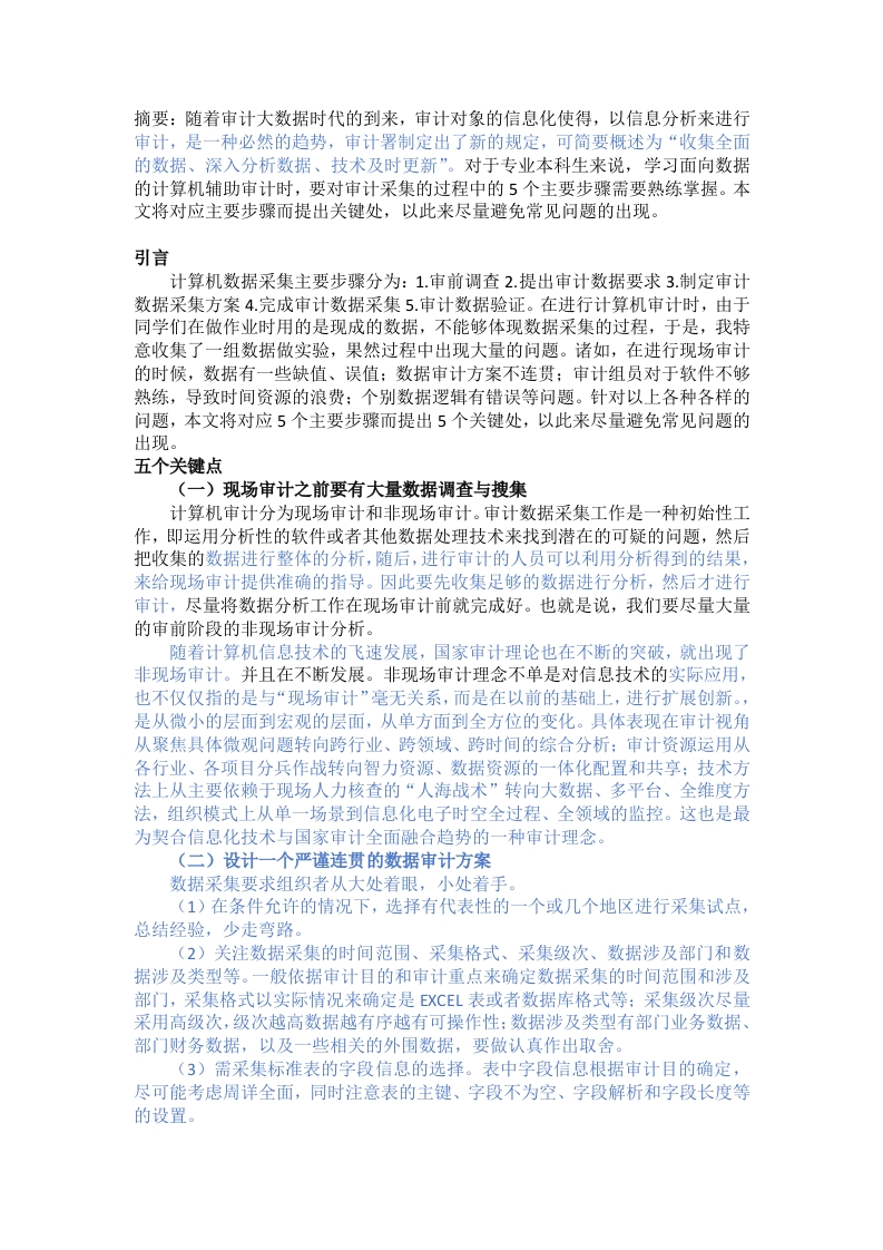 摘要:随着审计大数据时代的到来,审计对象的信息化使得,以信息分析来进行审计,是一种必然的趋势,审计署制定出了新的规定,可简要概述为“收集全面的数据、深入分析数据、技术及时更新”。对于专业本科生来说,学习面向数据的计算机辅助审计时,要对审计采集的过程中的5个主要步骤需要熟练掌握。本文将对应主要步骤而提出关键处,以此来尽量避免常见问题的出现。引言计算机数据采集主要步骤分为:1.审前调查2.提出审计数据要求3.制定审计数据采集方案4.完成审计数据采集5.审计数据验证。在进行计算机审计时,由于同学们在做作业时用的是现成的数据,不能够体现数据采集的过程,于是,我特意收集了一组数据做实验,果然过程中出现大量的问题。诸如,在进行现场审计的时候,数据有一些缺值、误值:数据审计方案不连贯;审计组员对于软件不够熟练,导致时间资源的浪费:个别数据逻辑有错误等问题。针对以上各种各样的问题,本文将对应5个主要步骤而提出5个关键处,以此来尽量避免常见问题的出现。五个关键点(一)现场审计之前要有大量数据调查与搜集计算机审计分为现场审计和非现场审计。审计数据采集工作是一种初始性工作,即运用分析性的软件或者其他数据处理技术来找到潜在的可疑的问题,然后把收集的数据进行整体的分析,随后,进行审计的人员可以利用分析得到的结果,来给现场审计提供准确的指导。因此要先收集足够的数据进行分析,然后才进行审计,尽量将数据分析工作在现场审计前就完成好。也就是说,我们要尽量大量的审前阶段的非现场审计分析。随着计算机信息技术的飞速发展,国家审计理论也在不断的突破,就出现了非现场审计。并且在不断发展。非现场审计理念不单是对信息技术的实际应用,也不仅仅指的是与“现场审计”毫无关系,而是在以前的基础上,进行扩展创新。,是从微小的层面到宏观的层面,从单方面到全方位的变化。具体表现在审计视角从聚焦具体微观问题转向跨行业、跨领域、跨时间的综合分析:审计资源运用从各行业、各项目分兵作战转向智力资源、数据资源的一体化配置和共享:技术方法上从主要依赖于现场人力核查的“人海战术”转向大数据、多平台、全维度方法,组织模式上从单一场景到信息化电子时空全过程、全领域的监控。这也是最为契合信息化技术与国家审计全面融合趋势的一种审计理念。(二)设计一个严谨连贯的数据审计方案数据采集要求组织者从大处着眼,小处着手。(1)在条件允许的情况下,选择有代表性的一个或几个地区进行采集试点,总结经验,少走弯路。(2)关注数据采集的时间范围、采集格式、采集级次、数据涉及部门和数据涉及类型等。一般依据审计目的和审计重点来确定数据采集的时间范围和涉及部门,采集格式以实际情况来确定是EXCEL表或者数据库格式等:采集级次尽量采用高级次,级次越高数据越有序越有可操作性:数据涉及类型有部门业务数据、部门财务数据,以及一些相关的外围数据,要做认真作出取舍。(3)需采集标准表的字段信息的选择。表中字段信息根据审计目的确定,尽可能考虑周详全面,同时注意表的主键、字段不为空、字段解析和字段长度等的设置。(三)数据采集实施要合理的管理与组织数据采集工作一般由方案制定的部门组织实施。在设计好数据采集方案,确定好数据采集的时间范围、采集格式、采集级次、数据涉及部门和数据涉及类型后,就要明确提出数据采集完成时间、数据保密工作等要求,同时落实好数据采集工作的具体责任,实行一级对一级负责,保障工作的有序进行。推进统计机制建设。一是通过内部制度建设,规范工作标准,明确工作权利和责任,开展绩效考核,调动统计干部的积极性和创造性。二是来进行外部制度的完善,把职责确定,部门之间相互配合。形成“各尽其能、互相监督、统计反馈、联合监控”机制。三是要增强统计法制建设,聚焦重点的统计项目,有目的性的进行执法检查,尽力让统计执法工作尽快进入常规化以及制度化的模式。四是要加大力度促进统计信息化建设,深层次的建设网络运维,要应用现代科技,让工作效率得到提高。大数据时代的来临,让审计项目组织管理更加科学合理。一方面,大数据能够对审计组织结构的扁平化提供有效支撑。中国的审计项目组织结构,通常是是业务型的,根据各个部门的职责,和工作区间制定审计分工。但现在审计环境发生了很大的改变,也发现了现在的审计项目组织结构的很多弊端。比如现在实行的审计项目结构,一般是是按照审计业务的部门所处地域为中心,来让业务得到实行。现在审计项目的任务量庞大,更加的复杂,需要进行很多的在不同的地点、不同的部门之间进行合作,但是这种方式,造成了一些影响,把原本完整的业务流程,分成了几个部分,难免的会受到地域、部门差异的影响。大数据时代的来临,还有不断发展的信息技术,让传统组织的运转方式得到了很大的转变,调查组织内部工作的具体执行情况,也可以利用网络,通过信息系统,能够在第一时间进行数据交流以及反馈,让管理更加全面,减少了很多不必要的步骤,让组织的高层与基层之间的信息交流能更加快捷方便,让较少的层级就可以完成比过去多的多的任务,从而保证组织信息能够尽快的传递,减少了组织的很多不必
