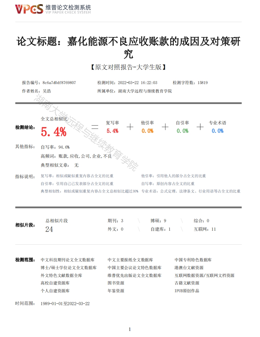 维普论文检测系统VIP PAPER CHECK SYSTEM论文标题:嘉化能源不良应收账款的成因及对策研究【原文对照报告-大学生版】报告编号:8c6a7d0df8769807检测时间:2022-03-2216:22:03检测字符数:15819作者姓名:吴浩所属单位:湖南大学远程与继续教育学院全文总相似比程复写率他引率自引率专业术语检测结论:5.4%5.4%其他指标:自写率:94.6%继续0.0%0.0%0.0%高频词:账款,应收,公司,企业,不良学二典型相似文章:无指标说明:复写率:相似或疑似重复内容占全文的比重他引率:引用他人的部分占全文的比重自引率:引用自己已发表部分占全文的比重自写率:原创内容占全文的比重典型相似性:相似或疑似重复内容占全文总相似比超过0%专业术语:公式定理、法律条文、行业用语等占全文的比重总相似片段期刊:3博硕:9综合:0相似片段:24外文:0自建库:1互联网:11检测范围:中文科技期刊论文全文数据库中文主要报纸全文数据库中国专利特色数据库博士/硕士学位论文全文数据库中国主要会议论文特色数据库港澳台文献资源外文特色文献数据全库维普优先出版论文全文数据库互联网数据资源/互联网文档资源高校自建资源库图书资源古籍文献资源个人自建资源库年鉴资源IPUB原创作品时间范围:1989-01-01至2022-03-22维普论文检测系统VIP PAPER CHECK SYSTEM原文对照颜色标注说明:■自写片段■复写片段(相似或疑似重复)口引用片段(引用)■专业术语(公式定理、法律条文、行业用语等)湖南大学HUNAN UNIVERSITY毕业论文学远程与继题目:嘉化能源不良应收账款的成因及对策研究学生姓名:吴浩学号:年级专业:会计学育学院指导老师:二0二二年三月二十日摘要正常情况下,很多企业销售手段是习惯用信用赊销营销方式。可想而知,对于公司而言,企业的营业收入与应收账款呈现正相关增长,同时企业的现金运转管理减少,带来经营和盈利风险也与日俱增,也是企业产生不良应收账款形成因素之一。首先,就本文嘉化能源公司对不良应收账款研究而言,从应收账款目标客户、信用管理制度、动态跟踪流程管理以及账款追索机制着手研究。其次,通过对嘉化能源公司不良应收账款的探讨、研究,结合公司财务指标数据进行深入分析发现问题,使得从中得出可用性理论性知识可以应用到国内其他企业,预防与降低,为企业的现金管理梳理提供可借鉴的经验。最后,把控目标客户,规范信用管理制度,加强动态跟踪流程和健全账款追索机制。因此,应收账款回收率可以得到减少,避免不良应收账款的出现。关键词:应收账款:成因:对策目录(一)研究背景、目的和意义···1(二)国内外相关研究综述·······(三)研究内容和研究方法·····(四)研究思路和技术路线图(五)本文的创新点及不足之处二、不良应收账款的概述······2维普论文检测系统VIP PAPER CHECK SYSTEM(一)不良应收账款概念6(二)不良应收账款的管理······(三)不良应收账款对企业的危害······三、嘉化能源不良应收账款存在的问题···(一)嘉化能源公司的经营模式······(二)嘉化能源公司经营现状········8(三)嘉化能源公司不良应收账款的分析·····10四、嘉化能源不良应收账款成因··········13(一)逾期或坏账增加,缺少外部客户分析13(二)信用管理制度维护不足,事前预防未落到实处··14(三)流程管理欠缺,动态跟踪有待加强········15(四)不健全的账款追索机制且执行力不足15五、降低嘉化能源不良应收账款的对策····16(一)与外部客户建立对账制度·····。·:···16(二)建立健全的信用管理机制·········17(三)加强日常跟踪流程管理·····(四)加强账款追索账索机制18六、19一、绪论(一)研究背景、目的和意义1.研究背景在经济全球化快速增长情况下,行业竞争激烈,市场环境也非常猛烈,在这类程度下,市场占有率的提高,营业收入的增加,赊销政策就会被适当放宽,随之而来的就是大量的问题。资金流入量的变化在于应收账款的增加,风险与资金形影不离,从而引发管理不当,缺少安全系数。企业经营管理出现疏忽,因此会出现计提坏账,都是企业资金运转的速度变慢原因之一,有甚至会影响生产经营。因此,对于企业来说应收账款管理十分的重要,不良应收账款管理是企业的管理人员必须要重视,并且能够积极地采取一套完整的管理模式。与此同时,国外学者们已经开始着手研究企业的信用管理,分析研究较为成熟是不良应收账款理论。在日常的公司运营流程中,拥有严格的制度,却不怎么能对客户信誉状况进行辨认评价。因为我国信誉政策实施的比较迟,所以社会信誉根底没有那么牢固,信誉体系仍需进一步加强改进,在现行的市场经济环境下,存在较为完善的不良应收账款管理方式的企业内部,在具体的工作中执行起来也是非常困难的,仍然存在不良应收账款。所以,企业想要长久并稳定的发展面临的首要问题就是建立一套高效且合理的管理机制,减少不良应收账款的出现。2.研究目的通过研究嘉化能源不良应收账款,用绕其外部客户、信用制度、流程管理和账款追索机制方面深入研究、探3