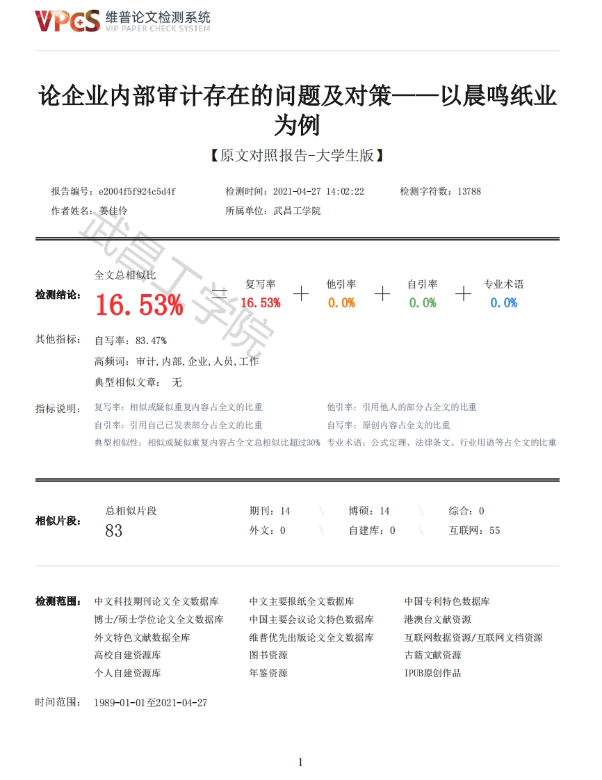 维普论文检测系统VIP PAPER CHECK SYSTEM论企业内部审计存在的问题及对策一一以晨鸣纸业为例【原文对照报告-大学生版】报告编号:e2004f5f924c5d4f检测时间:2021-04-2714:02:22检测字符数:13788作者姓名:姜佳伶所属单位:武昌工学院全文总相似比复写率他引率自引率专业术语检测结论:16.53%16.53%0.0%0.0%0.0%其他指标:自写率:83.47%高频词:审计,内部,企业,人员,工作典型相似文章:无指标说明:复写率:相似或疑似重复内容占全文的比重他引率:引用他人的部分占全文的比重自引率:引用自己已发表部分占全文的比重自写率:原创内容占全文的比重典型相似性:相似或疑似重复内容占全文总相似比超过30%专业术语:公式定理、法律条文、行业用语等占全文的比重总相似片段期刊:14博硕:14综合:0相似片段:83外文:0自建库:0互联网:55检测范围:中文科技期刊论文全文数据库中文主要报纸全文数据库中国专利特色数据库博士/硕士学位论文全文数据库中国主要会议论文特色数据库港澳台文献资源外文特色文献数据全库维普优先出版论文全文数据库互联网数据资源/互联网文档资源高校自建资源库图书资源古籍文献资源个人自建资源库年鉴资源IPUB原创作品时间范围:1989-01-01至2021-04-27维普论文检测系统VIP PAPER CHECK SYSTEM原文对照颜色标注说明:■自写片段■复写片段(相似或疑似重复)口引用片段(引用)■专业术语(公式定理、法律条文、行业用语等)YOLOGYWUCHANG INSTITUTE OF TECHNOLOGY本科毕业论文(设计)论企业内部审计存在的问题及对策论文题目以晨鸣纸业为例姓名姜佳伶学号173006030107班级1701班年级2017级专业审计学学院会计学院指导教师倪春来高级会计师完成时间2021年4月20日作者声明本毕业论文(设计)是在导师的指导下由本人独立撰写完成的,没有剽窃、抄袭、造假等违反道德、学术规范和其他侵权行为。对本论文(设计)的研究做出重要贡献的个人和集体,均已在文中以明确方式标明。因本毕业论文(设计)引起的法律结果完全由本人承担。毕业论文(设计)成果归武昌工学院所有。特此声明作者专业审计学专业作者学号173006030107作者签名年月日2维普论文检测系统VIP PAPER CHECK SYSTEM摘要内部审计旨在对企业的经济情况进行监督和控制,采用一些系统、规范的方法化解威胁企业的内外部风险,对企业的经营管理和财务收支进行审计,从而评价和改进企业的风险管理、内部控制和治理,实现企业的可持续发展,帮助企业增值。真正发挥好内部审计的作用,可以帮助企业合理规避风险,为内控治理营造良好环境,更好的实现企业战略目标。但是就目前而言,处于市场经济体制下的企业,在内部审计工作的开展中存在着诸多问题,要想保证企业的健康发展,研究企业内部审计存在的问题,提出强化内部审计质量的对策是十分必要的。本文分为四个部分,第一部分对内部审计进行了概述,分别从含义和职能两方面着手:第二部分对当前企业内部审计存在的问题进行了细致研究,认识到当前企业内部审计存在着审计制度体系不健全、审计范围不全面、内部审计形同虚设、审计技术和方法落后、内审人员综合素质不高等问题:第三部分以晨鸣纸业为例,对其内部审计存在的问题进行了探究和总结:第四部分针对问题提出了强化内部审计质量的对策。根据所研究的问题,本文提出了强化内部审计质量的对策,主要是以下五点:健全内部审计制度体系、拓展内部审计业务范围、保证内部审计机构和人员的独立性、优化内部审计技术和方法、加强内部审计队伍建设,这将一定程度上促进企业的健康发展,使企业在市场经济的竞争中立于不败之地。关键词:内部审计:内部控制:问题及对策AbstractInternal audit aims at supervising and controlling the enterprise's economic situation.Adoptingsome systematic and normative methods to resolve enterprise's internal and external risks.,auditingenterprise's operating management and financial revenues,thereby evaluating and improving theenterprise's risk management,internal control and governance.These are all for the sustainabledevelopment of the enterprise,to help enterprise increase the value of the target.Giving full playto the role of internal audit can help enterprises avoid risks reasonably,create a good environmentfor internal control and governance,and achieve the strategic goals of enterprises preferably.However,at present,there are still many problems in the development of the internal audit ofenterprises under the market economy system.In order to ensure the healthy development ofenterprises,it is necessary to study the problems existing in the internal audit of enterprises andgive countermeasures to strengthen the quality of internal audit.This article is divided into four parts,the first part gives an overview of the internal audit,setting about the meaning and function of internal audit;the second part has carried on the detailedresearch of the problems existing in the current enterprise's internal audit,I realize that thecurrent enterprise's internal audit system is not perfect,audit scope is not comprehensive,internalaudit performs practically no function,audit technology and methods are backward,the comprehensivequality of the staff is not high and so on;the third part takes Chenming Paper industry as anexample to explore and summarize the problems;the fourth part puts forward the countermeasures tostrengthen the quality of internal audit.According to the problems studied,this article puts forward the countermeasures to strengthenthe quality of internal audit,including the following fiv