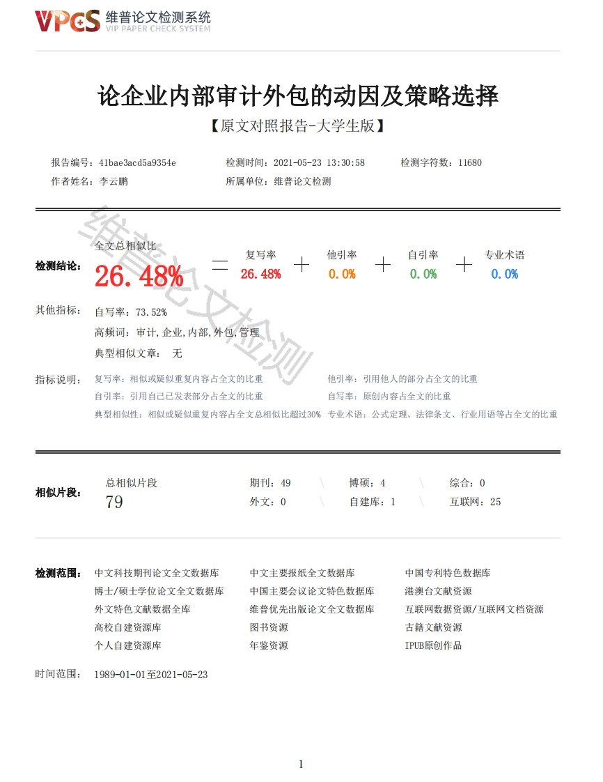 维普论文检测系统VIP PAPER CHECK SYSTEM论企业内部审计外包的动因及策略选择【原文对照报告-大学生版】报告编号:41bae3acd5a9354e检测时间:2021-05-2313:30:58检测字符数:11680作者姓名:李云鹏所属单位:维普论文检测全文总相似比复写率他引率自引率专业术语检测结论:26.48%26.48%0.0%0.0%0.0%其他指标:自写率:73.52%高频词:审计,企业,内部,外包,管理典型相似文章:无指标说明:复写率:相似或疑似重复内容占全文的比重他引率:引用他人的部分占全文的比重自引率:引用自己已发表部分占全文的比重自写率:原创内容占全文的比重典型相似性:相似或疑似重复内容占全文总相似比超过30%专业术语:公式定理、法律条文、行业用语等占全文的比重总相似片段期刊:49博硕:4综合:0相似片段:79外文:0自建库:1互联网:25检测范围:中文科技期刊论文全文数据库中文主要报纸全文数据库中国专利特色数据库博士/硕士学位论文全文数据库中国主要会议论文特色数据库港澳台文献资源外文特色文献数据全库维普优先出版论文全文数据库互联网数据资源/互联网文档资源高校自建资源库图书资源古籍文献资源个人自建资源库年鉴资源IPUB原创作品时间范围:1989-01-01至2021-05-23维普论文检测系统VIP PAPER CHECK SYSTEM原文对照颜色标注说明:■自写片段■复写片段(相似或疑似重复)引用片段(引用)■专业术语(公式定理、法律条文、行业用语等)本科毕业设计(论文)题目:论企业内部审计外包的动因及策略选择姓名李云鹏学号172805204学院经济与管理学院班级审计172指导教师隋海燕2021年5月摘要近些年,许多企业发展迅速,面临着激烈的市场竞争环境,企业必须通过内部审计的实施来改善自身的管理和管理水准,许多企业,特别是中小企业,受到诸多因素的限制,无法建立健全内部审计机构。所以,为解决这一矛盾,公司可以将内部审计业务外包,实现内部审计业务的外部化。尽管企业内部审计的外包具有积极作用,也存在一些不足之处。本文通过举例说明企业内部审计外包的案例,以及分析企业内部审计外包相比于不外包的优势得出外包利大于弊的结论,并从多个角度得出企业内部审计外包的策略选择。关键词:企业:内部审计:外包:解决措施AbstractIn recent years,many enterprises have developed rapidly and are facing fierce marketcompetition.Enterprises must improve their management and management standards through theimplementation of internal auditing.Many enterprises,especially small and medium-sizedenterprises,are restricted by many factors and cannot establish a sound environment.Internal auditagency.Therefore,in order to solve this contradiction,the company can outsource the internalaudit business to realize the externalization of the internal audit business.Although theoutsourcing of corporate internal audit has a positive effect,there are also some shortcomings.This article illustrates the case of enterprise internal audit outsourcing and analyzes theadvantages of enterprise internal audit outsourcing compared with non-outsourcing.It concludes that2维普论文检测系统VIP PAPER CHECK SYSTEMthe advantages of outsourcing outweigh the disadvantages,and draws the strategic choice ofenterprise internal audit outsourcing from multiple angles.Key words:SMEs;internal audit;outsourcing;solutions目录前言11绪论21.1文献综述21.2研究方法21.3创新点22企业内部审计概述32.1企业内部审计的概念32.2企业内部审计的发展历程32.2.1国外企业内部审计的发展历程32.2.2国内企业内部审计的发展历程32.3企业内部审计常用的方法32.3.1审计方法的概念32.3.2审计方法的分类32.3.3内部审计外包的模式43.我国企业内部审计存在的主要问题53.1审计职能定位较为模糊53.2内部审计的客观性与独立性不强53.3资源与范围问题一对审计资源的分配不尽合理、效率低53.4配备问题一审计人员配备不尽合理53.5职能问题一内审的监督职能难于实现53.6保障问题一缺乏完善的内部审计法律保障64企业内部审计外包的动因分析74.1国内外企业内部审计案例分析74.1.1国内企业内部审计案例74.1.2国外内部审计外包典型案例74.2企业内部审计外包的动因84.2.1外包企业拥有大量人才资源84.2.2提高企业内部审计的独立性84.2.3符合成本效益原则84.2.4企业能够集中精力搞好主业84.2.5维持内部审计的独立85企业内部审计外包的策略选择105.1企业内部审计外包的宏观策略(国家方面)105.1.1健全相关法律制度105.1.2出台关于倡导企业内部审计外包的政策105.2企业内部审计外包的微观策略(企业自身方面)105.2.1企业应加强对内部审计外包的了解105.2.2规范内审外包合同105.2.3谨慎选择外包服务机构105.2.4提高外审人员高效工作效率115.3企业内部审计外包的微观策略(外包企业方面)115.3.1强化专业人员的职业素质115.3.2做好自己的内部审计工作113