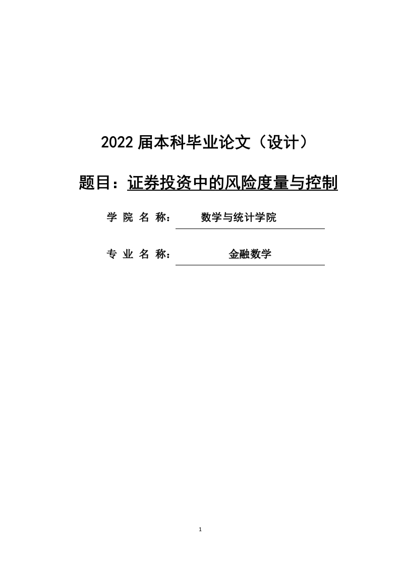 2022届本科毕业论文(设计)题目:证券投资中的风险度量与控制学院名称:数学与统计学院专业名称:金融数学目录证券投资中的风险度量与控制3引言…32证券投资市场的度量.…53证券投资风险的控制1516致谢16作者简介…17声明.18南宁师范大学2022届本科毕业生论文证券投资中的风险度量与控制金融数学杨紫涵[摘要]股票市场是一个高收益伴随着高风险的市场,证券投资是高风险的金融投资。如今,随希经济的不断发展,证券市场的发展已经发生了翻天覆地的变化,给广大的投资者带来了机会与财富,但也给投资者造成了一些风险和负面影响。相与之对应的是它的风险性问题显得更为突出。在我国的证券市场中,对我国的股票市场和股票市场的发展起希举足轻重的作用。所以,对风险度量有一定的了解,建立一个合理的、恰当的合适的风险度量体系,对风险进行有效控制,才能最大限度地的减少风险对投资者们所造成的的损失和伤害,维护好投资者们的经济利益。[关键词]:风险度量;证券投资;风险控制防范Risk measurement and control in securities investmentFinancial Mathematics,Yang Zi-hanAbstract:Stock market is a market with high returns and high risk,and securities investmentis a high-risk financial investment.Nowadays,with the continuous development of the economy,the development of the securities market has undergone tremendous changes,bringingopportunities and wealth to the majority of investors,but also causing some risks and negativeeffects to investors.Correspondingly,its risk problem is more prominent.In China's securitiesmarket,it plays a decisive role in the development of China's stock market and stockmarket.Therefore,to have a certain understanding of risk measurement,establish a reasonable,appropriate and appropriate risk measurement system,and effectively control risks,can minimizethe loss and damage caused by risks to investors,and safeguard the economic interests ofinvestors.Key words:Risk measurement:investment securities:Risk control and prevention引言证券投资是一种通过购买股票、债券、基金及其衍生品等证券,产生经济回报,如股息、利息和资本收益的投资活动。证券投资可以说是一种集体投资的形式,利益和风险是相依的。沃伦·巴菲特说:“长期投资的一条原则是不要亏钱,第二条原则是永远别忘了第一条。”所谓不要亏钱,在本实质上就是强调保证在整个投资过程中进行风险的有效控制,以避免发生不可挽回的损失,而这对所有