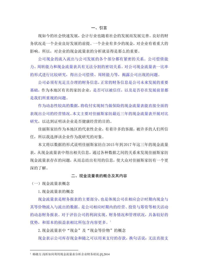 一、引言现如今的社会快速发展,会计行业也随着社会的发展而发展完善。良好的财务状况是一个企业良好发展的前提。一个企业有多少的现金,对企业有着重大的影响。所以,对企业的现金流量表的分析就显得是那么的重要。公司现金的流入流出与公司发展的各个部分都有紧密的关系。公司偿债能力、周转能力和现金流量表具有无法分割的密切关系。对公司现金流量表一比率的形式进行比较研究,得出公司偿债、周转能力等,揭露公司出现的问题。公司必须有充足且合理的财务信息,正常的财务信息是公司未来发展的重要基础,作为本地区有名的家纺企业,是否可以被信任,以及是否存在发展前景都是我们所重视的问题。作为动态性较高的数据,将收付实现制当做保险的现金流量表能直接全面的表现出公司的经营情况。本文主要对佳丽斯家纺最近三年的现金流量表开展对比研究,以达到证明该企业是否健康经营的目的。佳丽斯家纺作为本地区的代表性企业,有着许多的客源,被许多的人们所信任,所以我选择该企业作为我研究的对象。本文将以数据的形式说明佳丽斯家纺自2015年到2017年这三年的现金流量表,从现金流量表中得出相关信息,通过各种数据之间的关系来发现佳丽斯家纺现金流量表存在的问题,从而总结出有用的信息,使大众对佳丽斯家纺有一个更深的了解。二、现金流量表的概念及其内容(一)现金流量表概念1.现金流量表的概念现金流量表是财务报表的主要部分,也是体现公司在相应会计时期内现金与其等价物流入与流出的数据。是公司相应时期内的经营、投资与筹资等相关活动的动态财务报表。对于评估公司的利润实现、财务情况和管理状况,具备较好的优势,和原本的损益表相比所包含内容更多。·2.现金流量表中“现金”及“现金等价物”的概念现金表示公司库存现金和随之可以用来支付的存款,换句话说:无法直接支1杨晓方.浅析如何利用现金流量表分析企业财务状况.),2014付的存款并不是现金。现金被划分成三部分,接下来进行详细分析。库存现金就是公司拥有可随之用来支付的现金:银行存款就是公司储存在金融组织,能随之支取的现金:其他相关货币资金就是存储在金融组织的外埠存款、银行本票与汇票存款、信用卡存款和存出投资款等。现金等价物表示公司拥有的时间短暂(通常表示在购买日起三个月内到期)、流动性高、容易转换成现有金额现金、价值变化概率较低的投资。现金等价物即便不属于现金,然而可以被当做现金,由于其偿付时间不长,风险不高,因此通常状况下能被诠释成现金。通常现金等价物是三个月到期的国库券,主要由国家签发与保障,有时候可以直接诠释成“储存在国家的现金”。利用研究现金与其等价物的变化状况,我们就能直接判定公司的整体实力,且预估公司此后的现金流量。2(二)现金流量表的作用意义报表使用者可以利用现金流量表应用研究与掌握与现金流量相关的条件:对公司支付、偿债、盈利和周转等能力进行评估:现金流量表可以协助公司管理者、投资者对公司此后发展情况进行科学预估,了解公司此后时期内现金流量的能力。研究公司收益质量,为此后制定发展决策提供凭证,避免风险的产生。同时现金流量表的分析能帮助企业管理者和其他的财务报表使用者做出正确判断、了解企业各部分现金运用的是否合理、判断财务状况好坏以及风险。三、佳丽斯家纺有限公司现金流量表的分析(一)公司简介龙岩佳丽斯家纺有限公司是专注于设计、制造与销售家用纺织品的著名公司。建设时间是1992年,总部位于龙岩,下属管理上海佳丽斯家纺与泉州佳鑫纺织装饰用品有限公司。龙岩是佳丽斯印染装饰布与深加工组合套件的制造中心:上海企业是产品设计研发中心:泉州企业是被枕芯类商品的制造中心。企业销售产品一般是床上用品、毛巾毛毯、印染装饰布、酒店布草用品和户外旅游用品等。企业目前“佳丽斯”与“佳伊”品牌具有自身消费群体。现在,前者在国内二十几个省市创建八百多个营销店面。企业综合面积81200平方米,具有完善的世界领先的印染生产线和深加工生2吕红娟现金流量表的编制方法及改进对策研究),20173.现金流量表所反映的财务指标及其分析)],2017产线,不只可以完成生产到出售“短、平、快”,为承接团购与批量加工服务提供方便,此外还能全面管控产品质量,为顾客生产高质量产品。此外,佳丽斯人持续提高管理能力,且在领域内率先通过IS09001质量管理体系认证与IS014001环境管理体系认证。2002年初期,还被我国工商行政管理总局称作“中国驰名商标”。2002年,被我国质量监督检验检疫总局评定成“中国名牌”,且在2005年顺利完成复评。2007年,得到“国家免检”资质。为顾客营造幸福生活,塑造温馨的睡眠环境是佳丽斯人的光辉使命。在未来的发展中,也会始终关注品质,持续创新,创造中国家纺领域的领军公司。(二)现金流量表结构分析掌握公司发展活动所得到的现金净流量是否可以达到公司需求,主要从公司经营活动现金净流量开展研究。对于经营活动现金流量来说,现金流入需要超过流出,如此才可以促进公司的资金高效使用和流通,公司就不会在突发问题上造成资金链断裂出现风险。利用现金流量表的结构研究我们就能清楚的掌握公司现金来源、流动趋势和