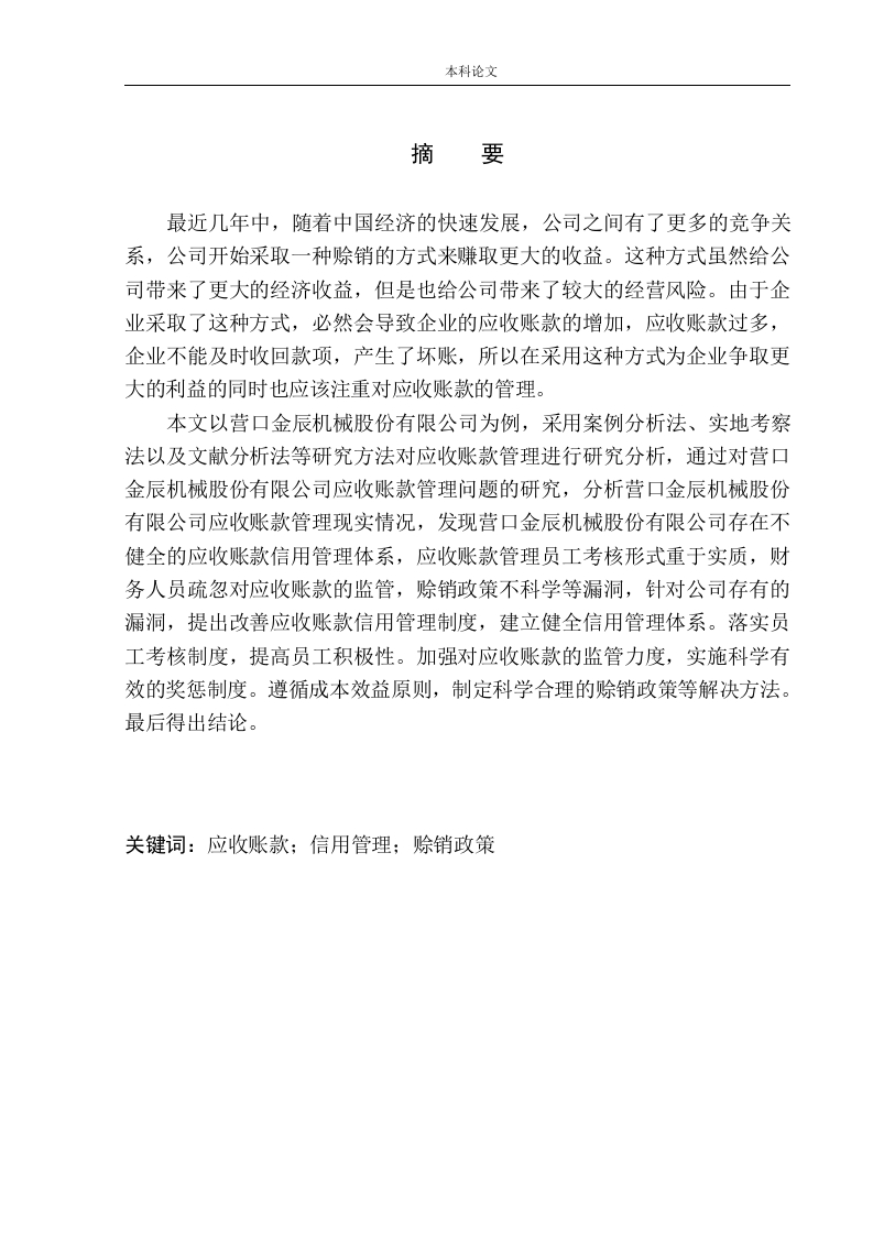 本科论文摘要最近几年中,随着中国经济的快速发展,公司之间有了更多的竞争关系,公司开始采取一种赊销的方式来赚取更大的收益。这种方式虽然给公司带来了更大的经济收益,但是也给公司带来了较大的经营风险。由于企业采取了这种方式,必然会导致企业的应收账款的增加,应收账款过多,企业不能及时收回款项,产生了坏账,所以在采用这种方式为企业争取更大的利益的同时也应该注重对应收账款的管理。本文以营口金辰机械股份有限公司为例,采用案例分析法、实地考察法以及文献分析法等研究方法对应收账款管理进行研究分析,通过对营口金辰机械股份有限公司应收账款管理问题的研究,分析营口金辰机械股份有限公司应收账款管理现实情况,发现营口金辰机械股份有限公司存在不健全的应收账款信用管理体系,应收账款管理员工考核形式重于实质,财务人员疏忽对应收账款的监管,赊销政策不科学等漏洞,针对公司存有的漏洞,提出改善应收账款信用管理制度,建立健全信用管理体系。落实员工考核制度,提高员工积极性。加强对应收账款的监管力度,实施科学有效的奖惩制度。遵循成本效益原则,制定科学合理的赊销政策等解决方法。最后得出结论。关键词:应收账款:信用管理:赊销政策本科论文AbstractIn recent years,with the development of China's market economy,the competition among enterprises is becoming more and more fierce.In order to obtaingreater benefits,enterprises begin to adopt a way of credit sales,which brings greater economic benefits to enterprises as well as greater risks to enterprises.Because the enterprise adopted this way,will inevitably lead to the increase of the enterprise's accounts receivable,accounts receivable too much,the enterprise cannot timely collect the money,resulting in bad debts,so in this way for the enterprise to strive for greater interests at the same time should also pay attention to the management of accounts receivable.Taking YingkouJinchen Machinery co.,LTD as an example,using the method of case analysis,on-the-spot investigation method and literature research methods,such as study of accounts receivable management analysis,through to theYingkouJinchen Machinery co.,LTD.Accounts receivable management problems of research,analysis of the company accounts receivable management present situation,found that YingkouJinchen Machinery co.,LTD.,account receivablemanagement exists accounts receivable credit management system is not sound,accounts receivable management appraisal form over substance,financial personnel neglect to supervise and manage the accounts receivable and credit policy isnot scientific problems,aiming at the existing problems,and put forward to perfect the accounts receivable credit management system,Establish and improve the credit management system.Implement the staff appraisal system and improve the staff's enthusiasm.Strengthen the supervision of accounts receivable,implement a scientific and effective system of rewards and punishments.Follow the cost-benefit principle,formulate scientific and reasonable credit policy and other solutions.Finally came to the conclusion.Keywords:accounts receivable;Credit management;Credit policy本科论文引言随着企业之间越来越激烈的竞争,应收账款成为企业之间竞争的一个重要的工具,近年来,随着市场经济的不断发展,企业管理者还没有意识到对应收账款管理的重要性,所以疏忽了对应收账款的监管。为了提高公司的市场占有率,加强公司应收账款管理在以下几个方面都具有重要意义:第一,对应收账款进行管理可以提高自身竞争力,扩大产品影响力。在当前的市场经济迅速发展的大背景下,不仅产品的质量成为提高竞争力的重要因素,销售的方式方法同样是企业提高竞争力的关键。第二,对应收账款进行管理可以提高应收账款回收速度,降低企业坏账率。企业对客户信用进行评级可以按照信用等级决定是否销售给客户,可以有效降低坏账发生的概率。第三,对应收账款进行管理可以使企业内部管理更加完善。部门之间沟通及时,相互协作。通过部门间的沟通与协作,能够完善公司管理制度,改善公司内部管理。企业的营业收入和营业利润与应收账款有着密不可分的关系,所以应收账款的管理对于公司来说是非常重要的。公司有很多重要的流动资产,应收账款就是其中之一。在我国,应收账款管理还存在着较多问题,有些企业因为应收账款管理不当,监管不力而导致坏账的发生,这不利于企业的资金流动与控制,给企业带来了较大的财务风险。而出现这种情况,究其根源,我国的信用管理体系还不够健全,信用管理制度还不够完善,我国还不够重视对应收账款的管理。在西方发达国家,他们有一套专门针对应收账款管理的方法,西方国家将应收账款看成非常重要的资产,应收账款被当作是金融产品,既然被当作产品,自然就是用来交易的。通过这样的方式来实现融资的目标。应收账款有价证券化和保理业务是西方国家用来管理应收账款的好方法。前者是指企业既可以发挥应收账款特有的促销作用卖出大量产品又能够降低成本的一种方法,而保理业务则是能让企业资金正常流动,从而不会对企业造成较大的财务风险。现在我国大多数中小企业的应收账款管理都存在以下问题:应收账款数额增加,企业监管不力:其他部门资金消耗严重,造成企业资金无法正常运转,影响企业的正常经营运营,增加了财务风险发生的概率:事后管理不当,当应收账款未