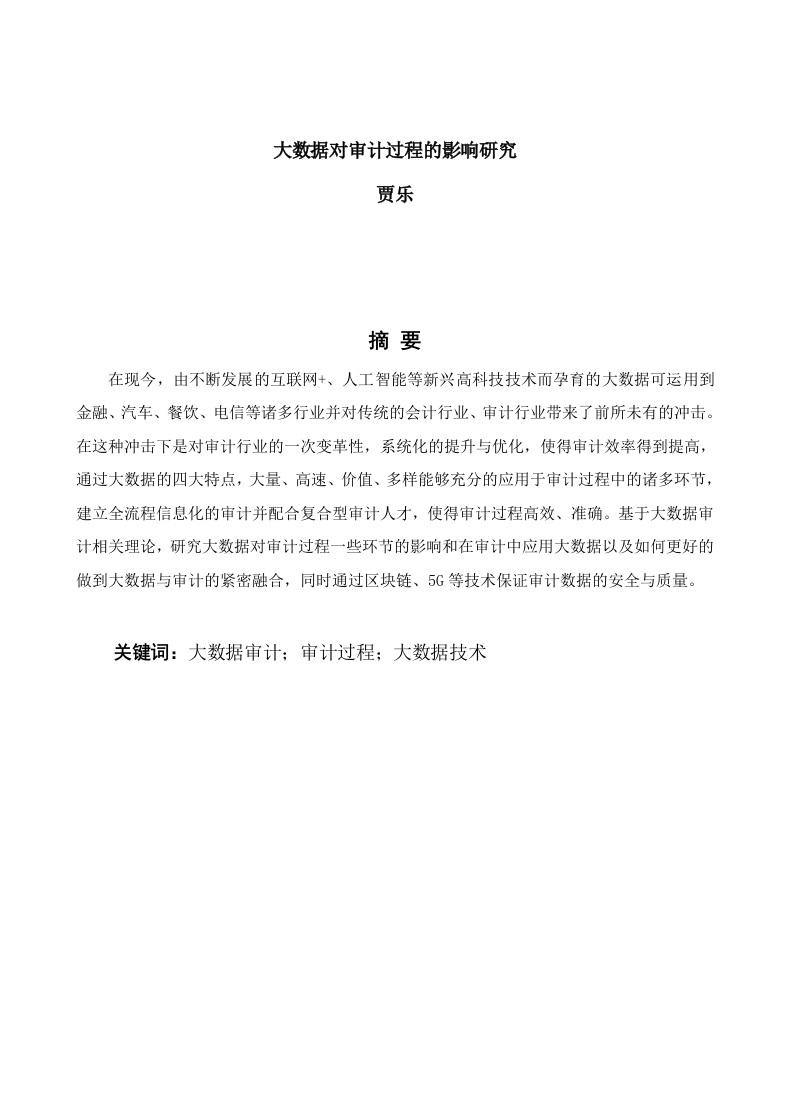 大数据对审计过程的影响研究贾乐摘要在现今,由不断发展的互联网+、人工智能等新兴高科技技术而孕育的大数据可运用到金融、汽车、餐饮、电信等诸多行业并对传统的会计行业、审计行业带来了前所未有的冲击。在这种冲击下是对审计行业的一次变革性,系统化的提升与优化,使得审计效率得到提高,通过大数据的四大特点,大量、高速、价值、多样能够充分的应用于审计过程中的诸多环节,建立全流程信息化的审计并配合复合型审计人才,使得审计过程高效、准确。基于大数据审计相关理论,研究大数据对审计过程一些环节的影响和在审计中应用大数据以及如何更好的做到大数据与审计的紧密融合,同时通过区块链、5G等技术保证审计数据的安全与质量。关键词:大数据审计:审计过程:大数据技术AbstractNowadays,Internet plus,AI and other new high-tech technologies have been applied to manyindustries,such as finance,automobile,catering,telecommunications,etc.,and have hithertounknown impact on traditional accounting and auditing industries.Under this kind of impact,it is arevolutionary and systematic improvement and optimization of the audit industry,which improvesthe audit efficiency.Through the four characteristics of big data,a large number of high-speed,value and diversity can be fully applied to many aspects of the audit process,and the establishmentof full process information-based audit and cooperation with composite audit talents,making theaudit process efficient and accurate.Based on the theory of big data audit,this paper studies theimpact of big data on some aspects of audit process,how to apply big data in audit and how tobetter integrate big data and audit.Key words:big data audit audit process big data technology目录1一、1(二)审计相关内容概述·2二、传统审计的缺陷与不足..…(一)对大量数据采集、解析有局限性(二)得到的分析结果有偏差....3三、大数据在审计下的应用.·(一)审计事前的应用..3(二)审计事中的应用...5(一)华必信会计事务所简介…6(二)事务所应用大数据对盛天网络技术股份有限公司进行审计.8五、大数据对审计影响的研究结论.11六、结论