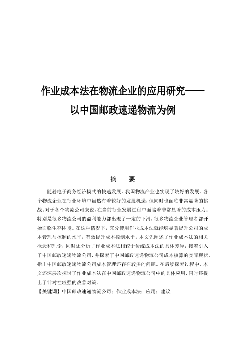 作业成本法在物流企业的应用研究一以中国邮政速递物流为例摘要随着电子商务经济模式的快速发展,我国物流产业也实现了较好的发展。各个物流企业在行业环境中虽然有着较好的发展机遇,但同时也面临非常显著的挑战。对于各个物流公司来说,在当前行业发展过程中面临着非常显著的成本压力。特别是很多物流公司的盈利能力都出现了一定的下滑,很多物流企业管理者都开始面临生存困境。在这种情况下,充分使用作业成本法就能够显著提升公司的成本管理与控制的水平,有效提升成本控制水平。本文先阐述了作业成本法的相关概念和理论,同时还分析了作业成本法相较于传统成本法的具体差异,接着引入了中国邮政速递物流公司,并探索了中国邮政速递物流公司成本核算的实际现状,指出中国邮政速递物流公司成本管理还存在较多的问题。在后续探索过程中,本文还深层次探讨了作业成本法在中国邮政速递物流公司中的具体应用,同时还提出了针对性较强的改善对策。【关键词】中国邮政速递物流公司:作业成本法:应用:建议AbstractWith the rapid development of e-commerce economic model,China's logisticsindustry has also achieved good development.Although each logistics enterprise hasgood development opportunities in the industry environment,it also faces significantchallenges.For each logistics company,in the current industry development process isfacing a very significant cost pressure.In particular,the profitability of many logisticscompanies has declined to a certain extent,and many managers of logisticsenterprises are beginning to face survival difficulties.In this case,the full use ofactivity-based costing can significantly improve the level of cost management andcontrol,and effectively improve the level of cost control.This paper first expoundsthe relevant concepts and theories of activity-based costing,at the same time analyzesthe specific differences between activity-based costing and traditional costing,thenintroduces China Post Express logistics company,and explores the actual situation ofcost accounting of post express logistics company,and points out that there are stillmany problems in cost management of China post express logistics company.In thefollow-up exploration process,this paper also discusses the application ofActivity-Based Costing in China Post Express logistics company,at the same time,italso puts forward targeted improvement measures.[Key words]China Post Express Logistics Company;Activity-Based Costing;Application;Suggestion目录1.1研究背景及意义.1.1.1研究背景1.1.2研究意义1.2国内外研究现状1.2.1国外研究现状.…1.2.2国内研究现状.…21.2.3研究评析…31.3本文研究思路与结构2作业成本法理论基础.…42.1作业成本法概念22作业成本法基本原理.52.3作业成本法与传统成本法的比较.…3中国邮政速递物流公司成本核算现状53.1中国邮政速递物流公司简介3.2中国邮政速递物流公司现行成本核算模式存在的问题.63.2.1成本归集不全面63.2.2间接成本分配不合理..63.2.3非增值作业比重较高.63.3中国邮政速递物流公司现行成本核算模式存在问题的原因分析.63.3.1资源与作业归集匹配度不高.3.3.2间接成本分配标准单一.73.3.3业务展开涉及了较多非必要作业.74作业成本法在中国邮政速递物流公司成本管理中的应用..74.1中国邮政速递物流公司使用作业成本法的必要性和可行性74.1.1中国邮政速递物流公司使用作业成本法的必要性4.1.2中国邮政速递物流公司使用作业成本法的可行性.84.2中国邮政速递物流公司物流成本分析4.2.1建立作业中心84.2.2界定资源消耗..8