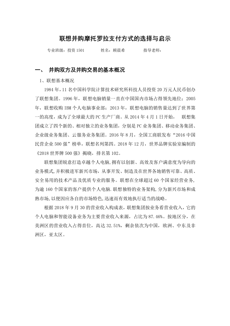 联想并购摩托罗拉支付方式的选择与启示专业班级:投资1501姓名:顾晨希指导老师:一、并购双方及并购交易的基本概况1、联想基本概况1984年,11名中国科学院计算技术研究所科技人员投资20万元人民币创办了联想集团。1996年,联想电脑销量一直在中国国内市场占得领先地位;2005年,联想收购IBM个人电脑事业部:2013年,联想电脑的销售量达到了世界第一的高度,成为了全球最大的PC生产厂商。从2014年4月1日开始,联想集团成立了四个新的、相对独立的业务集团,分别是PC业务集团、移动业务集团、企业级业务集团、云服务业务集团。2016年8月,全国工商联发布“2016中国民营企业500强”榜单,联想名列第四。2018年12月,世界品牌实验室编制的《2018世界牌500强》揭晓,排名第102。联想集团锐意打造卓越个人电脑,拥有以创新、高效及客户满意度为导向的业务模式,并积极进军新兴市场,从事开发、制造及在世界各地销售可靠、高质、安全易用的技术产品及优质专业的服务。联想在全球超过60个国家经营业务,为逾160个国家的客户提供个人电脑.联想独特的业务架构,分为新兴市场和成熟市场,以便因应各自的市场特色,迅速而有效地执行适当的战略。根据2018年9月30的营业收入构成表,联想集团按业务看营业收入,它的个人电脑和智能设备业务为主要营业收入来源,占比为87.46%。按地区分,在美洲区的营业收入占得首位,高达32.51%,剩余依次为中国,欧洲、中东及非洲区,亚太区。22.2截至二零一八年九月三十日止六个月,集团的总销售额约为252.93亿美元。期内权益持有人应占溢利约为2.45亿美元,较去年同期增加1.78亿美元。期内的毛利率较去年同期13.7%下降0.1百分点。每股基本盈利及每股摊薄盈利为2.06美仙,较去年同期增加1.45美仙。nn?0.1.30.0.010.80.2、摩托罗拉基本概况摩托罗拉成立于1928年,总部位于美国芝加哥,主要产品有通讯产品、网络产品、集成电子产品、软件等,企业在纽约证券交易所上市。摩托罗拉因在无线和宽带通讯领域的不断创新和领导地位而闻名世界,摩托罗拉和诺基亚以及爱立信并称为世界通信三巨头。摩托罗拉也是世界财富百强企业之一,拥有全球性的业务和影响力,2006年的销售额为428亿美元。公司旗下有三大业务集团,它们分别是企业移动解决方案部、宽带及移动网络事业部和移动终端事业部。作为一家老牌通信巨头,摩托罗拉在通信业的地位毋庸置疑,摩托罗拉发明第一款手机开始,摩托罗拉见证了迄今为止的整个手机发展史,摩托罗拉无线电应答器被用于阿波罗11号宇宙飞船。摩托罗拉一直引导时代的进步,从发明了无线电应答器,到全球第一款商用手机,第一款GSM数字手机,第一款双向式寻呼机,第一款智能手机,全球第一个无线路由器,以及著名的铱星计划等等。2011年8月15日,谷歌公司宣布将以每股40美元,总额约125亿美元的价格收购摩托罗拉移动。双方董事会现已全票通过该交易,2012年2月14日谷歌收购摩托罗拉获欧盟和美国批准。2012年5月19日中国商务部发布公告,正式批准了谷歌收购摩托罗拉移动,这桩全球最大手机厂商收购案跨过了最后一道门槛。3、并购交易基本情况2014年初,联想集团宣布以29.1亿美元的价格从谷歌手中买下摩托罗拉移动业务,收购资产包括3500名员工、2000项专利、品牌和注册商标。联想董事长兼CE0杨元庆将此次交易视为复制十年前成功的机会一一彼时联想收购了陷入亏损的IBM PC业务,随后将合并后的公司打造为全球最大PC制造商。然而,收购摩托罗拉已成为联想的败笔。在收购摩托罗拉两年后,联想在美国裁员数已超过2000人,在全球智能机市场的排名也从第三跌倒了最低时候的第8位。2016年5月,联想遭遇了自2009年以来的首次年度亏损,这与收购摩托罗拉有直接的关系。二、并购动因分析1、联想并购动因联想的PC业务下滑与全球P℃市场有关。近年全球P℃市场受智能手机冲击很大,联想在商用电脑及消费个人电脑销售均出现下滑:P℃市场已经饱和,竞争极度激烈。整个P℃市场在菱缩,联想也随之菱缩。