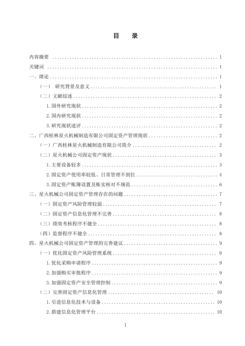 目录内容摘要。。。。。。。关键词一、绪论…(一)研究背景及意义11.国外研究现状.....二、广西桂林星火机械制造有限公司固定资产管理现状..2(一)广西桂林星火机械制造有限公司简介....232.固定资产使用率较低、日常管理不到位.…·46三、星火机械公司固定资产管理存在的问题..7(二)固定资产信息化管理不完普.....8四、星火机械公司固定资产管理的完善建议...(一)优化固定资产风险管理系统...91.优化采购申请程序3.加强固定资产安全管理控制...9(二)完善固定资产信息化管理...101.引进信息化技术与设备....10103.引进优秀的信息化管理人才.....10101.建立与固定资产核算相关的绩效考核机制102.加强固定资产全面登记…113.把固定资产项目情况作为绩效考核的指标11111.加强对于内部监督管理机制的建设....112.加强日常使用中的内部监督管理1111参考文献……13广西师范大学漓江学院2019届本科生毕业论文桂林星火机械制造有限公司固定资产管理专业:财务管理学号:201513005494学生姓名:何非凡指导老师:陈隆伟【内容摘要】固定资产管理作为企业内部管理的重要组成部分,对于企业整体的管理水平产生了很大的影响。目前很多的企业对于固定资产管理缺乏足够的重视,固定资产管理过程中存在很多的问题,影响了企业固定资产管理水平的进一步提升。文章对广西桂林星火机械制造有限公司的固定资产管理进行了研究。文章认为桂林星火机械制造有限公司的固定资产管理存在:固定资产风险管理较弱、固定资产信息化管理不完善、绩效考核程序不健全、监督程序不健全等问题:改进对策主要有:优化固定资产风险管理系统、完善固定资产信息化管理、建立完整的绩效考核程序、增强内部控制监督体系。希望能够帮助北流农村信用社提升固定资产的管理水平。【关键词】固定资产:固定资产管理:资产周转率一、绪论(一)研究背景及意义在企业的发展中固定资产管理属于重中之重,根据会计准则的定义,将固定资产周转率定义为企业对固定资产,例如,厂房、机械设备等销售的基本情况。杂这个过程中涉及到的固定资产周转率比例越高对企业的发展优势越大。但是在这个过程中涉及到的固定资产的考虑的因素是固定资产的净值,那么这个净值是企业固定资产扣除折旧后的数值,因此,这个因素也在一定程度上影响着企业固定资产的周转情况。从企业发展的实务反馈,企业中的固定资产由于规定和企业实际情况的差异,因此,固定资产的基本情况也存在一定的差异,并且由于很多的企业对资产周转率系数要求较高,往往出现固定资产改造的情况较少,综合考量固定资产的在企业中的基本情况,笔者认为,固定资产的周转率还是要根据企业发展情况而定,并且周转率需要一定的时期,因此,研究固定资产管理的完善对于企业发展而言较为重要。第1页共16页