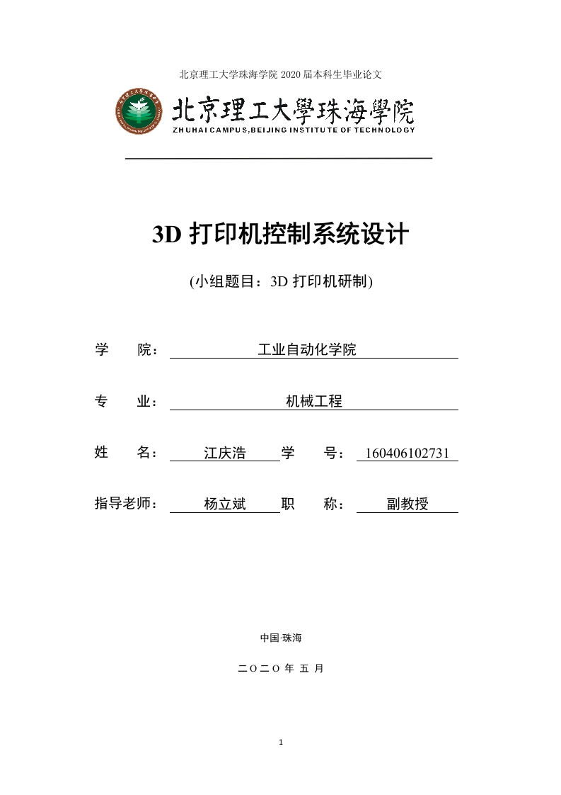 北京理工大学珠海学院2020届本科生毕业论文北京理工大學珠海學院3D打印机控制系统设计(小组题目:3D打印机研制)学工业自动化学院专业:机械工程姓名:江庆浩学号:160406102731指导老师:杨立斌职称:副教授中国珠海北京理工大学珠海学院2020届本科生毕业论文诚信承诺书本人郑重承诺:本人承诺递交的毕业设计《3D打印机控制系统设计》是在指导老师的指导下,通过独自探索,学习和研究取得的成果,文中引用他人的观点和材料,都已在文后按顺序列出其参考文献,设计使用的数据都是真实可靠的。本人签名:年月日3D打印机控制系统设计摘要3D打印技术是种增材快速成型技术,在创新产品的设计和制造中应用越来越广泛,其中的FDM(熔融堆积成型技术)3D打印机具有很多优点,包括打印过程方便,材料成本低,打印精度较高,打印速度快等。因此经过毕业设计小组筛选决定以FDM打印技术为出发点,设计研究一台FDM3D打印机。这次设计主要在两个大方面对打印机的控制系统进行优化,一是硬件控制电路优化,二是固件程序函数及上位机软件的参数优化。并利用了P℃端软件对打印机进行三维建模、硬件控制电路的仿真设计和切片软件及程序参数的调整。硬件方面。确定了打印机的主控器为ATmega2560-16AU单片机,利用其机内丰富资源设计相关控制模块电路。包括有最小系统电路、复位电路、USB串口通信电路、电源电路、限位开关检测电路、步进电机驱动电路、热敏电阻与MOS管驱动电路等,在每个模块电路上进行细致的设计优化,有效保证了打印机的工作稳定性。固件程序函数与上位机软件参数方面。利用arduinol.0.5软件对运动固件程序函数进行理论设计,主要是些影响打印运动精度的重要参数的改进。还利用上位机切片软件测试打印效果,判断对打印精度,速度和时长等的影响因素,结合实际作出最优打印数据调整。优化后的打印机具有更好的稳定性,打印速度和精度,可连续工作时间变长,连续打印过程中再也不需要过多调整。关键词:3D打印控制技术、熔融沉积制造、硬件电路控制、软件和程序控制3
