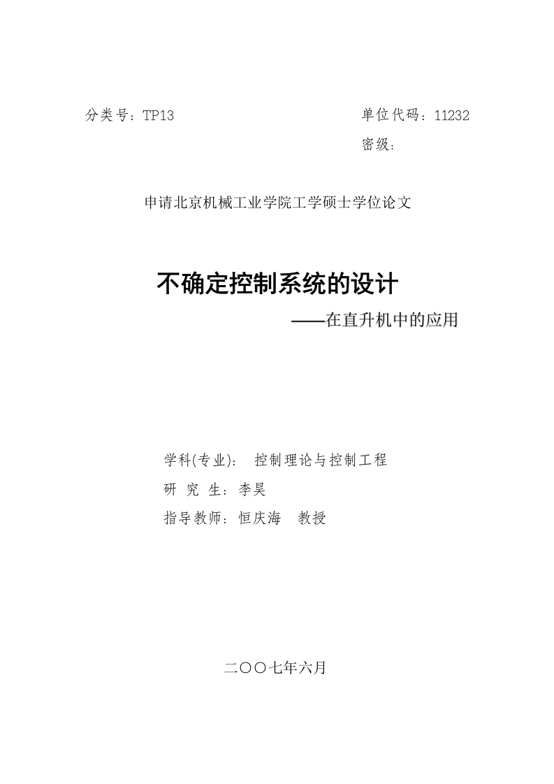 分类号:TP13单位代码:11232密级:申请北京机械工业学院工学硕士学位论文不确定控制系统的设计一在直升机中的应用学科(专业):控制理论与控制工程研究生:李昊指导教师:恒庆海教授学位论文版权使用授权书本人完全了解北京机械工业学院关于收集、保存、使用学位论文的规定,同意如下各项内容:按照学校要求提交学位论文的印刷本和电子版本:学校有权保存学位论文的印刷本和电子版,并采用影印、缩印、扫描、数字化或其它手段保存论文:学校有权提供目录检索以及提供本学位论文全文或者部分的阅览服务:学校有权按有关规定向国家有关部门或者机构送交论文的复印件和电子版:在不以赢利为目的的前提下,学校可以适当复制论文的部分或全部内容用于学术活动。学位论文作者签名:年月日经指导教师同意,本学位论文属于保密,在年解密后适用本授权书。指导教师签名:学位论文作者签名:年月日年月日硕士学位论文原创性声明本人郑重声明:所呈交的学位论文,是本人在导师指导下,进行研究工作所取得的成果。除文中己经注明引用的内容外,本学位论文的研究成果不包含任何他人创作的、己公开发表或者没有公开发表的作品的内容。对本论文所涉及的研究工作做出贡献的其他个人和集体,均已在文中以明确方式标明。本学位论文原创性声明的法律责任由本人承担。签名:年月日