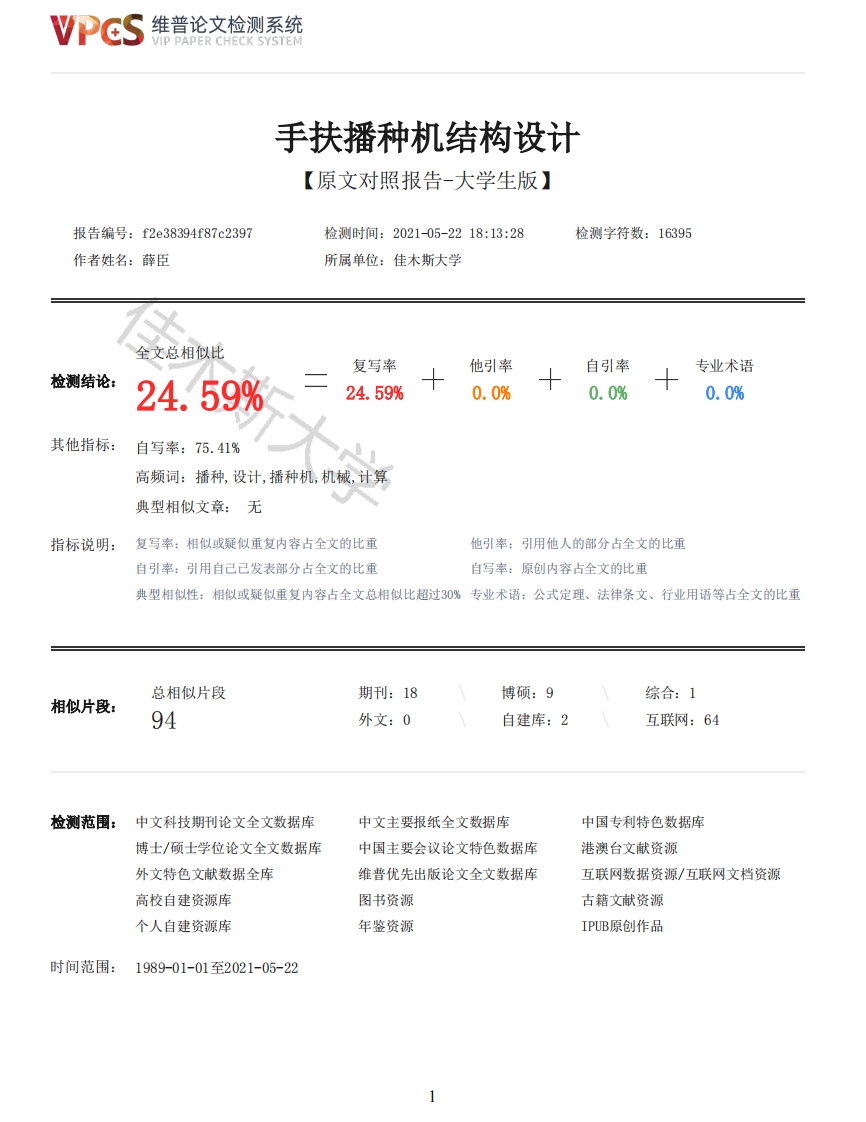 维普论文检测系统VIP PAPER CHECK SYSTEM手扶播种机结构设计【原文对照报告-大学生版】报告编号:f2e38394f87c2397检测时间:2021-05-2218:13:28检测字符数:16395作者姓名:薛臣所属单位:佳木斯大学全文总相似比复写率他引率自引率专业术语检测结论:24.59%24.59%0.0%0.0%0.0%其他指标:自写率:75.41%高频词:播种,设计,播种机,机械,计算典型相似文章:无指标说明:复写率:相似或疑似重复内容占全文的比重他引率:引用他人的部分占全文的比重自引率:引用自己已发表部分占全文的比重自写率:原创内容占全文的比重典型相似性:相似或疑似重复内容占全文总相似比超过30%专业术语:公式定理、法律条文、行业用语等占全文的比重总相似片段期刊:18博硕:9综合:1相似片段:94外文:0自建库:2互联网:64检测范围:中文科技期刊论文全文数据库中文主要报纸全文数据库中国专利特色数据库博士/硕士学位论文全文数据库中国主要会议论文特色数据库港澳台文献资源外文特色文献数据全库维普优先出版论文全文数据库互联网数据资源/互联网文档资源高校自建资源库图书资源古籍文献资源个人自建资源库年鉴资源IPUB原创作品时间范围:1989-01-01至2021-05-22维普论文检测系统VIP PAPER CHECK SYSTEM原文对照颜色标注说明:■自写片段■复写片段(相似或疑似重复)引用片段(引用)■专业术语(公式定理、法律条文、行业用语等)学术诚信承诺本人郑重声明:所呈交的论文是我个人在导师指导下进行的研究工作及取得研究成果。尽我所知,除了文中特别加以标注和致谢的地方外,论文中不包含其他人已经发表或撰写的研究成果,也不包含为获得佳木斯大学或其他教育机构的学位或证书所使用过的材料。与我一同工作的同志对本研究所做的任何贡献均已在论文中做了明确的说明并表示了谢意。签名:日期:关于论文使用授权的说明本人完全了解佳木斯大学有关保留、使用学位论文的规定,即:学校有权保留送交论文的复印件,允许论文被查阅和借阅:学校可以公布论文的全部或部分内容,可以采用影印、缩印或其他复制手段保存论文。签名:导师签名:日期:摘要随着我国科学技术的不断发展,农作物的生产水平越来越高,在农作物过程中,播种问题很重要。对于小型机的要求便会变得越来越重要,尤其是电力作为主要驱动装置。根据前人对播种机结构的研究,大部分播种机在运作时都需要人力辅助或者利用电机等配件驱动播种机,需要丰富的劳动力,双手不能得到解放,给人们带来繁重的劳作强度。同时,在人力或者电机驱动下播种机的运作效率较慢,严重影响工作进程。为了解决这个问题,本文设计了一款播种机,该播种机结构简单,工作可靠,非常适合家庭使用。本文首先对豆类播种机的一些配件进行了分析并进行了选择,并对总体传动方案进行了确定,最后对零件进行了设计并进行了强度校核,结果表明,该豆类播种机结构合理,效率高。关键词:豆类:播种机:强度校核AbstractWith the continuous development of science and technology in China,the production level ofcrops is getting higher and higher,and the problem of sowing is very important in the process ofcrops.The demand for minicomputers is even more important,especially for machinery powered byelectricity.According to the previous research on the structure of corn seeder,most of the seederneed human assistance or use the such as electric motor to drive the operation of the seeder,whichneeds rich labor force,hands can not be liberated,and brings heavy labor intensity to people.Inorder to solve this problem,this paper designs a small corn planter,which is simple in structure,reliable in work and suitable for family use,In this paper,some parts of the corn seeder areanalyzed and selected,and the overall transmission scheme is determined.Finally,the parts aredesigned and the strength is checked.The results show that the structure of the corn seeder isreasonable and the efficiency is high.Key Words:Corn:Drill:Strength:check目录2维普论文检测系统VIP PAPER CHECK SYSTEM摘要IAbstractII第1章绪论11.1本课题研究的目的及意义11.2播种机国内外研究现状1第2章设计方案的确定32.1动力方案选择32.2设计主要参数及机构类型确定32.2.1工作速度32.2.2播量的确定32.2.3种、肥箱的容积42.2.4排种、排肥机构设计42.2.5开沟机设计52.2.6覆土机设计62.3本章小结6第3章传动设计及播种技术措施73.1传动原理简图和动力传递路线73.1.1传动原理简图73.1.2动力传递路线图73.2传动原理73.3本章小结8第4章零部件设计94.1种箱及肥箱设计94.2开沟器设计及校核94.3排种器114.4地轮参数确定124.4.1轮子直径和轮辋宽度的确定124.4.2轮子滚动阻力计算124.5电机和电瓶选择及链轮设计124.5.1电机总功率确定124.5.2电动机及电瓶的选择134.5.3传动比确定144.5.4链轮选择及设计计算154.6地轮轴设计184.7键的校核224.8销的校核224.9轴承的校核234.10本章小结23结论24致谢25参考文献26附录127附录228不要删除行尾的分节符,此行不会被打印第1章绪论1.1本课题研究的目的及意义在我国现代农业生产中,播种机已经占据了十分重要的一个位置,它就是在相对较短的进行播种的农做时间3