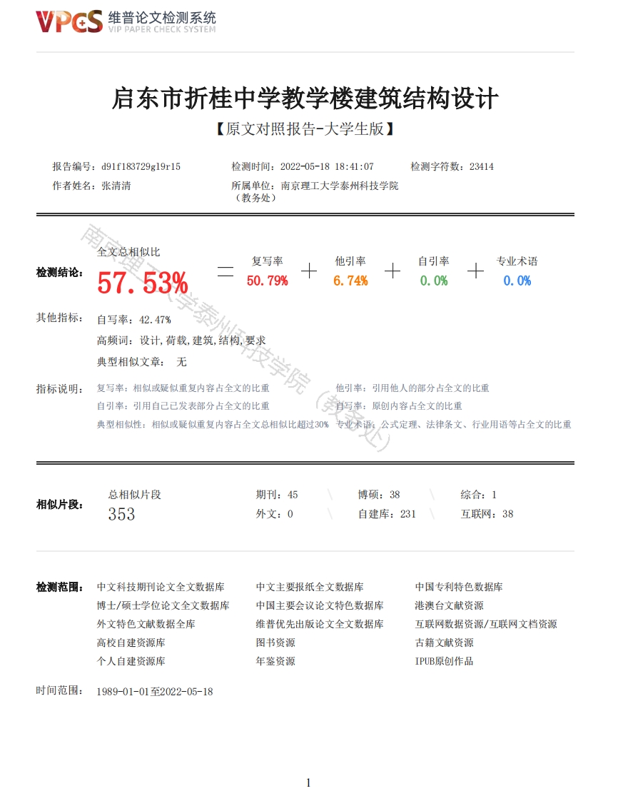 维普论文检测系统VIP PAPER CHECK SYSTEM启东市折桂中学教学楼建筑结构设计【原文对照报告-大学生版】报告编号:d91f183729g19r15检测时间:2022-05-1818:41:07检测字符数:23414作者姓名:张清清所属单位:南京理工大学泰州科技学院(教务处)全文总相似比复写率他引率自引率专业术语检测结论:57.53%50.79%6.74%0.0%0.0%其他指标:自写率:42.47%高频词:设计,荷载,建筑,结构,要求典型相似文章:无指标说明:复写率:相似或疑似重复内容占全文的比重院他引率:引用他人的部分占全文的比重自引率:引用自己已发表部分占全文的比重自写率:原创内容占全文的比重典型相似性:相似或疑似重复内容占全文总相似比超过30%专亚术语:公式定理、法律条文、行业用语等占全文的比重总相似片段期刊:45博硕:38综合:1相似片段:353外文:0自建库:231互联网:38检测范围:中文科技期刊论文全文数据库中文主要报纸全文数据库中国专利特色数据库博士/硕士学位论文全文数据库中国主要会议论文特色数据库港澳台文献资源外文特色文献数据全库维普优先出版论文全文数据库互联网数据资源/互联网文档资源高校自建资源库图书资源古籍文献资源个人自建资源库年鉴资源IPUB原创作品时间范围:1989-01-01至2022-05-18维普论文检测系统VIP PAPER CHECK SYSTEM原文对照颜色标注说明:■自写片段■复写片段(相似或疑似重复)口引用片段(引用)■专业术语(公式定理、法律条文、行业用语等)1绪论本次毕业设计是以启东市折桂中学教学楼为例,主要研究了框架结构如何进行建筑设计和结构设计。通过解决毕业设计中的一些工程实际问题,巩固基础知识和专业技能,锻炼查阅资料的能力,熟悉相关规范图集,同时可以熟练掌握用计算机来进行结构设计。在毕业设计中使用到AUTOCAD、PKPM等软件,加强了软件运用的能力,更加深刻的理解实际工程中的相关问题,为今后走上工作岗位打下扎实的基础。1.1结构体系的选择结构选型是一个综合性的科学问题,不仅要考虑各各结构类型适合的建筑范围,也要考虑结构上的安全合理,施工上的可能条件,还应从经济角度出发选取结构可行且经济的结构体系,另外根据建筑的使用功能,选择一个最佳的结构形式,往往需要进行多方面的调查研究,结合具体建设条件作出多种方案进行综合分析,再最终作出选定。目前,钢筋混凝土框架结构体系已经成为当今建筑设计时首选的结构体系。框架结构的优点是布置非常灵活,自重较轻,而且相比其他很多结构来说抗震性较好,但抗侧刚度较小。框架结构在学校建筑中广泛应用,本工程教学楼空间相对规整,是一个四层的建筑,考虑了这些因素以后再考虑到经济方面的要求,所以本建筑最终采用框架结构体系。1.2工程概况中学教育作为培养人才和增强民族创新能力的基础,受到各地政府和广大家长的高度关注。中学教育的投入不仅对本地区加快实现基础教育的现代化有着非常重要的作用,同时也是达成国家教育中长期发展战略的一项目标。经当地政府批准,投入建设折桂中学以满足教学需求。该工程名称为启东市折桂中学教学楼,位于江苏省启东市,建筑面积为6766.82左右,共3栋教学楼,建筑高度为16.4m,建筑结构安全等级为二级,设计使用年限为50年。经查询该地区抗震设防烈度为6度(0.05g),抗震设防分类为重点设防类,根据当地有关文件规定,本工程抗震设防设计烈度为7度(0.10g),抗震等级为二级,基本风压为0.5kN/m2,基本雪压0.2kN/m2。2启东市折桂中学教学楼建筑设计本工程教学楼主要作普通教学的教室用途。建筑应根据房间功能要求选择具体尺寸,同时要考虑当地的地质条件和结构选型等情况来合理选择建筑平面,公共建筑安全尤为重要,应结合设计规范合理设计。2.1建筑设计建筑功能是建筑的第一基本要素,在建筑中起决定性的作用,将直接影响建筑的构造形式、平面布局和组合、建筑体型等[1]。本毕业设计为中学教学楼设计,在采光、保温、隔热、散热和遮阳等方面的要求应符合国家现行有关建筑节能标准的规定。另外,教学楼需要容纳的人数较多,在满足教学需求的同时,应保证事故发生时,人员能够安全疏散,其设计规范参照相应国家标准。本毕业设计的建筑按照中学文教建筑的有关规范来进行设计。2.1.1建筑平面设计建筑平面设计是建筑设计中的重要一环,它反映了建筑内部各组成部分的横向分区特征和组织关系,以及建筑与外部环境的关系,建筑平面设计包括单个空间平面设计以及平面组合设计[1]。本毕业设计建筑层数为四层,具体2维普论文检测系统VIP PAPER CHECK SYSTEM的平面设计详见建施-03、建施-04、建施-05、建施06、建施-07。本工程建筑各楼层平面布置基本相同,主要作教学用途,由一条走廊贯通。另外在建筑左右两端分别设计了楼梯,两个楼梯能够在疏散时提供两个通道,有利于人员流通。各楼层卫生间设置在建筑左端,以满足通风等建筑需求。2.1.2建筑立面设计建筑立面设计应该考虑功能、材料、结构、环保、经济指标等要求,须符合建筑立面构图方面的规律性[2]。本工程建筑拥有良好的光照环境,满足日常通风和采光,具体的立面设计详见建施-08、建施-09。2.1.3建筑剖面设计建筑剖面设计主要是以建筑的用途和规模以及环境条件等作为设计的依据,以此设计建筑物的竖向结构的细节尺寸与构造做法。按照建筑物的使用功能和采光、通风等要求进