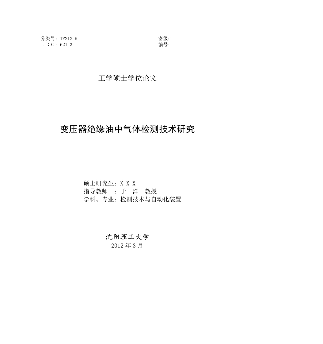 分类号:TP212.6密级:UDC:621.3编号:工学硕士学位论文变压器绝缘油中气体检测技术研究硕士研究生:XXX指导教师:于洋教授学科、专业:检测技术与自动化装置沈阳理工大学2012年3月分类号:TP212.6密级:UDC:621.3编号:工学硕士学位论文变压器绝缘油中气体检测技术研究硕士研究生:XXX指导教师:于洋教授学位级别:工学硕士学科、专业:检测技术与自动化装置所在单位:信息科学与工程学院论文提交日期:2011年12月论文答辩日期:2012年03月学位授予单位:沈阳理工大学