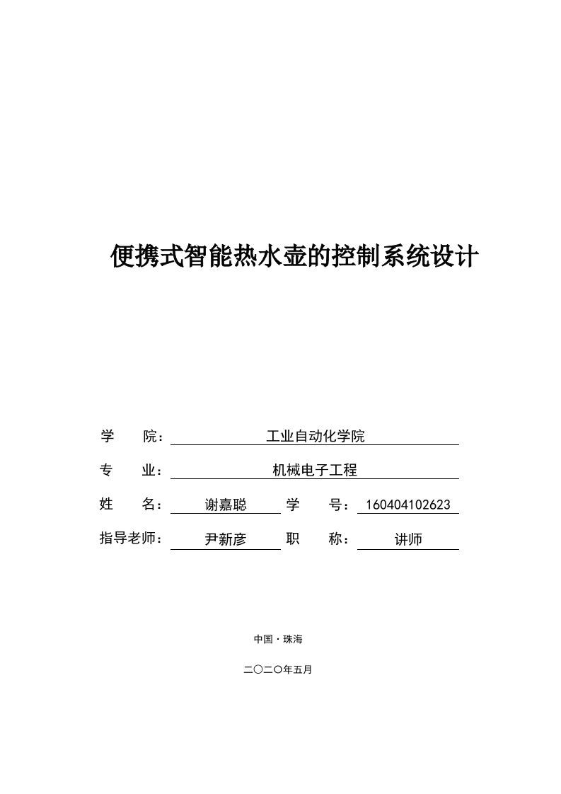 便携式智能热水壶的控制系统设计学院:工业自动化学院专业:机械电子工程姓名:谢嘉聪学160404102623指导老师:尹新彦职称:讲师中国·珠海北京理工大学珠海学院2020届本科生毕业设计诚信承诺书本人郑重承诺:本人承诺呈交的毕业设计《便携式智能热水壶的控制系统设计》是在指导教师的指导下,独立开展研究取得的成果,文中引用他人的观点和材料,均在文后按顺序列出其参考文献,设计使用的数据真实可靠。本人签名:日期:年月日北京理工大学珠海学院2020届本科生毕业设计智能加湿器的外观设计摘要本课题通过研究人们的需求、市场上空气处理设备的优势技术、空气处理设备的市场容量与分布,确定了加湿器的细分市场:通过分析加湿器的历史、现状、设计趋势,形成了方案设计,由相关专家进行方案评价,最终进行了详细设计。本设计融合先进技术,以加湿器的装饰性,运用人机工程学,设计心理学和美学原理进行造型设计。简约而不简单,操作方便宜人,让消费者处于一个良好的工作学习环境,提高舒适度。鉴于市场目前的现状,于是本毕业设计的目的就落在了日常加湿器功能以及方便性的改良,通过大胆的想法改变其些功能,使其别具一格:并且在外形上进行了较大胆的尝试,以水汽联想到海洋里的鲸鱼作为外形基础,将传统元素改变,抽象,提取其中精华,形成了这款外观可爱时尚的鲸鱼--一加湿器。在我国,加湿器并未广泛大量应用到人们生活中,在分析加湿器有关的文章之后,我认为加湿器在未来的发展中将对人们的生活起到很大促进作用。这样一个非常有价值的课题成为我选题的重要原因。关键词:加湿器,加湿原理,人机工程分析,造型设计