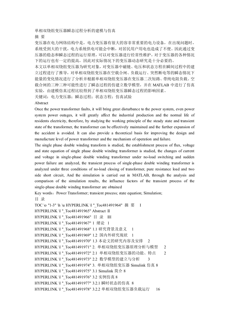 单相双绕组变压器瞬态过程分析的建模与仿真摘要变压器在电力网络结构中是,电力变压器有很大的容非常重要的电力设备,在出现问题时,系统受到大的干扰,电力系统供电可能会中断,对居民用户用电也造成了不便。因此通过变压器的稳态和瞬态过程的运行原理,可以对变压器进行经常性维护,对于变压器的各种情况下的运行也有一定的提高,因此对实际情况下的变压器动态研究是十分必要的。本文以单相双绕组变压器为研究对象,对变压器中磁链、电压和状态方程在瞬间过程中的建立过程进行了推导,对单相双绕组变压器在空载合闸、负载运行、突然新电等的瞬态情况下能量的变化情况进行了分析并根据单相双绕组变压器在变压器二次短路、带纯电阻负载、空载合闸的三种三种可能性进行了瞬态过程的仿建立数学模型,并在MATLAB中进行了仿真实验,由建模仿真过程比较得到了单相双绕组变压器瞬态过程的影响因素。关键词:电力变压器:瞬态过程:状态方程:仿真试验AbstractOnce the power transformer faults,it will bring great disturbance to the power system,even powersystem power outages,it will greatly affect the industrial production and the normal life ofresidents electricity,therefore,by studying the working principle of the steady state and transientstate of the transformer,the transformer can be effectively maintained and the further expansion ofthe accident is avoided.It can also provide a theoretical basis for improving the design andmanufacture level of power transformer and the mechanism of operation and failure.The single phase double winding transform is studied,the establishment process of flux,voltageand state equation of single phase double winding transformer is studied,the changes of currentand voltage in single-phase double winding transformer under no-load switching and suddenpower failure are analyzed,the transient process of single-phase double winding transformer isanalyzed under three conditions of no-load closing of transformer,pure resistance load and twoside short circuit,And the simulation is carried out in MATLAB,through the analysis andcomparison of the simulation results,the influence factors of the transient process of thesingle-phase double winding transformer are obtainedKey words:Power Transformer;transient process;state equation;Simulation;目录TOCo"1-3"h u HYPERLINK1"Toc481491964"摘要IHYPERLINK N"Toc481491965"Abstract IIHYPERLINK1"Toc481491966"目录IHYPERLINK1"Toc481491967"1绪论1HYPERLINK1"Toc481491968"1.1研究背景及意义HYPERLINK1"Toc481491969"1.2国内外研究现状1HYPERLINK1"Toc481491970"13本论文的研究内容及安排2HYPERLINK1"ToC481491971"2.单相双绕组变压器原理分析与模型2HYPERLINK1"Toc481491972"2.1单相双绕组变压器的功能、特点2HYPERLINK1"Toc481491973"2.2数学模型的建立与分析3HYPERLINK1"Toc481491974"3.单相双绕组变压器Simulink仿真8HYPERLINK1"Toc481491975"3.1 Simulink简介8HYPERLINK1"Toc481491976"3.2实例仿真8HYPERLINK1"Toc481491977"3.2.1瞬时状态的仿真8HYPERLINK1"Toc481491978"3.2.2单相双绕组变压器负载运行16HYPERLINK1"Toc481491979"结论23HYPERLINK1"Toc481491980"参考文献24HYPERLINK1"Toc481491981"致谢251绪论1.1研究背景及意义这些年以来,各界对电力的需求越来越高,电力网络的发展势在必行[1]。对电力供给侧的增长,由于中国的快速发展电力系统并列运行可以适合愈来愈大的电能需求侧,在电力系统中,变压器占有非常重要的地位,能否将电能优质传递到客户端有着非常大的关系。所以变压器保持正常运行对电力系统至关重要。电力变压器一且发生故障,会给电力系统带来很大扰动,相当严重的后果是造成一级用电设备停电,因此,暂态分析在变压器运行过程中是十分必要的。电力系统供电可能会中断,对居民用户用电也造成了不便。因此通过变压器的稳态和瞬态过程的运行原理,可以对变压器进行经常性维护,对于变压器的各种情况下的运行也有一定的提高[2]。本文以单相双绕组变压器磁链、电压和状态方程在暂态情况下建立不同的方程组,分析了这种变压器在空载合闸、突然断电等的瞬态情况下能量的变化情况进行了分析并根据单相双绕组变压器在变压器二次短路、带纯电阻负载、空载合闸的三种可能性进行了瞬态过程的仿建立数学模型,并在将仿真实验在MATLAB中设计进行,由建模仿真过程比较得到了单相双绕组变压器瞬态过程的影响因素。12国内外研究现状在电力计算机上对电力网络的运行进行数学计算并且进行模拟仿真是数字模拟仿真,"关于对数字仿真的建立一股情况下分为三个步骤:对元件进行一定的建立,对数学模型惊醒一定的建立,根据元器件的建立以及数字模型的建立进行最终的仿真模拟,由于研究目的不尽相同,所以对于研究模型的要求也不尽相同[3]。短路时电流会突然增大,断线时电压会突然增大,这种情况下可以采用电磁暂态的方式进行研究。电压和电流的剧烈变化会引起电磁的改变在很早的时候就被发现了,科技在快速增长,在20世纪70年代末以后对于变压器的研究变得越来越多,变压器中的一种双绕组变压器变得尤为重要,有两种方法进行仿真:经变压器磁链方程进行求解未知数,根据仿真元件进行仿真分析未知电气因数"第一种比较麻烦需要大量的计算,第二种比较难需要构建模型[4)。"用于研究电力系统暂态过程的数字仿真软件有很多:德国西门子的NETOMAC,加拿大Manitoba直流研究中心的PSCAD(EMTDC,加拿大哥伦比亚大学的MICroTran,美国Mathwork有限公司的MATLAB的Power System Blockset,和挪威的SINTEF