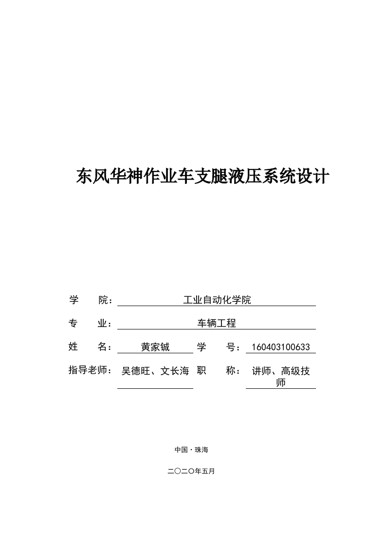 东风华神作业车支腿液压系统设计学院:工业自动化学院专业:车辆工程姓名:黄家铖学号:160403100633指导老师:吴德旺、文长海职称:讲师、高级技师中国·珠海北京理工大学珠海学院2020届本科生毕业设计诚信承诺书本人郑重承诺:本人承诺呈交的毕业设计《东风华神作业车支腿液压系统设计》是在指导教师的指导下,独立开展研究取得的成果,文中引用他人的观点和材料,均在文后按顺序列出其参考文献,设计使用的数据真实可靠。本人签名:日期:年月日北京理工大学珠海学院2020届本科生毕业设计东风华神作业车支腿液压系统设计摘要液压支腿是工程机械重要机构,其中汽车起重机最具有代表性。汽车起重机具有较高的灵活性,且操作方便,其主要作用是将物体举生在需要的位置,在国家基础建设中起到重要作用。本文主要针对东风华神作业车,设计支腿液压系统,可以将车辆平稳举起,起到支撑,分散重力,提供稳固的工作平台等作用。其中包括两部分,支腿结构部分设计和支腿液压系统设计。熟悉车辆基本参数,对比各类支腿优缺点,确定液压支腿的选型,计算支腿在极端状态下的受力分析,分析三点支撑的压力计算,确定支腿的结构尺寸,利用CATIA、CAD等软件构建支腿的三维模型,并分析算主要零部件的强度、刚度及性能参数的计算:在液压部分,需要根据其工作压力确定液压缸的尺寸,分析三点支撑时的压力计算,并计算液压缸强度、刚度,液压回路的设计等。关键词:支腿液压:支腿结构:三点支撑:液压回路:液压缸