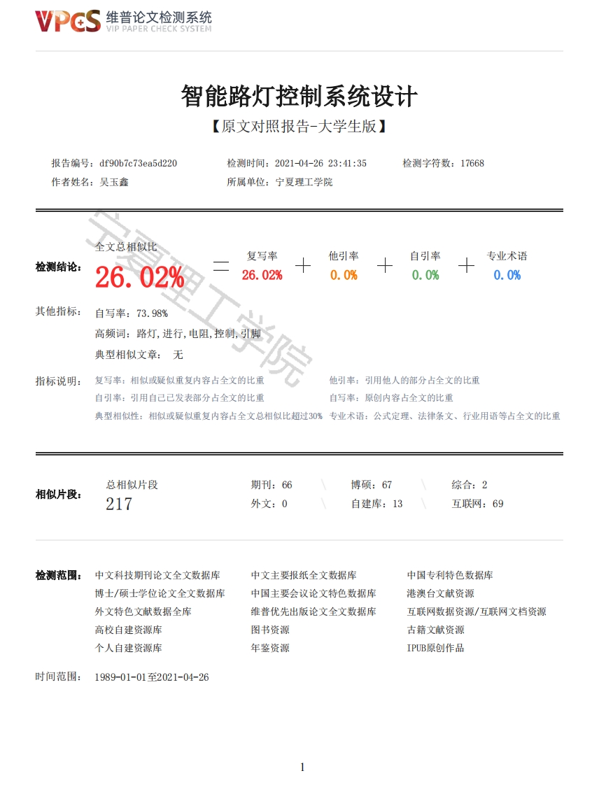 维普论文检测系统VIP PAPER CHECK SYSTEM智能路灯控制系统设计【原文对照报告-大学生版】报告编号:df90b7c73ea5d220检测时间:2021-04-2623:41:35检测字符数:17668作者姓名:吴玉鑫所属单位:宁夏理工学院全文总相似比复写率他引率自引率专业术语检测结论:26.02%26.02%0.0%0.0%0.0%其他指标:自写率:73.98%高频词:路灯,进行,电阻,控制,引脚典型相似文章:无指标说明:复写率:相似或疑似重复内容占全文的比重他引率:引用他人的部分占全文的比重自引率:引用自己已发表部分占全文的比重自写率:原创内容占全文的比重典型相似性:相似或疑似重复内容占全文总相似比超过30%专业术语:公式定理、法律条文、行业用语等占全文的比重总相似片段期刊:66博硕:67综合:2相似片段:217外文:0自建库:13互联网:69检测范围:中文科技期刊论文全文数据库中文主要报纸全文数据库中国专利特色数据库博士/硕士学位论文全文数据库中国主要会议论文特色数据库港澳台文献资源外文特色文献数据全库维普优先出版论文全文数据库互联网数据资源/互联网文档资源高校自建资源库图书资源古籍文献资源个人自建资源库年鉴资源IPUB原创作品时间范围:1989-01-01至2021-04-26维普论文检测系统VIP PAPER CHECK SYSTEM原文对照颜色标注说明:■自写片段■复写片段(相似或疑似重复)口引用片段(引用)■专业术语(公式定理、法律条文、行业用语等)摘要:在现今的日常生活中,路灯作为我们随时可见的基础设施,@是人类社会不可或缺的一部分,本文针对近代路灯控制系统因设计原因造成能源利用率不高所造成的大量能源浪费问题,运用了现代化传感器与元器件以自控系统为设计原理,提出了以DS1302芯片实现路灯到时到点自动控制亮灭,以光敏电阻实现因阴天日蚀等特殊原因造成的天色变暗问题,以红外传感器实现天黑状态下任在路面移动的人和车辆进行大致感知以达到路灯的精确管控的观点。在proteus软件模拟仿真实验中成功验证设计,解决了近代路灯控制系统因为设计造成的大量能源浪费,实验结论可使路灯能源节约达到百分之四十关键字:自动控制、节能、传感器AbstractIn today's daily life,street lights,as an infrastructure we can see at any time,are anintegral part of human society,In this paper,in view of the large amount of energy waste caused by the low energy utilizationrate caused by the design of modern street lamp control system,the paper proposes that the DS1302chip is used to realize the automatic control of the light on and off at the time of the time,andthe light resistance to realize the problem of the dark sky caused by the sun eclipse and otherspecial reasons,The infrared sensor is used to realize the perception of people and vehicles movingon the road in the dark state to achieve the accurate control of street lights.The design wassuccessfully verified in Proteus simulation experiment,which solved the waste of energy caused bythe design of modern street lamp control system.The experimental results can save 40%of the energyof street lampKeywords:automatic control,energy saving,sensor第1章前言1.1背景随着我国社会的发展经济的繁荣和物质生活水平的提高,人民群众对于平时的生活环境与公共基础建设要求也同步提高,城市的照明系统作为城市规划管理与基础建设中的一项重要设施,不仅可以在夜里提供照明功能维护公共秩序为人民提供便捷的服务,同时也可以起到美化城市形象鼓舞民众信心的一项重要设施。照明系统作为城市形象的重要设施,而城市的形象作为城市对吸引外来人口资源吸的重要措施,近几年来全国各大城市和一些中小城市的许多领导,都对城市照明系统表现出了格外关注,在大量资金的投入建设下使得城市的夜晚越发璀璨绚丽,但随之而来的问题也越发严重,比如新增的大量城市路灯造成的维护费用大量增加与维护人员数量的不足,能源消耗的大量增加造成电费支出激增,政府财政比重增加,光污染与资源浪费等问题…这些问题的出现对于各市的路灯管理部门无疑产生了巨大的工作负担,对于这些问题我们应该尽快积极解决,况且当今世界气候环境越发不稳定,各种恶劣天气发生次数日益增长的形势下,对于低碳节能环保的事项我们更应加强关注。旧式的路灯控制系统因为当时技术的限制,所以存在着能耗大,资源利用率低下,控制方法不便捷等情况。而2维普论文检测系统VIP PAPER CHECK SYSTEM今随着科技的发展电子技术与单片机技术在各行各业中的普及应用,新型的智能路灯控制系统层出不穷的出现的情况下,对城市路灯进行全面升级计划一直都在紧锣密鼓的进行中,智能路灯控制系统不仅降低了成本,而且可以高效的对路灯进行施行实时控制,而且因为带有一定自动控制原理,所以对于人力成本也有一定幅度的降低。普及智能路灯控制系统不仅可以节约社会资源降低资源浪费,还对城市形象有着积极的推动作用。早在2000年由建设部,国家发改委,国家质量监督局统一下发的223号文件《关于进一步推进“中国绿色照明工程“的意见》作为通告,并在2004年北京上海天津重庆等城市进一步提出实施《节约能源--城市绿色照明示范工程》的通知,要为了落实科学的发展观,指导城市照明工作健康发展,进一步提高我国城市照明的总体水平,按照推进《中国绿色照明工程促进项目》的要求,将实施《节约能源-一城市绿色照明示范工程》。城市绿色照明的基本宗旨是:节约能源、保护环境和促进健康:主要目