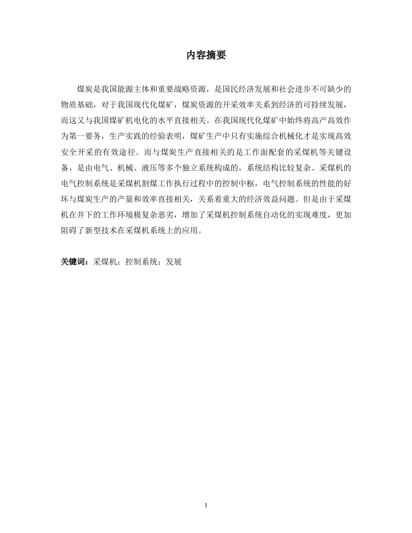 内容摘要煤炭是我国能源主体和重要战略资源,是国民经济发展和社会进步不可缺少的物质基础,对于我国现代化煤矿,煤炭资源的开采效率关系到经济的可持续发展,而这又与我国煤矿机电化的水平直接相关。在我国现代化煤矿中始终将高产高效作为第一要务,生产实践的经验表明,煤矿生产中只有实施综合机械化才是实现高效安全开采的有效途径。而与煤炭生产直接相关的是工作面配套的采煤机等关键设备,是由电气、机械、液压等多个独立系统构成的,系统结构比较复杂。采煤机的电气控制系统是采煤机割煤工作执行过程中的控制中枢,电气控制系统的性能的好坏与煤炭生产的产量和效率直接相关,关系着重大的经济效益问题。但是由于采煤机在井下的工作环境极复杂恶劣,增加了采煤机控制系统自动化的实现难度,更加阻碍了新型技术在采煤机系统上的应用。关键词:采煤机:控制系统:发展Abstractcoal is China's main energy and an important strategic resource,is the developmentof the national economy and social progress indispensable material base for themodernization of our country,coal mine,the coal resources mining efficiency related tosustainable economic development,which in turn and China Coal Mine Electrical andmechanical changes directly related to the level of.In our country modernization coalmine will always high yield and high efficiency as the first priority,the productionpractice experience shows,coal production only implement comprehensivemechanization to achieve efficient and safe mining an effective way.With the coalproduction is directly related to the work surface supporting the mining machine andother key equipment,electrical,mechanical,hydraulic pressure is provided by multipleindependent system structure,system structure is more complicated.Shearer electriccontrol system of coal mining machine cutting coal is in the process of implementing thecontrol center,electrical control system 's performance with coal production andefficiency are direct and relevant,relations with the major problem of economic benefits.But as a result of coal mining machine in underground working environment very harsh,increase mining machine control system automation realization difficulty,more hinderedthe new technology in coal mining machine system application.Key words:coal mining machine;control system;the development of目录II一、中国采煤机现状.·1二、采煤机电气控制系统应用(一)采煤机控制系统结构特点(二)采煤机电气控制系统特殊要求(三)采煤机控制系统的抗干扰技术..,1、采煤机电控系统的抗干扰技术..32、采煤机电控系统的可靠性..3三、虚拟样机与协同仿真技术...4(一)虚拟样机技术及其发展概况(二)虚拟样机技术研究与应用概况.1.虚拟原型555(三)基于接口的多领域协同仿真.·1、基于接口的多领域建模方法66(四)基于虚拟样机与协同仿真技术的商品化软件一一MSC.ADAMS.....7四、102采煤机的整体设计....(一)采煤机结构框架(二)主控部分的具体功能实现882、控制部分..93、变频器.99