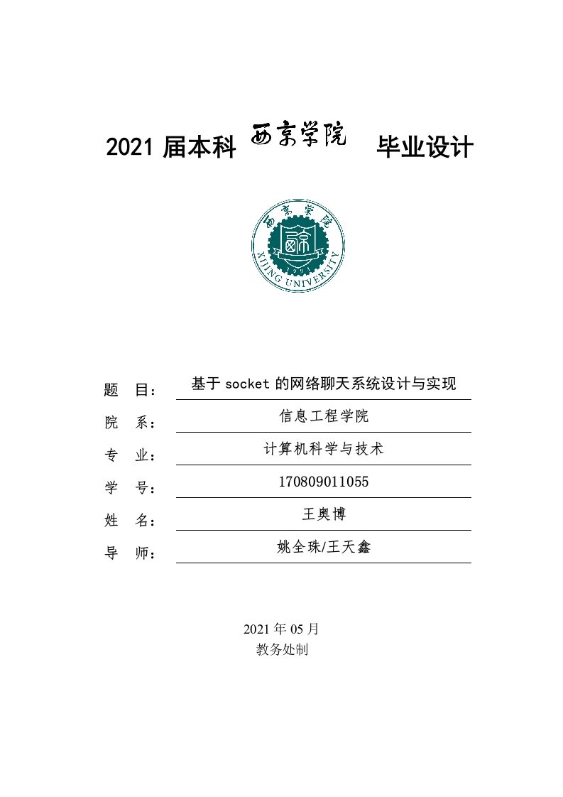 毕业设计题目:基于socket的网络聊天系统设计与实现院系:信息工程学院专业:计算机科学与技术学号:170809011055姓名:王奥博导师:姚全珠/王天鑫2021年05月教务处制声明西京学院原创性声明本人郑重声明:本人所呈交的毕业设计(论文),是在导师的指导下独立进行研究所取得的成果。毕业设计(论文)中凡引用他人己经发表或未发表的成果、数据、观点等,均己明确注明出处。除文中己经注明引用的内容外,不包含任何其他个人或集体已经发表或在网上发表的论文。特此声明。论文作者签名:指导教师签名:日期:摘要摘要随着Internet的飞速发展,随着操作简单,便利性和隐私的优点,在线聊天已迅速发展成最常见的网络通信方式之一。开发可以进行局域网聊天传输文件的软件具有重要的应用价值。本次研究设计的网络聊天系统基于.Net程序设计,以Client/Server为开发模式,以VS2019为开发环境。这个服务器是由客户端跟服务器端两个部分组成的,服务器端负责接收客户端发过来的用户的信息,并进行处理:客户端则主要负责注册,登录以及用户之间的聊天和对文件进行传输。系统不仅实现了点对点的聊天,并且使用C#所提供的socket类数据包和其他功能,使得多个程序可以同时运行,实现了多点对多点的聊天。程序开发的完成后,可以在局域网聊天市场中使用。总之,该聊天系统具有开放性,实时性,系统开发完成后可以用于后续的课程实验,更方便的与他人进行沟通。提高局域网办公的效率,提高企业的运转速度,所以此课题的研究在实际生产活动中具有重要的价值。关键词:Socket编程,网络聊天,NET程序设计