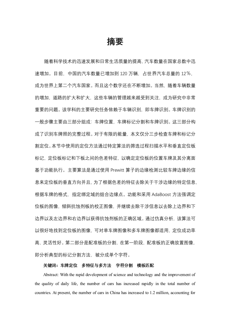 摘要随着科学技术的迅速发展和日常生活质量的提高,汽车数量在国家总数中迅速增加。目前,中国的汽车数量已增加到120万辆,占世界汽车总量的12%,成为世界上第二个汽车国家。而且这个数字还在不断增加。当然,随着车辆数量的增加,道路的扩大和扩大,这些车辆的管理越来越受到关注,成为研究中非常重要的问题。该学科的主要研究任务依赖于车辆识别,即车牌识别。车牌识别的一般步骤主要由三部分组成:车牌位置,车牌标记分割和车牌识别。这三部分构成了识别车牌照的完整过程。对于有限的能量,本文仅分三步检查车牌和标记分割定位。本节中使用的定位方法通过特定算法的筛选过程扫描水平和垂直定位板标记,定位板标记和下板之间的色差特征,以确定定位板的位置车牌及其分离面基于功能执行。主要算法是通过使用Prewitt算子的边缘检测比较车牌边缘的信息来定位板的垂直方向并且,为了根据色差的特征去除关于干涉边缘的特定信息,根据车牌的格式,指定绑定域的组合边缘点。功能和采用AdaBoost方法强调定位板的图像,倾斜抗蚀剂板的校正图像,并继续去除干涉信息以去除上边界和下边界以及左边界和右边界以获得抗蚀剂板的正确区域。通过仿真分析,该算法可以很好地找到定位板的图像,可对单车牌图像和多车牌图像都适用,定位成功率高,灵活性好。第二部分是配准板的分割,在第一阶段,配准板的正确放置图像,即分析典型的标记分割方法,被分成单个字符。关键词:车牌定位多特征与多方法字符分割模板匹配Abstract:With the rapid development of science and technology and the improvement ofthe quality of daily life,the number of cars has increased rapidly in the total number ofcountries.At present,the number of cars in China has increased to 1.2 million,accounting for12%of the world's total car,becoming the second car country in the world.And this numberis still increasing.Of course,with the increase in the number of vehicles and the expansionand expansion of roads,the management of these vehicles has received increasing attentionand become a very important issue in research.The main research task of the discipline relieson vehicle identification,ie license plate recognition.The general steps of license platerecognition are mainly composed of three parts:license plate position,license plate marksegmentation and license plate recognition.These three parts constitute the complete processof identifying the license plate.For limited energy,this article only examines the license plateand marker segmentation in three steps.The positioning method used in this section scans thehorizontal and vertical positioning plate marks by a specific algorithm's screening process,and locates the color difference characteristics between the plate mark and the lower plate todetermine the position of the positioning plate and its separation surface based on functionexecution.The main algorithm is to locate the vertical direction of the board by comparing theinformation of the edge of the license plate using the edge detection of the Prewitt operatorand,in order to remove the specific information about the interference edge according to thefeature of the color difference,specify the combined edge point of the binding domainaccording to the format of the license plate..Function and use the AdaBoost method toemphasize the image of the positioning plate,tilt the corrected image of the resist plate,andcontinue to remove the interference information to remove the upper and lower boundariesand the left and right boundaries to obtain the correct area of the resist plate.Throughsimulation analysis,the algorithm can find the image of the positioning plate well,and it canbe applied to both the license plate image and the multi-license plate image.The positioningsuccess rate is high and the flexibility is good.The second part is the division of theregistration plate.In the first stage,the correct placement of the image of the registration plate,ie the analysis of the typical mark segmentation method,is divided into individual characters.Keywords:license plate location,multiple features and multiple methods,charactersegmentation,template matching目录1.1本文的背景及意义.31.2车牌识别的国内外研究动向.31.3国内车牌的特征5第二章几种车牌定位方法简析.72.1依据灰度图像的车牌定位…2.1.1依据边缘检测进行车牌定位82.1.2依据车牌纹理特点的定位方法102.1.3依据形态学定位方法…112.2依据彩色图像进行车牌定位…第三章基于多特征与多方法筛选的车牌定位,3.1本文车牌定位步骤.43.1.1预处理灰度化153.1.2使用小波变换滤波…3.1.3边缘检测凸显细节特征…3.2倾斜校正与边缘修整.…203.3本文定位算法分析…3.4本章小结122第四章基于MATLAB的车牌识别233.1 MATLAB简介233.2设计方案3.3图像的边缘检测…3,4车牌定位和分割…273.5字符的识别…29第五章总结与展望…325,1论文总结…325,2工作展望32致谢33参考文献.3435第一章绪论1.1本文的背景及意义随着科学技术的飞速发展和社会生活水平的不断提高,世界交通运输业的发展也取得了长足的发展。人们在车到达之前走路和骑马。旅行的时间是时间。汽