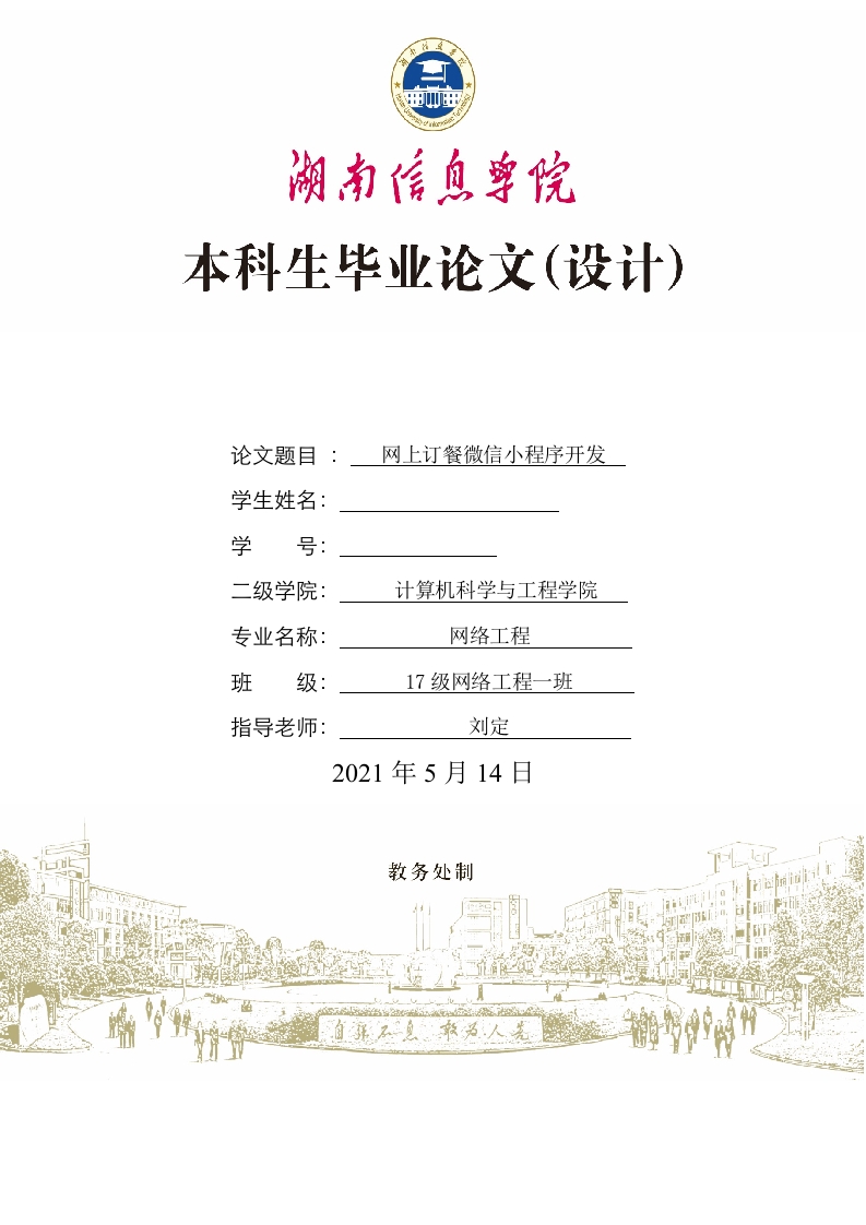本科生毕业论文(设计)论文题目:网上订餐微信小程序开发学生姓名:学二级学院:计算机科学与工程学院专业名称:网络工程班级:17级网络工程一班指导老师:刘定2021年5月14日教务处制湖南信息学院毕业论文(设计)诚信声明本人声明:所呈交的本科毕业论文(设计),是本人在指导老师的指导下,独立开展工作所取得的成果,成果不存在知识产权争议,除文中已经注明引用的内容外,本论文不含任何其他个人或集体已经发表或创作过的作品成果。对本文工作做出重要贡献的个人和集体均已在文中以明确方式标明。本人完全意识到本声明的法律结果由本人承担。本科毕业论文(设计)作者签名:年月日