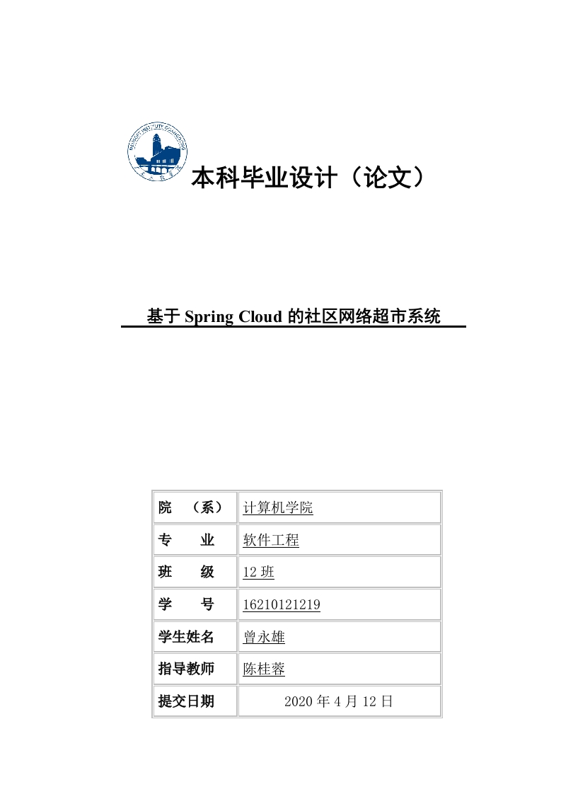 本科毕业设计(论文)基于Spring Cloud的社区网络超市系统院(系)计算机学院专业软件工程班级12班学号16210121219学生姓名曾永雄指导教师陈桂蓉提交日期2020年4月12日内容摘要在21世纪的今天,互联网已经在我国蓬勃发展,已经开始改变国人传统的生活方式,接触使用互联网的人也越来越多,尤其在年轻一代较为普遍。年轻人也更容易接受新生事物,无论是外卖软件还是购物软件,消费主力从来都是年轻人。但外卖软件包含着太多不确定因素了,最大一不确定因素就是食品安全问题。互联网时代越来越多不为人知的内幕也更容易被人们知道。不断曝光的不干净的外卖制作视频让人们心惊胆战,越来越不敢随便点外卖了。但年轻人总究要解决吃的问题,但又没有像长这么多时间来买菜做饭。所以社区网络超市发现了该需求,其迎合年轻人的生活消费观念方式,将实体超市与互联网平台结合,目的为了解决以年轻人为主的不想出门送货到家、有质量保证的购物需求。关键字:本地生活服务网上超市送货上门AbstractIn the 21st century,the Internet has developed vigorously in China,andit has begun to change the traditional way of life of the Chinese people.Moreand more people are exposed to the Internet,especially in the youngergeneration.Young people are also more receptive to new things.Whether itis takeaway software or shopping software,the main consumer is alwaysyoung people.But takeaway software contains too many uncertainties.Thebiggest uncertainty is food safety.In the Internet era,more and moreunknown insiders are also easier to be known.The unexplained takeawayproduction video that keeps being exposed makes people frightened,moreand more afraid to order takeaway casually.But young people have to solvethe problem of eating,but they don't have to spend so much time shoppingand cooking.Therefore,the community network supermarket found thisdemand,which caters to the lifestyle consumption concept of young people,and combines a physical supermarket with an Internet platform.The purposeis to solve the shopping needs of young people who do not want to go homeand have quality assurance.Key Words:Local Life Services Online Supermarket Home Delivery