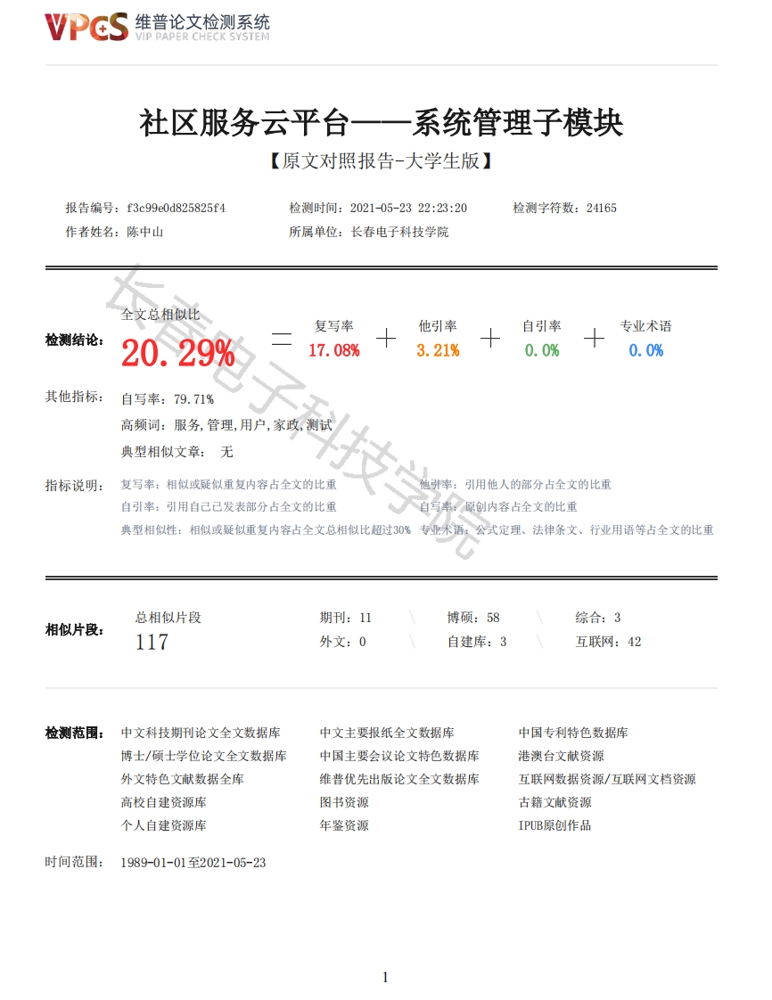维普论文检测系统VIP PAPER CHECK SYSTEM社区服务云平台一一系统管理子模块【原文对照报告-大学生版】报告编号:f3c99e0d825825f4检测时间:2021-05-2322:23:20检测字符数:24165作者姓名:陈中山所属单位:长春电子科技学院全文总相似比复写率他引率自引率专业术语检测结论:20.29%17.08%3.21%0.0%0.0%其他指标:自写率:79.71%高频词:服务,管理,用户,家政,测试典型相似文章:无指标说明:复写率:相似或疑似重复内容占全文的比重引用他人的部分占全文的比重自引率:引用自己已发表部分占全文的比重自写率:原创内容占全文的比重典型相似性:相似或疑似重复内容占全文总相似比超过30%专业术语:公式定理、法律条文、行业用语等占全文的比重总相似片段期刊:11博硕:58综合:3相似片段:117外文:0自建库:3互联网:42检测范围:中文科技期刊论文全文数据库中文主要报纸全文数据库中国专利特色数据库博士/硕士学位论文全文数据库中国主要会议论文特色数据库港澳台文献资源外文特色文献数据全库维普优先出版论文全文数据库互联网数据资源/互联网文档资源高校自建资源库图书资源古籍文献资源个人自建资源库年鉴资源IPUB原创作品时间范围:1989-01-01至2021-05-23维普论文检测系统VIP PAPER CHECK SYSTEM原文对照颜色标注说明:■自写片段■复写片段(相似或疑似重复)引用片段(引用)■专业术语(公式定理、法律条文、行业用语等)本科毕业论文(设计)原创性声明本人郑重声明:所提交的毕业论文(设计),是本人在导师指导下,独立进行研究工作所取得的成果。除文中已注明引用的内容外,本论文不包含任何其他个人或集体已经发表或撰写过的作品成果。对本文研究做出过重要贡献的个人和集体,均已在文中以明确方式标明。本人完全意识到本声明的法律后果由本人承担。作者签名(亲笔):年月日本科毕业论文(设计)版权使用授权书本毕业论文(设计)作者完全了解学校有关保留、使用学位论文的规定,本科生在校攻读期间毕业论文(设计)工作的知识产权单位属重庆交通大学,同意学校保留并向国家有关部门或机构送交论文的复印件和电子版,允许论文被查阅和借阅:本人授权重庆交通大学可以将毕业论文(设计)的全部或部分内容编入有关数据库进行检索,可以采用影印、缩印或扫描等复制手段保存、汇编毕业设计(论文)。作者签名(亲笔):年月日导师签名(亲笔):年月日摘要互联网的发展越来越快,网络能够帮助人们完成的事情越来越多,并且在未来的时间中,互联网技术肯定会持续的刺激人类文明社会发展,从许多的方面来改变我们的生活和工作方式。在这样的发展背景下,互联网产业应运而生,而云的概念也随之在诞生。云以高效,快速的数据处理以及传播速度,深受人们喜爱。社区云服务平台正是顺应时代变化而生。社区服务云平台是家政服务行业的一个新的发展方向,社区居住人员可以随时通过上网以及登录APP等方法登录社区服务云平台,根据自己所需要的的服务内容选择优质的家政服务人员,这种方式有效的避免了传统服务行业信息不对称的特点,从而使社区居住人员能够有良好的用户体验。社区服务云平台所提供的服务已经覆盖了传统家政服务行业的所有领域,涵盖了社区居住人员日常所需的家政服务,相信将来会拥有更加强大,更加贴心的家政服务,让越来越多的社区居住人员享有快捷方便舒心的服务。本文根据传统的家政服务行业的实际运营情况进行了详细的分析,设计并且实现了社区服务云平台。该平台主要由四个模块组成分别是Android平台的员工,用户APP和网页端的家政业务管理子模块和家政服务后台管理系统。本文主要介绍社区服务云平台的系统管理子模块的实现。它根据家政服务行业的实际运营情况,将其中的用户管理、角色管理模块、菜单管理模块、工种管理模块日志管理模块展开,进行深入的讨论和分析。关键词:社区服务云平台:家政服务:系统管理子模块Design and development of community service cloud platform--system management sub-moduleAbstractWith the rapid development of the Internet,the Internet can help people accomplish more and more2维普论文检测系统VIP PAPER CHECK SYSTEMthings.And in the future,the Internet technology will certainly continue to stimulate thedevelopment of human civilization and society,and change our way of life and work from many aspects.In such a development background,the Internet industry came into being,and the concept of cloud wasalso born.The cloud is loved by people for its efficient,fast data processing and transmission speed.The community cloud service platform is born in line with the change of The Times.Community service cloud platform is a new development direction of domestic service industry,community living staff can login at any time through the Internet and APP login method such ascommunity service cloud platform,according to what you need to choose the high quality of theservice content of domestic service personnel,this approach effectively avoid the traditionalservice industry characteristics of asymmetric information,So that the community residents can havea good user experience.The services provided by the commmunity service cloud platform have alreadycovered all areas of the traditional housekeeping service industry,covering the daily housekeepingservices needed by community residents.It is believed that it will have more powerful and moreintimate housekeeping services in the future,so that more and more community residents can enjoyfast,convenient and comfortable