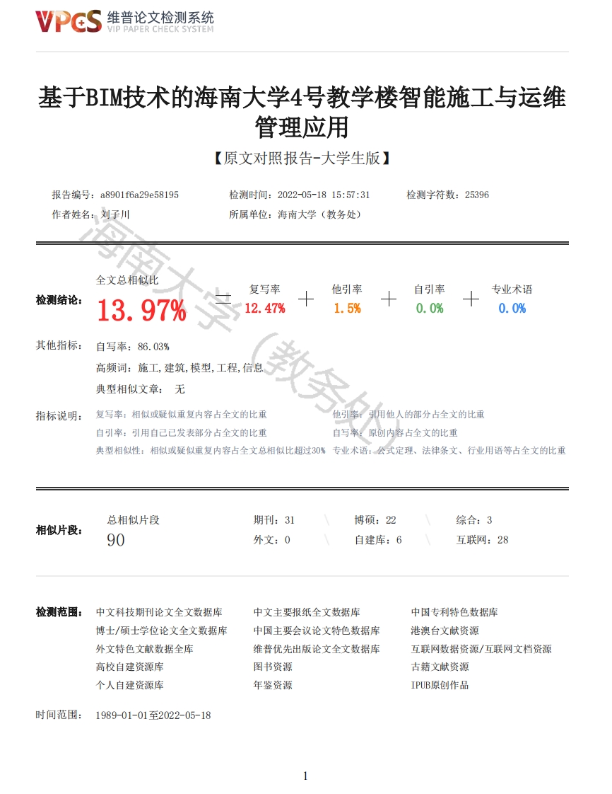 维普论文检测系统VIP PAPER CHECK SYSTEM基于BIM技术的海南大学4号教学楼智能施工与运维管理应用【原文对照报告-大学生版】报告编号:a8901f6a29e58195检测时间:2022-05-1815:57:31检测字符数:25396作者姓名:刘子川所属单位:海南大学(教务处)全文总相似比复写率他引率自引率专业术语检测结论:13.97%12.47%1.5%0.0%0.0%其他指标:自写率:86.03%高频词:施工,建筑,模型,工程,信息典型相似文章:无指标说明:复写率:相似或疑似重复内容占全文的比重他引率:引用他人的部分占全文的比重自引率:引用自己已发表部分占全文的比重自写率:原创内容占全文的比重典型相似性:相似或疑似重复内容占全文总相似比超过0%专业术语:公式定理、法律条文、行业用语等占全文的比重总相似片段期刊:31博硕:22综合:3相似片段:90外文:0自建库:6互联网:28检测范围:中文科技期刊论文全文数据库中文主要报纸全文数据库中国专利特色数据库博士/硕士学位论文全文数据库中国主要会议论文特色数据库港澳台文献资源外文特色文献数据全库维普优先出版论文全文数据库互联网数据资源/互联网文档资源高校自建资源库图书资源古籍文献资源个人自建资源库年鉴资源IPUB原创作品时间范围:1989-01-01至2022-05-18维普论文检测系统VIP PAPER CHECK SYSTEM原文对照颜色标注说明:■自写片段■复写片段(相似或疑似重复)引用片段(引用)专业术语(公式定理、法律条文、行业用语等)摘要随着BIM技术的发展与在应用中的推广,落实国家建筑行业发展纲要中的要求,建筑行业信息化和智能化成为了未来发展的一个重要趋势。在建筑行业信息化和智能化的背景下,结合大数据和互联网技术,施工现场管理和建筑运维管理逐渐由人工方式转变为信息化、智能化管理。基于BIM技术的智能施工与运维管理应用在实际的生产中变得越来越广泛,毕业设计选取基于BM技术的智能施工于运维管理作为研究内容,在将工程管理专业理论知识与技术应用结合的同时,探索BIM技术在施工与运维中应用的更多可能性。本文以海南大学4号教学楼为研究对象,利用BIM技术建立建筑物的建筑模型和算量模型,应用碰撞检测技术优化模型,编制造价预算和施工进度计划,进行BIM5D施工模拟,三维施工场地布置以及阶梯教室装修方案VR展示,研究BIM技术在智能建施工和运维管理中的应用。在建筑模型创建阶段,应用Rvit软件创建建筑模型并应用体量功能创建复杂形状构件。运用Navisworks软件执行碰撞检测,完善建筑模型。在工程造价预算阶段,使用广联达BIM土建计量平台GTJ2021构建算量模型,套入做法并导入软件广联达云计价平台GCCP6.0编制工程造价。通过编制施工进度计划,结合建筑模型和造价信息,进行BIM5D施工进度模拟。利用软件BIMMAKE软件进行施工三维场布,制作漫游动画。通过BIM5D和三维场布,探索BIM技术在智能施工中的应用。选择其中一间阶梯教室进行装修布置,利用VR技术展示装修效果及施工工艺做法,探索BIM和VR技术在施工和运维管理中的应用场景。关键词:BIM技术:智能施工:工程预算:BIM5D:VR技术AbstractWith the development and application of BIM technology and the requirement of nationalconstruction industry development program,informatization and intelligence of construction industryhas become an important trend of future development.Under the background of informatization andintelligence of construction industry,combined with big data and Internet technology,constructionsite management and construction operation management gradually change from manual mode toinformatization and intelligence management.Intelligent construction and maintenance managementapplication based on BIM technology is becoming more and more widely used in actual production.Intelligent construction based on BIM technology is selected as the research content in graduationdesign.Combining theoretical knowledge of engineering management with technical application,morepossibilities of BIM technology application in construction and maintenance are explored.This paper takes No.4 teaching building of Hainan University as the research object,buildsbuilding model and calculation model by using BIM technology,applies collision detection technologyoptimization model,prepares cost budget and construction schedule,carries out BIM 5D constructionsimulation,three-dimensional construction site arrangement and VR display of step classroomdecoration scheme,and studies the application of BIM technology in intelligent construction and2维普论文检测系统VIP PAPER CHECK SYSTEMoperation and maintenance management.During the building model creation stage,Revit software isused to create building model and volume function is used to create complex shape components.UseNavisworks software to perform collision detection and improve building models.At the stage ofproject cost budget,the calculation model is built using GTJ2021 BIM civil measurement platform ofGlodon,which is incorporated into practice and introduced into GCCP 6.0 software of Glodon cloudpricing platform to prepare project cost.BIM 5D construction schedule simulation is carried out bycompiling construction schedule and combining building model and cost information.Use softwareBIMMAKE to construct three-dimensional field cloth and make roaming animation.The application ofBIM technology in intelligent construction is explored through BIM 5D and 3-D field cloth.Chooseone of the stepped classrooms for decoration and layout,use VR technology to show the effect ofdecoration and construction technology practices,and explore the application scenarios of BIM andVR technology in construction and operation management.Keyw
