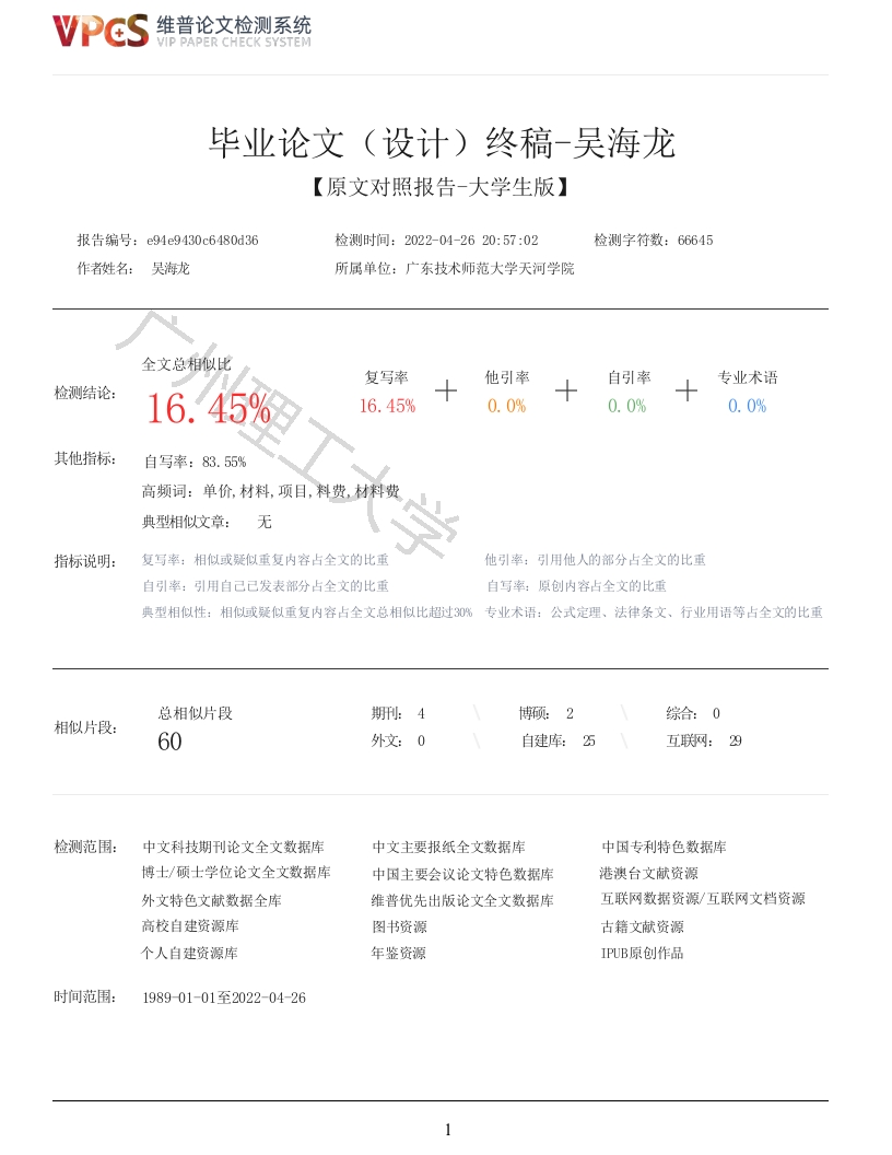 维普论文检测系统VIP PAPER CHECK SYSTEM毕业论文(设计)终稿-吴海龙【原文对照报告-大学生版】报告编号:e94e9430c6480d36检测时间:2022-04-2620:57:02检测字符数:66645作者姓名:吴海龙所属单位:广东技术师范大学天河学院全文总相似比复写率他引率自引率专业术语检测结论:16.45%16.45%0.0%0.0%0.0%其他指标:自写率:83.55%高频词:单价,材料,项目,料费,材料费典型相似文章:无指标说明:复写率:相似或疑似重复内容占全文的比重他引率:引用他人的部分占全文的比重自引率:引用自己已发表部分占全文的比重自写率:原创内容占全文的比重典型相似性:相似或疑似重复内容占全文总相似比超过3%专业术语:公式定理、法律条文、行业用语等占全文的比重总相似片段期刑:4综合:0相似片段:60外文:0检测范围:中文科技期刊论文全文数据库中文主要报纸全文数据库中因专利特色数据库博士/硕士学位论文全文数据库中因主要会议论文特色数据库港澳台文献资源外文特色文献数据全库维普优先出版论文全文数据库互联网数据资源/互联网文档资源高校自建资源库图书资源古籍文献资源个人自建资源库年鉴资源IPUB原创作品时间范围:198901-01至2022-04-261维普论文检测系统VIP PAPER CHECK SYSTEM原文对照颜色标注说明:■自写片段■复写片段(相似或疑似重复)口引用片段(引用)■专业术语(公式定理、法律条文、行业用语等)Guangzhou Institute of Science and Technology毕业论文(设计)题目:广海湖光校区宿舍楼招标控制价编制与分析Compilation and Analysis of Bidding Control Prices for Dormitory Buildings in GuanghaiTitle:Huguang Campus二级学院:建筑工程学院专业班级:工程造价3班姓名:吴海龙学号:20180911210322指导老师:严韬智日期:2022年05月诚信声明本人声明:1、本人所呈交的毕业设计(论文)是在老师指导下进行的研究工作及取得的研究成果:2、据查证,除了文中特别加以标注和致谢的地方外,毕业设计(论文)中不包含其他人已经公开发表过的研究成果,也不包含为获得其他教育机构的学位而使用过的材料:3、我承诺,本人提交的毕业设计(论文)中的所有内容均真实、可信。作者签名:日期:年月日广海湖光校区宿舍楼招标控制价编制与分析摘要我的设计是广海湖光校区宿舍楼的招标控制价的编制与分析,拿到设计图纸的时,先检查图纸的准确性、图纸维普论文检测系统VIP PAPER CHECK SYSTEM是否完整,分析此建筑的建筑方式和装修方式。通过在学校学习的GTJ2021进行建模,得出建筑各分部分项工程的工程量和用料的标准。再通过GCCP6.0进行整合套价经过2022年一月份广州第一季度的信息价和调研得出的市场价进行套价整合得出此建筑的整体总造价。通过此造价来编制一套合理的招标控制价,为了验证此造价是否符合当地的建筑规范和建筑造价的合理程度。故查阅网上资料找到了一份类似本工程的建最终查询相关的资料做出项目经济指标分析,对比类似工程的技术经济指标检测其合理性,最后将自己的研究结果编写成为小论文。关键词:广联达:清单计价:技术经济指标Compilation and analysis of bidding control price of dormitory building in Guanghai HuguangCampusABSTRACTThis design is the preparation and analysis of the bidding control price of the dormitorybuilding in Guanghai Huguang Campus.It starts with the design and construction drawings.The above-ground building of this project is a student dormitory,and the underground building is a one-storyunderground parking garage.The total construction area is 20252.6 m2,the structure of this projectis a shear wall structure.The design is based on the requirements of relevant measurement andpricing specifications in Guangzhou City,Guangdong Province.First,GTJ2021 is used to model theproject to calculate the engineering quantity,and the list of engineering quantities is obtained.Then use GCCP6.0 to extract the corresponding quota,and compile a bidding control price.In orderto check whether it is reasonable,find an analysis and comparison with the economic and technicalindicators of this project,and check whether the preparation of the bidding control price of thisproject meets the requirements.When compiling the bidding control price,the relevant engineeringexperience and the actual situation of the project are compared to compile the relevant constructionplan of the project,and explore the influence of the list engineering quantity and material priceon the bidding control price.Finally,the relevant information is inquired to analyze the economicindicators of the project,and the technical and economic indicators of similar projects are comparedto test their rationality,and finally write their own research results into a small paper.Key words:Glodon:list pricing:technical and economic indicators目录一、招标控制价(一)招标控制价封面(二)招标控制价扉页(三)总说明···········(四)单位工程招标控制价汇总表(五)分部分项工程和单价措施项目清单与计价表(六)综合单价分析表·········18(七)总价措施项目清单与计价表118(八)其他项目清单与计价汇总表···119(九)暂列金额明细表120(十)材料(工程设备)暂估单价及调整表121(十一)专业工程暂估价及结算价表·····122(十二)计日工表···········123