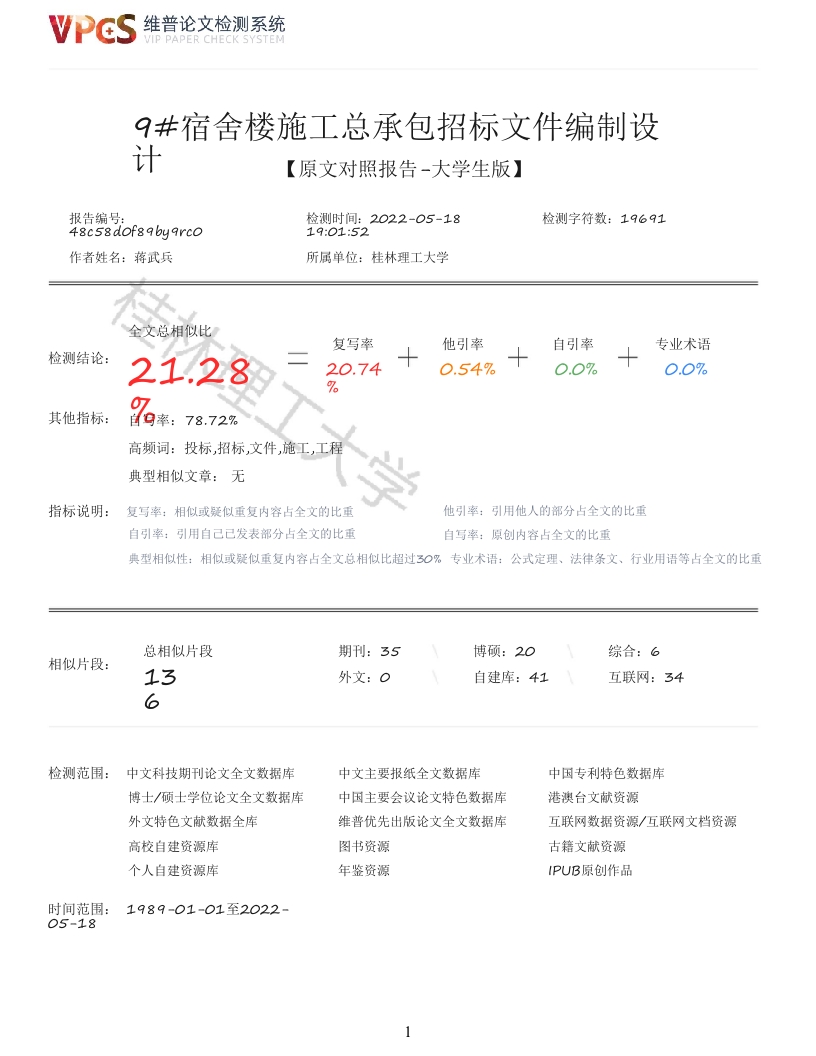 维普论文检测系统YIP PAPER CHECK SYSTEM9共宿舍楼施工总承包招标文件编制设计【原文对照报告-大学生版】报告编号:检测时间:2022-05-18检测字符数:1969119:01:52作者姓名:蒋武兵所属单位:桂林理工大学全文总相似比复写率他引率自引率专业术语检测结论:21.2820.740.54%0.0%其他指标:自9率:78.72%高频词:投标,招标,文件,施工,工程典型相似文章:无指标说明:复写率:相似或疑似重复内容占全文的比重他引率:引用他人的部分占全文的比重自引率:引用自己已发表部分占全文的比重自写率:原创内容占全文的比重典型相似性:相似或疑似重复内容占全文总相似比超过30%专业术语:公式定理、法律条文、行业用语等占全文的比重总相似片段期刊:35博硕:20综合:6相似片段:13自建库:41互联网:34检测范围:中文科技期刊论文全文数据库中文主要报纸全文数据库中因专利特色数据库博士/硕士学位论文全文数据库中国主要会议论文特色数据库港澳台文献资源外文特色文献数据全库维普优先出版论文全文数据库互联网数据资源/互联网文档资源高校自建资源库图书资源古籍文献资源个人自建资源库年鉴资源IPUB原创作品时间范围:1989-01-01至2022-05-181维普论文检测系统VIP PAPER CHECK SYSTEM原文对照颜色标注说明:■自写片段■复写片段(相似或疑似重复)■引用片段(引用)■专业术语(公式定理、法律条文、行业用语等)学号:5181901126林理桂林理工大学GUILIN UNIVERSITY OF TECHNOLOGY本科毕业设计(论文)题目:9#宿舍楼施工总承包招标文件的编制设计学院:南宁分校专业(方向):工程管理班级:工程管理18-本1学生:蒋武兵指导教师:劳景寮2022年5月8日摘要。。招标文件是向投标人介绍招标项目信息和招标要求的书面文件,它是根据业主的招标需求和招投标相关的法律法规编制而成的。笔者做这个9#宿舍楼施工总承包招标文件的编制设计,主要是为解决招投标活动和招标文件编制中出现的一些问题提供一些参考。例如招标文件条款不严谨、评标方法不合理、不合理低价中标、违法分包、违法挂靠等招标文件编制和招投标活动的问题。其次,笔者想通过对招标文件的编制设计,熟悉招投标流程,掌握投标方面的知识,为以后可能从事招投标工作做好准备。本次9#宿舍楼施工总承包招标文件的编制设计内容主要有招标公告、投标人注意事项、评标的具体内容、施工合同、工程建设标准、工程量清单、施工图纸、投标文件格式这八大内容。笔者主要通过网络搜索、查找文献、研究同类招标项目的方法来编制设计招标文件,在符合招投标有关法律和规定的基础上,分析招投标活动和招标文件编制中出现的一些问题,制定合理的招投标流程、评标办法和施工合同。本次9#宿舍楼施工总承包招标文件的编制设计完全依据国家法律法规编制,满足招标需求,是一份可行性的招标文件。招标文件的编制除了要符合招投标有关法律和规定,还要严谨、详细和符合实际。招标文件是招投标双方的核心契约,它对于招投标双方都有约束力。编制一份好的招标文件对于减少建筑市场的违法乱象,维护建筑市场的公平竞争和保证招投标活动的开展有十分重要的现实意义和指导意义。关键词:招标文件:施工合同:招标人.Compilation and design of bidding documents for general contracting of q#dormitorybuildingNG Wu-bing Tutor:LAO Jing-liao Abstract:The bidding document is a written document that introduces the bidding projectinformation and bidding requirements to the bidders.It is prepared according to the biddingneedsof the owner and the laws and regulations related to bidding.The author does the compilationand维普论文检测系统VIP PAPER CHECK SYSTEIdesign of the bidding document for the general contracting of the construction of this q#dormitorybuilding,which is mainly to provide some references for solving some problems in the biddingactivities and the compilation of the bidding document.For example,the terms of the biddingdocument are not rigorous,the bid evaluation method is unreasonable,the bid is won at anunreasonable low price,illegal subcontracting,illegal affiliation and other problems in thepreparation of bidding documents and bidding activities.Secondly,the author wants to be familiarwith the bidding process and master the knowledge of bidding through the preparation and designobidding documents,so as to prepare for the possible bidding work.The preparation and designcontents of the bidding documents for the general contracting of 9#dormitory buildingconstructionmainly include eight contents:bidding announcement,precautions for bidders,specific contents ofbid evaluation,construction contract,engineering construction standard,bill of quantities,construction drawings and format of bidding documents.The author mainly compiles the designbiddingdocuments by means of network search,literature search and Research on similar bidding projects.Onthe basis of conforming to the relevant laws and regulations of bidding,the author analyzes someproblems in bidding activities and the preparation of bidding documents,and formulates areasonablebidding process,bid evaluation methods and construction contracts.This q#dormitory buildingconstruction general contracting bidding document is prepared and designed in full accordancewithnational laws and regulations,which meets the bidding needs and is a feasible bidding document.Theddinerbut also be rigorous,detailed and practical.The bidding document is the core contract ofboth parties,which is binding on both parties.The preparation of a good bidding document hasimportant practical and guiding significance for reducing the i