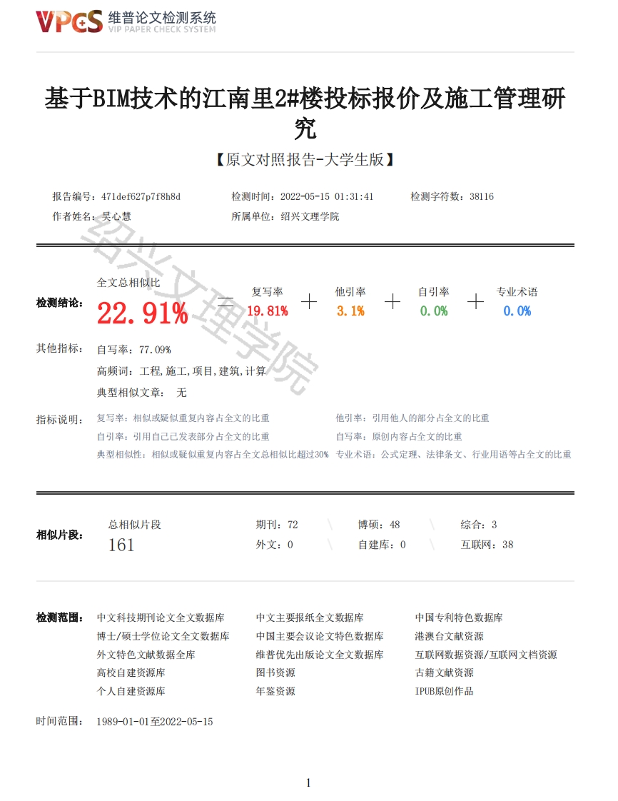 维普论文检测系统VIP PAPER CHECK SYSTEM基于BIM技术的江南里2#楼投标报价及施工管理研究【原文对照报告-大学生版】报告编号:471def627p7f8h8d检测时间:2022-05-1501:31:41检测字符数:38116作者姓名:吴心慧所属单位:绍兴文理学院全文总相似比复写率他引率自引率专业术语检测结论:22.91%学19.81%3.1%0.0%0.0%其他指标:自写率:77.09%高频词:工程,施工,项目,建筑,计典型相似文章:无指标说明:复写率:相似或疑似重复内容占全文的比重他引率:引用他人的部分占全文的比重自引率:引用自己已发表部分占全文的比重自写率:原创内容占全文的比重典型相似性:相似或疑似重复内容占全文总相似比超过0%专业术语:公式定理、法律条文、行业用语等占全文的比重总相似片段期刊:72博硕:48综合:3相似片段:161外文:0自建库:0互联网:38检测范围:中文科技期刊论文全文数据库中文主要报纸全文数据库中国专利特色数据库博士/硕士学位论文全文数据库中国主要会议论文特色数据库港澳台文献资源外文特色文献数据全库维普优先出版论文全文数据库互联网数据资源/互联网文档资源高校自建资源库图书资源古籍文献资源个人自建资源库年鉴资源IPUB原创作品时间范围:1989-01-01至2022-05-15维普论文检测系统VIP PAPER CHECK SYSTEM原文对照颜色标注说明:■自写片段■复写片段(相似或疑似重复)口引用片段(引用)■专业术语(公式定理、法律条文、行业用语等)毕业设计(论文)(2022届)基于BIM技术的江南里2#楼投标报价及施工管理研究学生姓名:吴心慧学号:18133124院系:土木工程学院专业:工程管理指导教师:俞燕飞完成日期:2022-05-20基于BIM技术的江南里2#楼投标报价及施工管理研究摘要本工程项目位于浙江省龙游县凤梧路以北,阳东路以东,该工程项目是一座总建筑面积为4153.46平方米,地上11层、地下1层的框架-剪力墙结构住宅楼。本设计的主要内容为江南里2#楼投标报价的编制及施工管理研究。根据实际工程所提供的建筑图纸、结构图纸,绘制出该建筑工程项目中的全部土建、钢筋模型,以现行《建设工程工程量清单计价规范(GB50500-2013)》以及《浙江省建筑工程预算定额(2018版)》标准等国家有关定额标准数据为计算基础,利用广联达建筑科技股份有限公司的建模与算量一体化软件一GTJ2018,并根据部分构件手算结果,计算求出工程各分部分项的工程量,并列出实际工程量清单。同时运用广联达擎洲广达计价软件进行套价,最终编制完成该设计的投标报价。根据相关的浙江省定额规范、施工顺序的要求等来确定本项工程的施工方案。使用斑马梦龙软件绘制本工程的进度计划,并用场布软件来绘制基础、主体和装修三个阶段的三维模型。关键词:BIM技术:投标报价编制:综合单价分析:进度计划编制:施工管理2维普论文检测系统VIP PAPER CHECK SYSTEMResearch on bidding quotation and construction management of jiangnanli 2#building based on BIMTechnologyABSTRACTThe project is located in the north of Fengwu Road and east of Yangdong Road,Longyou County,Zhejiang Province.The project is a residential building with a total construction area of 4153.46square meters,11 floors above ground and 1 floor underground.The main content of this design is the preparation of tender quotation and constructionmanagement study of Jiangnanli 2#building.According to the architectural drawings and structuraldrawings provided by the actual project,all the civil and steel models in the construction projectare drawn,and the data of the relevant national quota standards,such as the current Specificationfor Bill of Quantities for Construction Works (GB50500-2013)and the standard of ConstructionEngineering Budget Quotas in Zhejiang Province (2018 Edition),are used as the basis forcalculation,using Quanta Construction Technology Co.Ltd.modeling and quantity integrationsoftware -GTJ2018,and according to the results of some components of the hand calculation,calculate the amount of each component of the project,and list the actual amount of work.At thesame time,we used Quanta Prime Quanta pricing software for price setting,and finally prepared thetender quotation of the design.Determine the construction plan for this project according to therelevant Zhejiang Province fixed-rate specifications and the requirements of the constructionsequence.Use Zebra Menglong software to draw the schedule of this project,and use the field clothsoftware to draw the 3D model of the three stages of foundation,main body and decoration.Key words:BIM Technology;Preparation of tender offer;Comprehensive unit price analysis;Preparation of schedule;Construction management目录1.工程概况说明···2.建筑面积计算······2.1.地下室建筑面积的计算··2.2.标准层建筑面积的计算2.3.屋顶层及机房层建筑面积的计算··3.分部分项工程量清单的编制····3.1.编制说明·······3.1.3.投标报价说明・・・・3.2清单编制内容·····3
