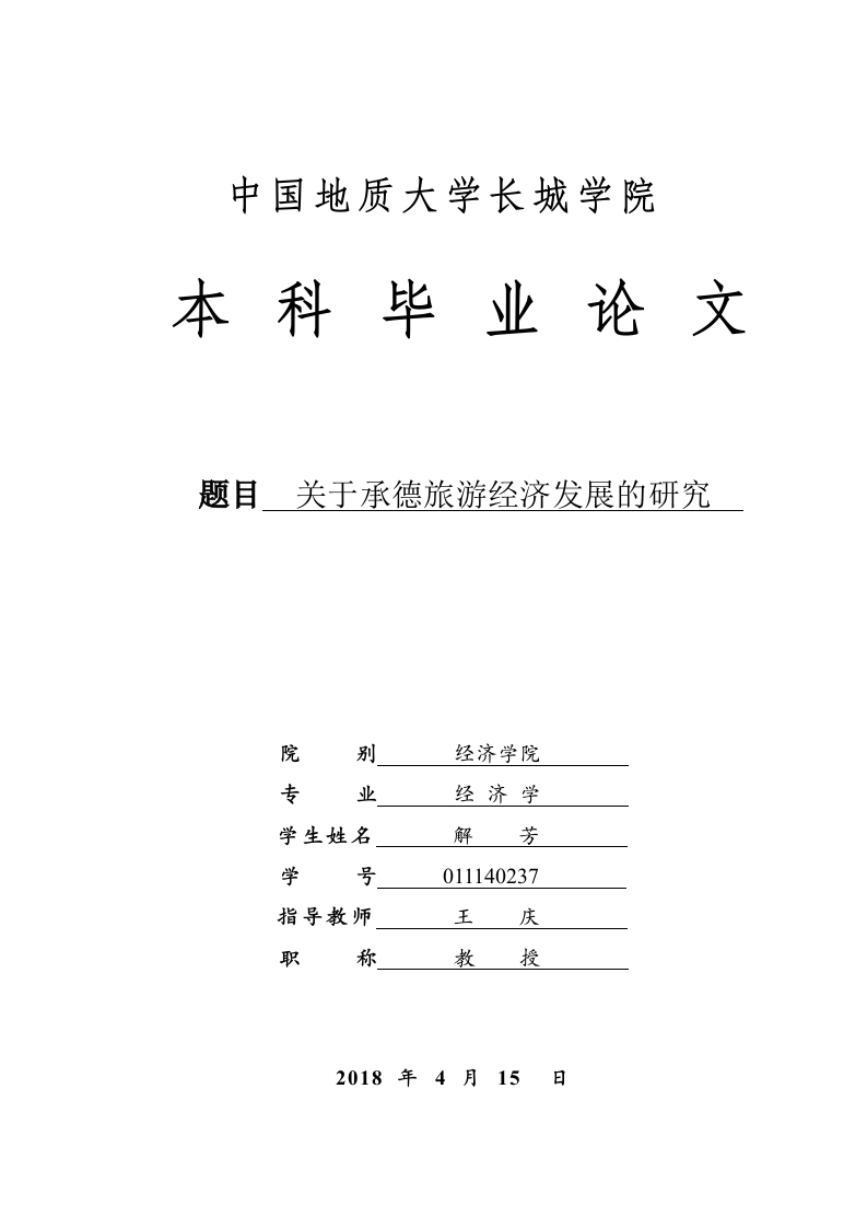 中国地质大学长城学院本科毕业论文题目关于承德旅游经济发展的研究院别经济学院专业经济学学生姓名解芳学号011140237指导教师王庆职称教授2018年4月15日本科毕业生毕业论文(设计)诚信承诺书毕业论文关于承德旅游经济发展的研究(设计)题目学生姓名解芳专业经济学学号011140237指导老师王庆职称教授所在院别经济学院诚信承诺本人慎重承诺和声明:我承诺在毕业论文(设计)活动中遵守学校有关规定,恪守学术规范,在本人的毕业论文中不剽窃、抄袭他人的学术观点、思想和成果,不篡改研究数据,如有违规行为发生,我愿承担一切责任,接受学校的处理。学生(签名):年月日中国地质大学长城学院毕业论文任务书学生姓名解芳学号011140237专业班级14级经济学2班指导教师王庆职称教授位中国地质大学长城学院毕业论文关于承德旅游经济发展的研究题目毕业论文主要内容和要求:主要内容:随着社会的发展,旅游业己经成为全球经济中发展势头最强劲和规模最大的产业之一,许多城市均涉足发展这一行业,承德就是其中之一。旅游业的发展给承德带来了新的机遇但也出现了一些问题。本文主要通过对承德市旅游发展现状来入手,利用具体问题具体分析的哲学原理分析出我市旅游经济发展的新出路。论文首先是从国内角度简述旅游产品状况,全面分析我国旅游业现状:其次是搜集各种相关的信息与资料,深入研究承德市旅游业发展不出色的内外原因:最后从政府的扶持措施和承德市自身资源建设等方面提出发展旅游品牌的策略。要求:论文撰写要求思路清晰、内容充实、论点明确,论据充分,论证严密,语言通顺。撰写论文前应首先阅读相关的研究资料,掌握学术前沿动态,对相关理论著作要很好的把握,提高理论水平及思想深度。根据开题报告和老师提出的意见对论文提纲进行修改,确定大纲后认真撰写毕业论文。撰写论文结束后要根据老师的修改意见,认真反复的修改论文,并按照要求参加毕业论文的答辩,严格按照论文进度安排进行论文的写作。论文的格式、字数等撰写方面的要求参照《中国地质大学长城学院毕业论文(设计)撰写规范》。毕业论文主要参考资料:[1]谢彦君.基础旅游学[0.北京:商务印书馆,2015.[2]李金早.2015年全国旅游工作会报告[W.南昌:中国旅游智库,2015.[3]王通.河北省A级旅游景区空间格局演化及优化研究[J门.河北师范大学,2016(05):223-228.[4]王慧娴.中国旅游政策的经济效应及空间分异研究].陕西师范大学,2016.[5]孙丰.创建国际旅游城市:向世界级旅游目的地挺进[].承德日报,2016.[6]王颖.环京津贫困带旅游扶贫开发研究[].2017中国旅游科学年会.中国会议,2017.[7]赵翠华,张水利.承德非物质文化遗产旅游资源开发研究[J刀.理论观察,2017(06):66-68.[8]司红十,陈志新·京津冀协同下承德森林生态旅游产品开发路径探析[山刀.旅游纵览(下半月),2017(08):82-83.[9]何琼峰.中国旅游经济蓝皮书No.10[N].北京:中国旅游出版社,2017[10]倪维秋,廖茂林.高速铁路对中国省会城市旅游经济联系的空间影响[J刀,中国人口·资源与环境.2018(03):160-168.[11]张玉静,林森.中国旅游业发展:新时代、新方向与新思维[J刀.现代管理科学,2018(02):106-108.[12]]Jan Mosedale.Critical engagements with nature:tourism,political economy of nature and political ecology[].Tourism