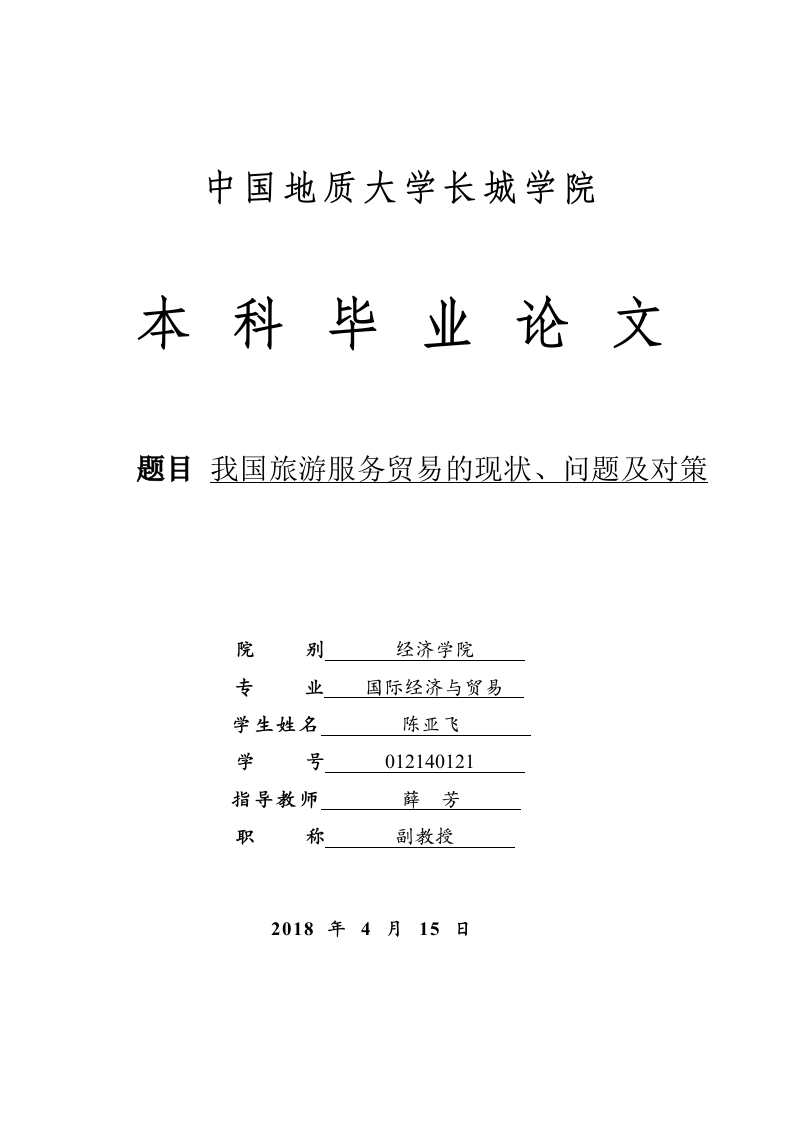中国地质大学长城学院本科毕业论文题目我国旅游服务贸易的现状、问题及对策院别经济学院专业国际经济与贸易学生姓名陈亚飞学012140121指导教师薛芳职称副教授2018年4月15日本科毕业生毕业论文(设计)诚信承诺书毕业论文我国旅游服务贸易的现状、问题及对策(设计)题目国际经济学生姓名陈亚飞专业学号012140121与贸易指导老师薛芳职称副教授所在院别经济学院诚信承诺本人慎重承诺和声明:我承诺在毕业论文(设计)活动中遵守学校有关规定,恪守学术规范,在本人的毕业论文中不剽窃、抄袭他人的学术观点、思想和成果,不篡改研究数据,如有违规行为发生,我愿承担一切责任,接受学校的处理。学生(签名):年月中国地质大学长城学院毕业论文任务书学生姓名陈亚飞学号012140121专业班级14级国际经济与贸易1班指导教师薛芳职称副教授单位中国地质大学长城学院毕业论文我国旅游服务贸易的现状、问题及对策题目毕业论文主要内容和要求:主要内容:论文首先分析我国旅游服务贸易的现状:其次运用收集的最新数据,剖析我国旅游服务贸易方面存在的问题:我国东西部地区发展不平衡、营销力度不够、出入境旅游购物消费金额差距悬殊、客源市场单一、旅游法律制度不完善等一系列问题:最后针对上述的问题提出相应的有效对策:加快西部地区的发展、加大营销力度、境外消费回流、拓展客源市场、健全法律法规等措施,解决我国旅游服务贸易存在的问题。要求:论文撰写要求思路清晰、内容其次充实、论点明确,论据充分,论证严密,语言通顺。撰写论文前应首先阅读相关的研究资料,掌握学术前沿动态,对相关理论著作要很好的把握,提高理论水平及思想深度。根据开题报告和老师提出的意见对论文提纲进行修改,确定大纲后认真撰写毕业论文。撰写论文结束后要根据老师的修改意见,认真反复的修改论文,并按照要求参加毕业论文的答辩,严格按照论文进度安排进行论文的写作。论文的格式、字数等撰写方面的要求参照《中国地质大学长城学院毕业论文(设计)撰写规范》。毕业论文主要参考资料:[1]王珅琪.我国旅游服务贸易研究[刀.经济研究导刊,2014,(6):12-35.[2]张帆.我国旅游服务贸易发展现状及对策建议[刀.对外经贸,2015,(4):321.[3]史雅楠.我国旅游服务贸易发展现状分析[J刀.现代商贸工业,2014,(11):23-36[4马谦青.我国旅游服务贸易存在的问题及其对策[刀.南方论刊,2017,(7):2-14.[5]李辉.我国国际旅游服务贸易的发展趋势及对策建议[刀.吉林工商学院学报,2015,(31):3-8[6]梁佼佼.我国旅游服务贸易的发展现状及优化路径[D].中山:中山职业技术学院,2015.1-20.[7]张稳.我国旅游服务贸易发展现状[刀.经济贸易学报,2017,(9):21-38[8]杨志伟.我国旅游服务贸易发展现状及其对策分析[D].石家庄:河北商贸学校,2014.2132.[9]赵小燕.我国旅游服务贸易发展战略研究[D].济南:山东管理学院,2014.2132.[10]秦雅娜.我国旅游服务贸易形势分析与对策研究[D].南京:河海大学,2017.9-21[11]井乐.“一带一路”背景下我国旅游服务贸易的发展之路[D].武昌:武昌工学院,2017.3337.[12]CeliaVeiga.Tourism Services:facing the challenge of new tourist profiles [J].School ofManagement,Hospitality and Tourism,University of Algarve,Faro,Portugal 2016,(7):82-84.