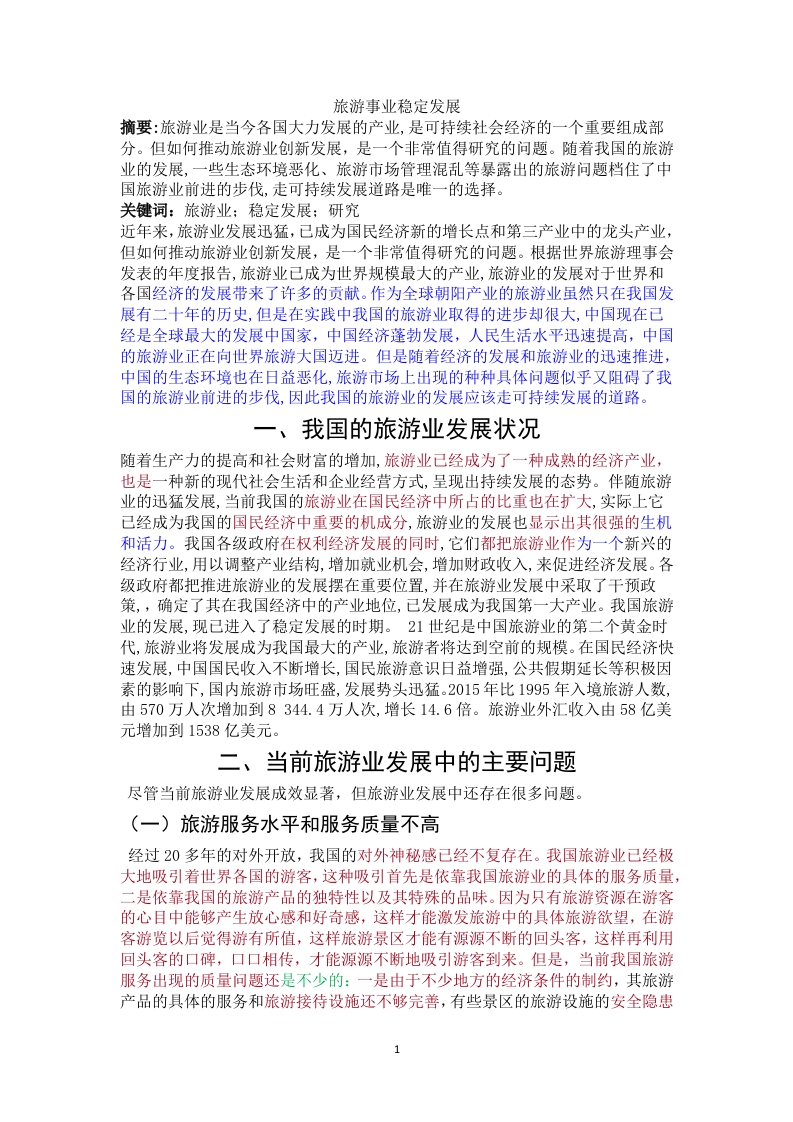 旅游事业稳定发展摘要:旅游业是当今各国大力发展的产业,是可持续社会经济的一个重要组成部分。但如何推动旅游业创新发展,是一个非常值得研究的问题。随着我国的旅游业的发展,一些生态环境恶化、旅游市场管理混乱等暴露出的旅游问题档住了中国旅游业前进的步伐,走可持续发展道路是唯一的选择。关键词:旅游业:稳定发展:研究近年来,旅游业发展迅猛,已成为国民经济新的增长点和第三产业中的龙头产业,但如何推动旅游业创新发展,是一个非常值得研究的问题。根据世界旅游理事会发表的年度报告,旅游业已成为世界规模最大的产业,旅游业的发展对于世界和各国经济的发展带来了许多的贡献。作为全球朝阳产业的旅游业虽然只在我国发展有二十年的历史,但是在实践中我国的旅游业取得的进步却很大,中国现在已经是全球最大的发展中国家,中国经济蓬勃发展,人民生活水平迅速提高,中国的旅游业正在向世界旅游大国迈进。但是随着经济的发展和旅游业的迅速推进,中国的生态环境也在日益恶化,旅游市场上出现的种种具体问题似乎又阻碍了我国的旅游业前进的步伐,因此我国的旅游业的发展应该走可持续发展的道路。一、我国的旅游业发展状况随着生产力的提高和社会财富的增加,旅游业已经成为了一种成熟的经济产业,也是一种新的现代社会生活和企业经营方式,呈现出持续发展的态势。伴随旅游业的迅猛发展,当前我国的旅游业在国民经济中所占的比重也在扩大,实际上它已经成为我国的国民经济中重要的机成分,旅游业的发展也显示出其很强的生机和活力。我国各级政府在权利经济发展的同时,它们都把旅游业作为一个新兴的经济行业,用以调整产业结构,增加就业机会,增加财政收入,来促进经济发展。各级政府都把推进旅游业的发展摆在重要位置,并在旅游业发展中采取了干预政策,,确定了其在我国经济中的产业地位,已发展成为我国第一大产业。我国旅游业的发展,现已进入了稳定发展的时期。21世纪是中国旅游业的第二个黄金时代,旅游业将发展成为我国最大的产业,旅游者将达到空前的规模。在国民经济快速发展,中国国民收入不断增长,国民旅游意识日益增强,公共假期延长等积极因素的影响下,国内旅游市场旺盛,发展势头迅猛。2015年比1995年入境旅游人数,由570万人次增加到8344.4万人次,增长14.6倍。旅游业外汇收入由58亿美元增加到1538亿美元。二、当前旅游业发展中的主要问题尽管当前旅游业发展成效显著,但旅游业发展中还存在很多问题。(一)旅游服务水平和服务质量不高经过20多年的对外开放,我国的对外神秘感已经不复存在。我国旅游业已经极大地吸引着世界各国的游客,这种吸引首先是依靠我国旅游业的具体的服务质量,二是依靠我国的旅游产品的独特性以及其特殊的品味。因为只有旅游资源在游客的心目中能够产生放心感和好奇感,这样才能激发旅游中的具体旅游欲望,在游客游览以后觉得游有所值,这样旅游景区才能有源源不断的回头客,这样再利用回头客的口碑,口口相传,才能源源不断地吸引游客到来。但是,当前我国旅游服务出现的质量问题还是不少的:一是由于不少地方的经济条件的制约,其旅游产品的具体的服务和旅游接待设施还不够完善,有些景区的旅游设施的安全隐患还不少,住宿饮食的卫生条件比较差,难以向旅游者提供安全、卫生、舒适的服务。二是一些旅游从业人员的服务水平和职业道德较低,有些旅游业从业者如司机,导游,导游,服务人员素质参差不齐,有些人员会受片面的经济利益驱使,在其日常工作中提供旅游服务还不规范,而是对服务项目和服务内容缺斤短两,随意降低服务质量,欺客宰客,这些情况都不利于我国旅游业的整体形象和旅游者的权益。(二)经营管理不善,监督制约不利我国旅游企业普遍存在单体规模小,实力弱,经营管理水平低的弱点,使得我国旅游企业在资金、技术、人力资源、管理模式等方面无法满足未来发展的需要,从而削弱了其进行产品开发、市场拓展、服务质量改善的能力,限制了其在国内国际市场上的竞争力,而企业失去了竞争力就等于人没有了生命力,对一个企业的发展是致命的。而且,由于我国旅游企业资金短缺,技术力量薄弱,长期以来只能依赖于低效率的粗放式经营。(三)文化内涵不丰富,发展模式不科学一是在体现地域文化方面,在挖掘和丰富旅游文化方面还存在景区文化底蕴挖掘不深,旅游商品开发创意水平低,旅游餐饮文化特色不突出,旅游宾馆旅游购物、旅游餐饮等场所缺乏特色文化展示,旅游经营服务体现人文特色不高:二是在旅游发展模式方面,目前多数景区隶属于不同政府部门所有,在人、财、物方面存在政策壁垒,自我发展和市场竞争能力不强,缺乏应有的生机和活力,造成规划缺失、融资困难、营销脱节,发展模式不科学的现状,导致无序开发、低水平重复建设时有发生。(四)旅游业产业化程度和市场集中度比较低目前,旅游企业和旅游资源都比较分散,无论是横向联合或合并,还是纵向的前向、后向一体化程度都比较低,各个景点、企业、景区管理单位基本处于画地为牢的状态,各自为战,没有精力进行产品创新和产业升级,形不成整体合力和拉动效应。(五)旅游管理体制机制有待进一步理顺目前部分旅游景区分属于文物、宗教、林业、文化、水利