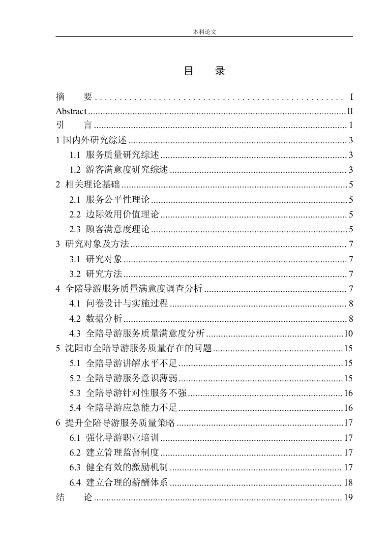 本科论文目录摘Abstract…引言11国内外研究综述31.1服务质量研究综述1.2游客满意度研究综述32相关理论基础.…2.1服务公平性理论…2.2边际效用价值理论52.3顾客满意度理论3研究对象及方法73.1研究对象3.2研究方法.…4全陪导游服务质量满意度调查分析4.1问卷设计与实施过程…84.2数据分析.…4.3全陪导游服务质量满意度分析.…5沈阳市全陪导游服务质量存在的问题5.1全陪导游讲解水平不足…5.2全陪导游服务意识薄弱5.3全陪导游针对性服务不强.165.4全陪导游应急能力不足.…6提升全陪导游服务质量策略.176.1强化导游职业培训176.2建立管理监督制度…176.3健全有效的激励机制176.4建立合理的薪酬体系18结19本科论文20附录调查问卷…22致25本科论文摘要现如今,导游人员的服务质量一直存在着高低不同的现象,在整个旅游过程中导游服务也决定着整个旅游活动中的质量是否完好。全陪导游从头到尾一直服务于游客,全陪导游的服务质量的好坏会影响游客的旅行体验。本论文从全陪导游的服务态度、讲解水平、应急能力、服务标准等方面出发,对沈阳市全陪导游服务质量满意度进行分析。以沈阳市腾邦旅游集团有限公司的游客们为相关调查对象,设计相关调查问卷,对沈阳市全陪导游服务质量满意度进行研究。研究结果表明,沈阳市全陪导游的讲解水平、服务态度、应急能力、以及专业的导游服务技能都存在着不足,这几个方面都对游客的满意度有着明显的影响,与此同时,全陪导游服务质量的好坏,不仅会影响游客们对全陪导游的评判,还会影响对于旅行社的评判。因此,提高旅行社的全陪导游服务质量是十分重要的。最后根据调查问卷的分析结果为沈阳市全陪导游提出相关建议,使旅行社能准确的看到全陪导游的重要性,提升沈阳市全陪导游自身服务质量,从而提高旅行社的经济效益。关键词:全陪导游:服务质量:游客满意度