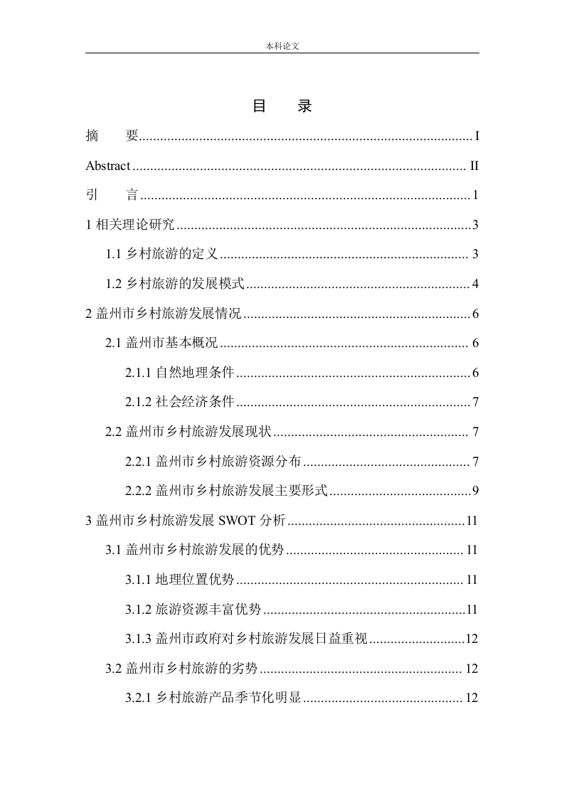 本科论文目录摘要Abstract.…引言…1相关理论研究.…1.1乡村旅游的定义1.2乡村旅游的发展模式2盖州市乡村旅游发展情况…2.1盖州市基本概况…62.11自然地理条件62.1.2社会经济条件44444444444444444444444444442.2盖州市乡村旅游发展现状2.2.1盖州市乡村旅游资源分布…2.2.2盖州市乡村旅游发展主要形式.3盖州市乡村旅游发展SWOT分析..3.1盖州市乡村旅游发展的优势.…113.1.1地理位置优势.…113.1.2旅游资源丰富优势3.1.3盖州市政府对乡村旅游发展日益重视123.2盖州市乡村旅游的劣势..123.2.1乡村旅游产品季节化明显…12本科论文3.2.2产品附加值低,竞争力不强133.2.3宣传营销意识淡薄,营销手段落后…133.2.4交通形势单一143.3盖州市乡村旅游发展的机遇…3.3.1旅游产业地位上升,政府部门逐步重视143.3.2城镇化速度加快,助推乡村旅游业发展.153.4盖州市乡村旅游发展的挑战.154盖州市乡村旅游发展的对策及建议4.1优化乡村资源空间结构,完善基础设施建设174.2加大培训力度,培养专业人才…4.3完善旅游产业体系,打造新型乡村旅游景观…18结20参考文献21致谢23本科论文摘要随着国家经济的发展,人民对幸福度的要求逐渐提升,旅游出行逐渐成为了人们十分重要的一个生活环节,所以人们对旅游产业的要求也在逐步提升。乡村旅游是近几年发展起来受到大多数人欢迎的一种新的休闲方式,做为盖州市经济发展的重要一环,它对盖州市的发展做出了巨大的贡献。在全国乡村旅游业开展如火如茶之际,盖州市乡村旅游发展积极利用自身资源,大力发展乡村旅游业。本文基于辽宁省盖州市经济社会发展实际,通过对盖州市乡村旅游发展概况的梳理,发现在乡村旅游发展过程中面对的机遇与挑战,提出了进一步推动盖州市乡村旅游发展的若干对策建议。本文也认真分析了盖州市发展乡村旅游所处阶段所具备的特点以及所存在的问题,结合盖州市自然景观、人文景观、等优势对盖州市发展乡村旅游提出了对策,希望能对盖州市乡村旅游的存在问题提供一定解决方法。关键词:盖州市:乡村旅游:发展模式