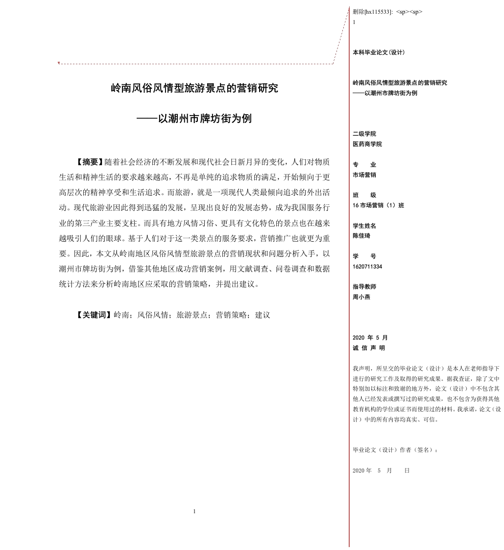 本科毕业论文(设计)岭南风俗风情型旅游景点的营销研究岭南风俗风情型旅游景点的营销研究一以潮州市牌坊街为例以潮州市牌坊街为例二级学院医药商学院【摘要】随着社会经济的不断发展和现代社会日新月异的变化,人们对物质业生活和精神生活的要求越来越高,不再是单纯的追求物质的满足,开始倾向于更市场营销高层次的精神享受和生活追求。而旅游,就是一项现代人类最倾向追求的外出活动。现代旅游业因此得到迅猛的发展,呈现出良好的发展态势,成为我国服务行16市场营销(1)班业的第三产业主要支柱。而具有地方风情习俗、更具有文化特色的景点也在越来学生姓名越吸引人们的眼球。基于人们对于这一类景点的服务要求,营销推广也就更为重陈佳琦要。因此,本文从岭南地区风俗风情型旅游景点的营销现状和问题分析入手,以学号潮州市牌坊街为例,借鉴其他地区成功营销案例,用文献调查、问卷调查和数据1620711334统计方法来分析岭南地区应采取的营销策略,并提出建议。指导教师周小燕【关键词】岭南:风俗风情:旅游景点:营销策略:建议2020年5月诚信声明我声明,所呈交的毕业论文(设计)是本人在老师指导下进行的研究工作及取得的研究成果。据我查证,除了文中特别加以标注和致谢的地方外,论文(设计)中不包含其他人已经发表或撰写过的研究成果,也不包含为获得其他教育机构的学位或证书而使用过的材料。我承诺,论文(设计)中的所有内容均真实、可信。毕业论文(设计)作者(签名):2020年5月日1Research on the marketing of the south of the FiveRidges custom scenic spots-taking the memorial gatestreet in the city of Chaozhou as an example[Abstract]With the continuous development of social economy and therapid change of modern society,people's requirements for material life and spirituallife are higher and higher,no longer the simple pursuit of material satisfaction,beganto tend to a higher level of spiritual enjoyment and life pursuit.And travel,is a outsideactivities modern human the most inclined to pursue.Therefore,modern tourism hasdeveloped rapidly and presented a good development trend,becoming the main pillarof the tertiary industry in China's service industry.And the spot which has theamorous feelings custom and the characteristic cultural also is more and moreattracting people's eyeball.Based on people's service requirements for suchattractions,marketing is more important.Therefore,this paper starts with the analysisof the marketing status and problems of the customs and customs tourist attractions inregion of the south of the Five Ridges taking the memorial gate street in the city ofChaozhou as an example.By referring to the successful marketing cases in otherregions,this paper analyzes the marketing strategies to be adopted in region of thesouth of the Five Ridges,by means of literature survey,questionnaire survey and datastatistic,and puts forward some suggestions.[Keywords]The south of the Five Ridges Custom amorous feelingsTourist attraction Marketing strategy Suggestions目录11.2研究内容..21.3研究方法42.1风俗风情型旅游资源的含义..,42.2PEST分析法453.2经济环境...53.3社会文化环境.…64.岭南风俗风情型旅游景点的营销现状的调查分析.....·8810124.5岭南风俗风情型旅游景点的营销综合分析.......165。岭南风俗风情型旅游营销存在的问题分析....·185.1管理水平较低,忽略对民俗资源的开发和保护.·185.2景点价格设置不合理,经济效益较低..193
