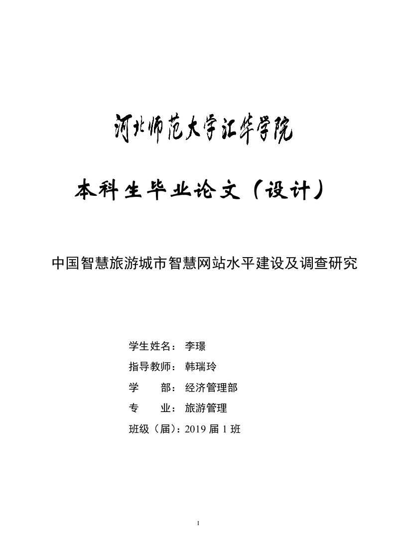 本科生毕业论文(设计)中国智慧旅游城市智慧网站水平建设及调查研究学生姓名:李璟指导教师:韩瑞玲学部:经济管理部专业:旅游管理班级(届):2019届1班I摘要智慧旅游城市是智慧城市建设的一个重点方向。目前,我国已发展了两批智慧旅游城市试点。基于此,对这33个试点城市的智慧旅游网站进行了建设水平调查研究,通过对比发现以下问题:(1)建设水平参差不齐,不完善:(2)更新速度慢,影响游客的信息获取:(3)提供给游客的在线虚拟机会少,缺少吸引力:(4)智慧网站过多,导致游客查找困难。针对以上问题,文章提出如下建议:(1)提升智慧网站建设,使游客享受更高水平服务:(2)通过完善网站建设水平,使游客能够获取相应资料:(3)吸收借鉴国外优秀智慧旅游城市的网站从中提升我国智慧网站建设。(4)建设智慧网站的独特性,能够突出当地特色。本文研究对智慧旅游试点城市的智慧旅游网站的建设有重大意义。关键词:智慧旅游:中国智慧旅游城市:智慧网站:调查研究AbstractIntelligent tourism city is a key direction of intelligent city construction.At present,ourcountry has developed two groups of intelligent tourism city pilot.Based on this,theconstruction level of intelligent tourism websites in these 33 pilot cities is investigated andstudied,and the following problems are found through comparison:(1)uneven and imperfectconstruction level;(2)slow updating speed,which affects tourists'access to information;(3)there are few online virtual opportunities and lack of attraction for visitors,and(4)too manyintelligent websites make it difficult for tourists to find them.In view of the above problems,the paper puts forward the following suggestions:(1)to improve the construction of intelligentwebsites so that tourists can enjoy a higher level of services;(2)to improve the level of websiteconstruction,so that tourists can obtain relevant information;(3)absorbing and drawing lessonsfrom the websites of foreign smart tourist cities to promote the construction of smart websitesin our country.(4)the uniqueness of constructing intelligent websites can highlight the localcharacteristics.The research in this paper is of great significance to the construction ofintelligent tourism websites in the pilot cities of intelligent tourism.Key words:wisdom tourism;Chinese wisdom tourism city;wisdom website;investigation andresearch