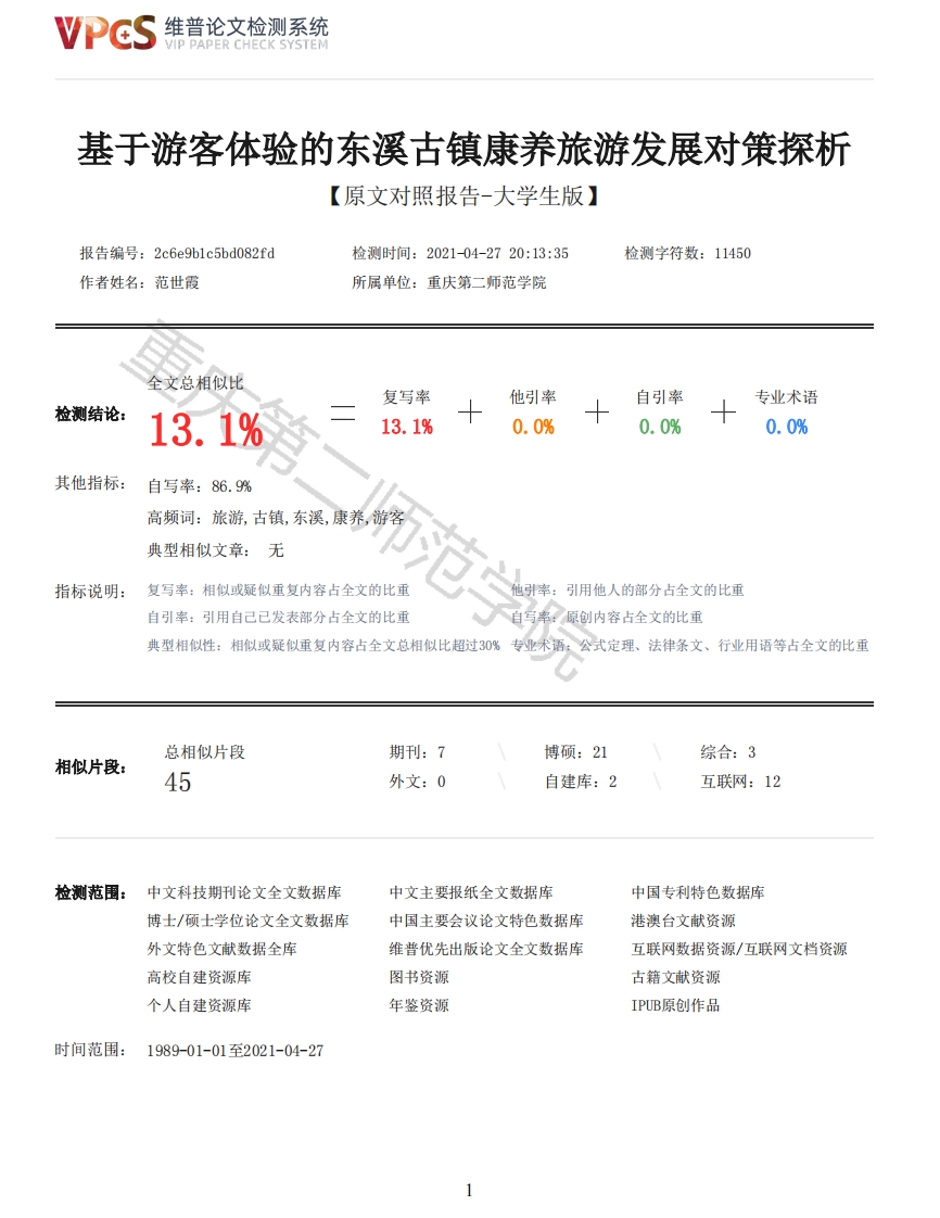 维普论文检测系统VIP PAPER CHECK SYSTEM基于游客体验的东溪古镇康养旅游发展对策探析【原文对照报告-大学生版】报告编号:2c6e9b1c5bd082fd检测时间:2021-04-2720:13:35检测字符数:11450作者姓名:范世霞所属单位:重庆第二师范学院全文总相似比复写率他引率自引率专业术语检测结论:13.1%13.1%0.0%0.0%0.0%其他指标:自写率:86.9%高频词:旅游,古镇,东溪,康养,游客典型相似文章:无指标说明:复写率:相似或疑似重复内容占全文的比重引用他人的部分占全文的比重自引率:引用自己已发表部分占全文的比重自写率:原创内容占全文的比重典型相似性:相似或疑似重复内容占全文总相似比超过30%专业术语:公式定理、法律条文、行业用语等占全文的比重总相似片段期刊:7博硕:21综合:3相似片段:45外文:0自建库:2互联网:12检测范围:中文科技期刊论文全文数据库中文主要报纸全文数据库中国专利特色数据库博士/硕士学位论文全文数据库中国主要会议论文特色数据库港澳台文献资源外文特色文献数据全库维普优先出版论文全文数据库互联网数据资源/互联网文档资源高校自建资源库图书资源古籍文献资源个人自建资源库年鉴资源IPUB原创作品时间范围:1989-01-01至2021-04-27维普论文检测系统VIP PAPER CHECK SYSTEM原文对照颜色标注说明:■自写片段■复写片段(相似或疑似重复)口引用片段(引用)■专业术语(公式定理、法律条文、行业用语等)重庆第二师范学院2017届全日制本科生毕业论文资料册题目基于游客体验的东溪古镇康养旅游发展对策探析教学学院旅游与服务管理学院专业年级17级旅游管理一班学生姓名范世霞学号1710289110指导教师黄小亚职称讲师2021年月目录一、理论基础4(一)康养旅游概念4(二)游客体验4二、东溪古镇康养旅游资源分析5(一)东溪古镇简介5(二)东溪古镇康养旅游资源概况51、自然旅游资源52、人文旅游资源5三、游客体验下东溪古镇康养旅游发展现状及问题6(一)东溪古镇康养旅游发展现状61、以自驾观光为主要旅游形式,旅游客源基本稳定62、古镇旅游资源保护的当,文化原真性较高63、文化与旅游融合发展,古镇影响力初显6(二)东溪古镇康养旅游发展存在的问题71、康养旅游定位不明确,古镇康养品牌形象不突出。72、旅游资源开发深度不够,康养旅游产品难以满足需求73、旅游基础设施不完善,康养旅游服务水平尚待提高7四、基于游客体验的东溪古镇康养旅游发展对策的探析82维普论文检测系统VIP PAPER CHECK SYSTEM(一)明确古镇康养定位,打造古镇康养旅游品牌8(二)深化古镇资源开发,丰富康养旅游产品9(三)完善旅游基础服务设施,提升康养旅游服务水平9五、结论10参考文献10致谢12基于游客体验的东溪古镇康养旅游发展对策探析旅游与服务管理学院旅游管理专业2017级范世霞摘要:伴随着国内旅游业的转型发展,康养旅游市场需求越来越强烈。本文选取东溪古镇作为研究对象,采用实地考察和走访调查的形式,从游客体验的角度分析了东溪古镇康养旅游的发展现状和存在的问题。研究发现东溪古镇康养旅游存在康养旅游定位不明确,古镇康养品牌形象不突出、旅游资源开发深度不够,康养旅游产品难以满足需求、旅游基础设施不完善,康养旅游服务水平尚待提高等问题,并从古镇康养定位与旅游品牌建设、产品开发与供给、服务设施完善,与服务水平三个方面提出东溪古镇康养旅游发展的对策。关键词:康养旅游,游客体验,东溪古镇,旅游发展Abstract:With the transformation and development of domestic tourism,the demand of health caretourism market is more and more intense.This paper selects Dongxi ancient town as the researchobject,using the form of on-the-spot investigation and visiting investigation,analyzes thedevelopment status and existing problems of health care tourism in Dongxi ancient town from theperspective of tourist experience.It is found that there are some problems in Dongxi ancienttown's health tourism,such as the unclear positioning of health tourism,the lack of prominentbrand image,the lack of depth of tourism resources development,the difficulty of health tourismproducts to meet the demand,the imperfection of tourism infrastructure,and the improvement ofhealth tourism service level.This paper puts forward the Countermeasures for the development ofhealth care tourism in Dongxi ancient town from three aspects:the positioning of health caretourism,the construction of tourism brand,the in-depth development of products,the improvement oftourism infrastructure and the improvement of health care tourism service level.Key words:Heslth care tourism,Touristexperience,Dongxi ancient town tourism development康养旅游已成为国内旅游业的转型升级的重要方向。2016年,国家旅游局出台了《国家康养旅游基地示范标准》对康养旅游进行了定义。同年,国务院颁布《“健康中国2030”规划纲要》,将健康中国上升为国家战略。2017年,国家五部委联合发布《关于促进健康旅游发展的指导意见》,进一步推动了康养旅游的发展。在一系列国家旅游政策的指导下,国内旅游业积极探索康养旅游发展新模式,并在全国各地推出了形式多样的康养旅游项目。作为重庆十大名镇之一,同时也是国家历史文化古镇的东溪古镇,有着横跨千年的历史积淀;有着岁月与现代碰撞的火花:有着优秀且多样的文化:有着清新秀丽的自然风光,在康养旅游方面有巨大的发展潜力。目前,有关于东溪古镇的旅游开发与发展的研究中,主要集中于东溪古镇文化研究和古镇