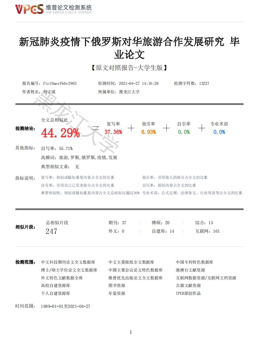 维普论文检测系统VIP PAPER CHECK SYSTEM新冠肺炎疫情下俄罗斯对华旅游合作发展研究毕业论文【原文对照报告-大学生版】报告编号:f1c19 aecfb6c2903检测时间:2021-04-2714:16:28检测字符数:13227作者姓名:刘宇溪所属单位:黑龙江大学全文总相似比复写率他引率自引率专业术语检测结论:44.29%37.36%6.93%0.0%0.0%其他指标:自写率:55.71%高频词:旅游,罗斯,俄罗斯,疫情,发展典型相似文章:无指标说明:复写率:相似或疑似重复内容占全文的比重他引率:引用他人的部分占全文的比重自引率:引用自己已发表部分占全文的比重自写率:原创内容占全文的比重典型相似性:相似或疑似重复内容占全文总相似比超过30%专业术语:公式定理、法律条文、行业用语等占全文的比重总相似片段期刊:37博硕:20综合:15相似片段:247外文:0自建库:14互联网:161检测范围:中文科技期刊论文全文数据库中文主要报纸全文数据库中国专利特色数据库博士/硕士学位论文全文数据库中国主要会议论文特色数据库港澳台文献资源外文特色文献数据全库维普优先出版论文全文数据库互联网数据资源/互联网文档资源高校自建资源库图书资源古籍文献资源个人自建资源库年鉴资源IPUB原创作品时间范围:1989-01-01至2021-04-27维普论文检测系统VIP PAPER CHECK SYSTEM原文对照颜色标注说明:■自写片段■复写片段(相似或疑似重复)口引用片段(引用)■专业术语(公式定理、法律条文、行业用语等)本科学生毕业论文论文题目:新冠肺炎疫情下俄罗斯对华旅游合作发展研究学院:俄语学院年级:2017级专业:俄语姓名:刘宇溪学号:20170250指导教师:魏春洁2021年4月15日摘要2019年底新冠肺炎疫情在中国被发现,到2020年初,新冠肺炎疫情在世界范围内大面积爆发。中俄两国因地理位置相邻,俄罗斯成为继中国后受疫情影响最为严重的国家。此次疫情现今已持续了1年多,给俄罗斯本国经济带来了巨大冲击。在这样的经济状况下,国家的各行各业都面临着重大挑战,其中,旅游业首当其冲。旅游业作为国家经济发展的第三产业,为国家带来的是巨大的经济效益,但疫情出现后,旅游业及其相关产业遭受了重创。新冠肺炎疫情爆发前,俄罗斯旅游业发展势头正猛,潜力巨大。俄罗斯对华的旅游成为俄罗斯旅游业收益的重要产出。俄罗斯与中国两国相邻,政治友好,双方互为重要的客源国和旅游基地,互相把对方视为优先合作对象。开展旅游合作,有利于加深各自对彼此自然环境,历史渊源和文化传统的认知,增进彼此间的相互了解和交流,对于加强俄罗斯与中国全面战略协作伙伴关系有着极为重要的意义。而在新冠肺炎疫情爆发后,俄罗斯对华旅游合作被迫中断。俄罗斯对华旅游合作正在面临着前所未有的重大挑战。在此背景之下,文章全面分析分析了新冠肺炎疫情下的俄罗斯旅游业发展态势,以及在此背景下俄罗斯如何更好的进行对华旅游合作,并就如何加深俄罗斯对华旅游合作提出了相应措施以及对华旅游合作的前景展望,望对国家及相关旅游产业部门提供一定参考价值。2维普论文检测系统VIP PAPER CHECK SYSTEM关键词新冠肺炎疫情:俄罗斯旅游:对华合作K o T o p aa K H a y a JI y 2020 r o I a p a c n p o c T p a HH JI a c b n o B c e M yM H p y.M 3-3 a r e o r p a d n y e c k o r o n o J o x e HH a P o cc H a c T a n a3 K OH O M H y e C K H X y C JI O B H A X B c e o T p a C JI H B C T p a H eΠO A B JI e HHH O B O A K O P O H bΠH e B M O HH p a3 B H T H eB a x H b,a p y r a c T o p o H a p a cc M a T p H B a e T c K a Kn p H o p H T e T H o e c o T p y I HH y e c T B O.C o 3 H o e c o T p y I HH y e c T B OIp y r a p y r a,H c T o p H y e c K o e n p o H c X o x I e HH e H K y b T y p H b ey k p e n J e HH A P O CC HH C B c e c T o p O HHH M C T p a T e r H y e C K H MK O H T e K c T e c T a T b A II O JI H O C T b o n p o a H a JI H 3 H p o B a H a p a 3 B H T H ep O CC H A C K O r O T y p H 3 M a B H O B O A 3 II H I e M HH B P O CC H A C K O AII H e B M O HHH,a B 3 T O M K O H T e K c T e P o cc HH yy w e B 3 T O MK O H T e K c T e H K a K y r J y 6 H T b p o CC H A C K o e c o T p y I HH y e C T B O BCOVID-19,P o cc H a c K H a T y p H 3 M,C o T p y I HH y e c T B O B K H T a e目录摘要关键词前言第一章新冠肺炎疫情前的俄罗斯旅游发展状况及对华旅游合作状况1.1新冠肺炎疫情前的俄罗斯旅游业状况3