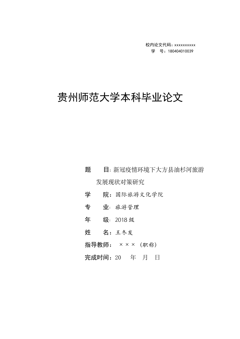 校内论文代码:XXXXXXXXXX学号:180404010039贵州师范大学本科毕业论文题目:新冠疫情环境下大方县油杉河旅游发展现状对策研究学院:国际旅游文化学院专业:旅游管理年级:2018级姓名:王冬发指导教师:×××(职称)完成时间:20年月日目录(二)研究目的与意义1.文献阅读法...2.问卷调查法3.理论联系实际法.1.疫情对乡村文旅发展的影响研究...…2.疫情下我国乡村旅游市场的现状及对策研究.…2三、新冠肺炎疫情影响下大方县油杉河的乡村旅游发展现状分析....442.新冠肺炎疫情影响下游客对大方县油杉河的现状评价分析....…7(三)新冠肺炎疫情影响下大方县油杉河乡村旅游发展存在的问题分析.....121.旅游资源单一.·123.旅游服务水平不高..·4.旅游安全监督不到位135.公共卫生服务亟待改进..四、新冠肺炎疫情影响下大方县油杉河发展乡村旅游的对策..13(一)整合资源优势建设特色景区.·1313(二)完善基础设施建设建设优质景区14142.优化景区餐饮条件和住宿设施..(三)抓好景区服务建设人性化景区141.提高服务人员整体素质..·1415(四)加强防疫监督建设安全景区15(五)重视公共卫生建设文明景区15结论15