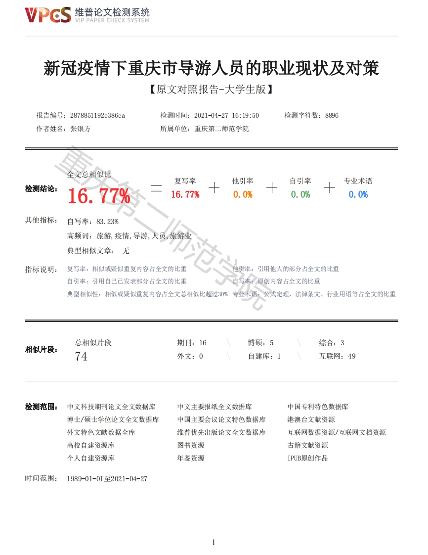 维普论文检测系统VIP PAPER CHECK SYSTEM新冠疫情下重庆市导游人员的职业现状及对策【原文对照报告-大学生版】报告编号:2878851192e386ea检测时间:2021-04-2716:19:50检测字符数:8896作者姓名:张银方所属单位:重庆第二师范学院全文总相似比复写率他引率自引率专业术语检测结论:16.77%16.77%0.0%0.0%0.0%其他指标:自写率:83.23%高频词:旅游,疫情,导游,人员,旅游业典型相似文章:无指标说明:复写率:相似或疑似重复内容占全文的比重引用他人的部分占全文的比重自引率:引用自己已发表部分占全文的比重自写率:原创内容占全文的比重典型相似性:相似或疑似重复内容占全文总相似比超过30%专业术语:公式定理、法律条文、行业用语等占全文的比重总相似片段期刊:16博硕:5综合:3相似片段:74外文:0自建库:1互联网:49检测范围:中文科技期刊论文全文数据库中文主要报纸全文数据库中国专利特色数据库博士/硕士学位论文全文数据库中国主要会议论文特色数据库港澳台文献资源外文特色文献数据全库维普优先出版论文全文数据库互联网数据资源/互联网文档资源高校自建资源库图书资源古籍文献资源个人自建资源库年鉴资源IPUB原创作品时间范围:1989-01-01至2021-04-27维普论文检测系统VIP PAPER CHECK SYSTEM原文对照颜色标注说明:■自写片段■复写片段(相似或疑似重复)口引用片段(引用)■专业术语(公式定理、法律条文、行业用语等)重庆第二师范学院2021届全日制本科生毕业论文题目新冠疫情下重庆市导游人员的职业现状及对策教学学院旅游与服务管理学院专业年级2017级旅游管理专升本学生姓名张银方学号1710917146指导教师蒋述东职称教授2021年新冠疫情下重庆市导游人员的职业现状及对策旅游与服务管理学院旅游管理专业2017级张银方摘要:本文对新冠疫情给入境旅游和国内旅游带来的影响进行了文献调查,对新冠疫情下重庆导游人员职业现状开展了行业问卷调查,通过对疫情前后旅游者对旅行团的需求分析、重庆市导游人员的带团量分析,发现旅游行业普遍存在如下问题:一是旅游团骤减,出团数量得不到保障:二是出团风险大,人生安全得不到保障:三是导游众多,供大于求。在此基础上对导游人员提出如下建议:一是提升自身水平,提高文化素养:二是提高导游服务能力,静待旅游业复苏:三是选择第二职业,度过疫情高发期:四是利用网络营销,发展旅游自媒体等。关键词:新冠肺炎疫情:导游人员;职业现状Abstract:This paper makes a literature survey on the impact of COVID-19 on inbound tourism anddomestic tourism,and conducts an industry questionnaire survey on the current occupation status ofCOVID-19 tour guides in Chongqing.Through analyzing the demand of tourists before and after theoutbreak,and analyzing the tour guides'group size in Chongqing,we find that the tourism industrygenerally has the following problems:first,the tour group is suddenly reduced.The number ofgroups can not be guaranteed;Second,the risk of going out of the group is high,and the safety oflife is not guaranteed;Third,there are many tour guides,and the supply exceeds the demand.Onthis basis,this paper puts forward the following suggestions for tour guides:first,to improvetheir own level and cultural literacy;Second,improve the service ability of tour guides and waitfor the recovery of tourism industry;The third is to choose the second occupation to pass the highepidemic period;Fourth,the use of network marketing,the development of tourism we media.Key words:COVID-19;Tour guide;Career status目录一、新冠疫情对旅游业的影响12维普论文检测系统VIP PAPER CHECK SYSTEM(一)对出入境旅游的影响1(二)对国内旅游业的影响2(三)对重庆市旅游业的影响4二、重庆新冠疫情对旅游业影响调查4(一)疫情前后旅游者对旅行团的需求分析5(二)新冠疫情前后重庆市导游人员的带团量分析6(三)新冠疫情下重庆市导游人员的职业问题调查7三、新冠疫情后重庆导游人员的生存对策8(一)政府救助机制8(二)业界自救举措8(三)个人创新作为9四、总结9参考文献10附录12一、新冠疫情对旅游业的影响2020年春节前后在武汉爆发的新型冠状肺炎疫情在我国范围内迅速蔓延,给我国旅游业造成了巨大的影响。春节期间,本应是旅行团高峰阶段,也是导游人员得到高回报的阶段。然而,受疫情的影响,旅游业全面停滞,出境旅游、入境旅游、国内旅游全部停止,旅行社暂停营业,所有代发旅行团全部停止发团,导游人员进入待业状态。(一)对出入境旅游的影响“文化和旅游部产业发展司司长高政说,新冠肺炎疫情发生以来,为遏制疫情蔓延,文化和旅游部1月24日发出暂停旅游企业经营活动的紧急通知,全国旅行社和在线旅游公司已暂停经营团队游和机票+酒店游产品,出入境旅游处于停滞状态。”新冠疫情期间,出入境旅游基本停滞,许多国外航空公司暂停了往返中国的航班,并且禁止过往14天内在华旅游的所有外国人入境。这一行为严重打击了我国出境旅游市场,中国人口众多,是最大的出境旅游市场国家,因此全球旅游业受到一定程度的影响。表1.1疫情期间部分国家对我国的出入境管制措施(截至2月2日)国家/地区管制措施起始时间朝鲜暂时禁止中国公民入境,暂停向中国公民签发落地签证等措施。/马来西亚禁止中国湖北籍公民入境,所有中国旅客及其他国家旅客需在国/际入境口处接受体温检测。新加坡中国公民(包括非中国籍旅客)禁止入境。2020年2月2日蒙古禁止中国公民及经过中国前往蒙古的