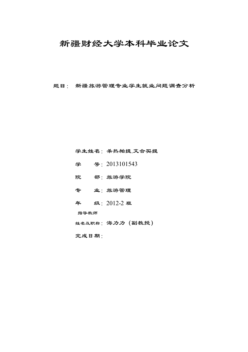 新疆财经大学本科毕业论文题目:新疆旅游管理专业学生就业问题调查分析学生姓名:杀热帕提.艾合买提学号:2013101543院部:旅游学院专年级:2012-2班姓名及职称:海力力(副教授)完成日期:新疆旅游管理专业学生就业问题调查分析内容摘要:国内旅游业得到全面发展,在上述发展过程中,需要众多综合素养高的人才,上述时机给目前的学校旅游管理管理专业毕业生准备了众多发展机遇。但是,真实状况却是此专业学生在管理就业的比值持续降低。公司中的大学生职员流失率也始终维持在较高的水平。本文从大学生择业观、高校课程设置以及旅游管理专业学生流失于本行业的现状,流失问题产生的原因等方面,对旅游管理专业大学生的就业前景进行了探讨并提出了相应的建议,希望通过研究提出具有实际指导意义的建议,推进高校旅游管理专业人才培养方案的改革,并促进和企业双方人才供需的良性发展。关键词:旅游管理专业学生就业分析目录新疆旅游管理专业学生就业问题调查及决策.11(二)研究意义2二、旅游管理专业学生的就业现状(一)就业现状.(三)理论基础4三、问卷分析调查…4(一)问卷设计思路5(二)调查对象选取说明及情况5(三)调查结果.四、旅游管理专业学生就业存在的问题7(一)就业单位对口率低…(二)工作稳定性差…(三)大学生就业观念存在问题8五、提高旅游管理专业学生就业问题的建议(一)旅游企业增强自身的吸引力(二)学校需构建就业系统,强化就业课程10(三)树立学生的职业信仰.12(四)适当地调整课程结构结论…14.15附录…