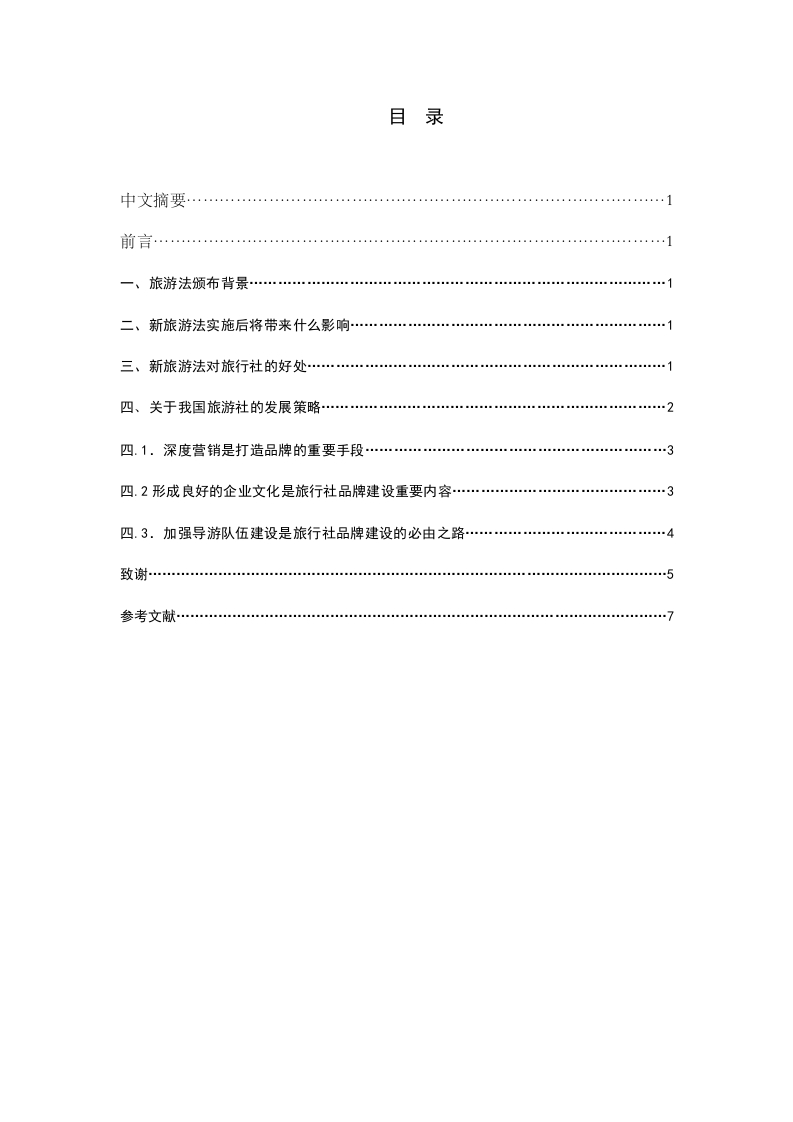 目录中文摘要…一、旅游法颁布背景……二、新旅游法实施后将带来什么影响三、新旅游法对旅行社的好处…1四、关于我国旅游社的发展策略…四.1.深度营销是打造品牌的重要手段…………3四.2形成良好的企业文化是旅行社品牌建设重要内容……3四.3.加强导游队伍建设是旅行社品牌建设的必由之路…4致谢…参考文献7新旅游法实施后旅行社发展策略(作者名字)摘要:自从2013年10月1日《旅游法》实施后,新旅行社条例的出台在业界引起了较大的反响,并将对旅行社产生较大影响,其最大的亮点是进一步规范了旅行社的经营行为,加强了维护游客权益的力度。为适应新旅行社条例,旅行社应高度重视旅游质量、树立正当竞争观念;牢固树立合同意识,维护游客和自身权益;加强队伍培训与管理,提高经营管理水平。各旅行社才去了应对新旅游法的措施,为了适应现在的发展趋势,他们不得不加强自身的管理,优化自身大战模式,提高自身实力,好在竞争中求生存,在发展中求进步。关键字:好处发展利益新旅游法策略影响一、旅游法颁布背景8月27日,旅游法草案首次提请全国人大常委会审议,旅游管理部门、旅游行业和广大旅游者一直期盼的旅游法终于浮出水面。旅游法是改苹开放初期就启动的一个立法项目,曾列入七届全国人大常委会立法规划和国务院立法计划,但由于当时我国旅游业还处于起步阶段,有关方面对立法涉及的一些重要问题认识不尽一致,这部法律草案未能提请审议。我国旅游业近年来快速发展,据统计,截至2011年底,全国各类旅游景区景点达到两万多处,旅行社达到两万多个,星级饭店达到一万多家,旅游直接从业人员超过1300万人,国内旅游人数超过26亿人次,接待入境旅游超过1.35亿人次,公民出境旅游超过7000万人次,国内旅游市场规模居全球第一位,接待入境旅游人数和公民出境旅游消费居全球第三位。但是目前我国旅游市场不正当竞争问题比较严重,损害了旅游者和经营者合法权益,迫切需要制定旅游法明确一些基本法律规范和旅游合同特殊规定,建立和改进旅游与相关行业管理的协调机制。没有一部专门的旅游法,与我国世界旅游大国的地位身份已不匹配。世界上目前已有0多个国家和地区制定了旅游法律。八届全国人大以来,社会上要求制定旅游法的呼声进一步提高。十一届全国人大财政经济委员会成立后,于2009年12月牵头组织国家发展和改革委员会、国家旅游局等23个部门和有关专家成立旅游法起草组。二、新旅游法实施后将带来什么影响10月1日起《旅游法》将正式实施,新法将打击“零付团费”、“自费项目”、“购物点”。中秋节前,国家旅游局旅游质量监督管理所发出警告,将对旅行社强迫购物严惩不贷。随着新旅游法的出台,与往年不同的是,昨年国庆长假,旅客在桃选旅行社报团出游时,不妨看看再起网站主页的显著位置有没有其业务经营许可证的信息。旅游委相关负责人表示,在线旅游给游客带来了便利的同时,也面临着大量虚假非法信息致使上当受骗的风险,而新颁布的《旅游法》对于在线旅行社的规定,却意味着游客可以看“认证”选择网上值得信赖旅行社,减少风险。一直以来,我国在线旅游网站数量众多,产品质量参差不齐,甚至有的网站根本就不具备从事旅游业务的经营资格,就比如在旅行社在带团出境是,就需要出示相关的证件许可,但是有些小型旅行社或者不正规的旅行社受利益驱使,在没有取得出境资格的情况下,在网站上发布一些国际旅游线路产品。而在这一类旅行社在新法出台后就有所改观,得到了一定的成绩。三、在新旅游法出台后,是不是旅游行程当中就不能有购物安排了呢?厦门旅游协会旅行社分会会长,厦门春辉国旅总经理马志强表示,购物还是可以的,但是不能安排到行程中,未来将更加规范。经过双方协商一致或者旅游者不影响其他游客安排的除外。也就是游客可以自己选择购物点,而旅行社就不能够强迫游客到有回扣点的商店。若游客有购物需求,可以在行程中的自由活动时前去购买。三、新旅游法对旅行社的好处第一、新旅游法对严厉打击黑社、黑导、黑车,这对在正规竞争中显的更为公平,对不法分子会产生恐惧,这也对旅游事业以后的发展铺平了道路,为正规的法人留够了发展空间,能够光明正大的向前奔跑。第二、就是禁止了旅行社的低价恶意竞争,保护了正规旅行社的基本利益,维护了市场的和谐。自从新法颁布了后,对于那些低价竞争的旅行社来说,不免是一次严厉的打击,虽然说薄利多销,但是,当薄利到一定时,会造成严重的市场反应,造成严重的社会影响。所以要严厉打击那些乱搞物价的。正规的物价是由物价局统一颁布的,不是你我所能够控制的,我们只能照办执行就可。第三、禁止强制游客购物消费,表面看起来好像削减了旅行社的利益,但实际上,旅行社原本就不在乎提成这点儿利润,所以规范后将还原利润的合法性,而不是靠灰色提成来提升利润。对于提成的说法我们已经是屡见不鲜了,所谓多劳多得大概也就是这个道理吧。但是强制消费者来消费你的产品,然后你就去提成,这是严重的侵犯的消费者的合法权益,每个人都有消费自由权,任何人无权干涉。第四、规范了游客的行为和责任,防止游客的过度维权,导致旅行社的被迫赔偿。在旅行时,难免会出现这样或者那样的问题,但是消