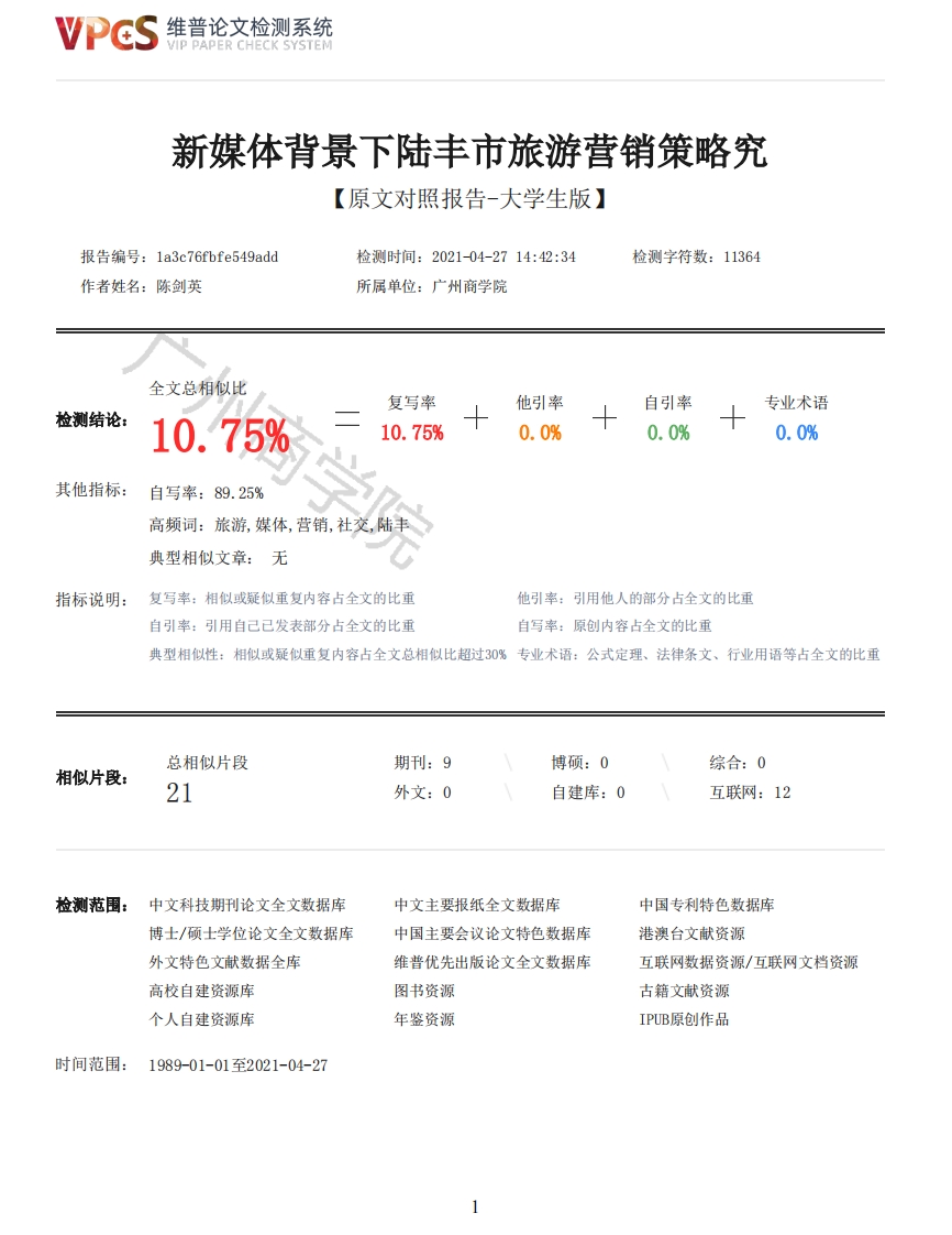 维普论文检测系统/IP PAPER CHECK SYSTEM新媒体背景下陆丰旅游营销策略究【原文对照报告-大学生版】报告编号:1a3c76fbfe549add检测时间:2021-04-2714:42:34检测字符数:11364作者姓名:陈剑英所属单位:广州商学院全文总相似比复写率他引率自引率专业术语检测结论:10.75%10.75%0.0%0.0%0.0%其他指标:自写率:89.25%高频词:旅游,媒体,营销,社交,陆丰典型相似文章:无指标说明:复写率:相似或疑似重复内容占全文的比重他引率:引用他人的部分占全文的比重自引率:引用自己已发表部分占全文的比重自写率:原创内容占全文的比重典型相似性:相似或疑似重复内容占全文总相似比超过30%专业术语:公式定理、法律条文、行业用语等占全文的比重总相似片段期刊:9博硕:0综合:0相似片段:21外文:0自建库:0互联网:12检测范围:中文科技期刊论文全文数据库中文主要报纸全文数据库中国专利特色数据库博士/硕士学位论文全文数据库中国主要会议论文特色数据库港澳台文献资源外文特色文献数据全库维普优先出版论文全文数据库互联网数据资源/互联网文档资源高校自建资源库图书资源古籍文献资源个人自建资源库年鉴资源IPUB原创作品时间范围:1989-01-01至2021-04-27维普论文检测系统VIP PAPER CHECK SYSTEM原文对照颜色标注说明:■自写片段■复写片段(相似或疑似重复)口引用片段(引用)■专业术语(公式定理、法律条文、行业用语等)论文编号:广州商学院本科毕业论文(设计)题目:新媒体背景下陆丰市旅游营销策略究姓名:陈剑英学号:201702010067学院:管理学院专业班级:旅游管理指导教师:2021年4月26日本科毕业论文(设计)原创性声明本人郑重声明:所呈交的毕业论文(设计),是本人在导师的指导下,独立进行研究工作所取得的成果。除文中已经注明引用的内容外,本论文不含任何其他个人或集体已经发表或撰写过的作品或成果。对本文的研究做出重要贡献的个人和集体,均已在文中以明确方式标明。本声明的法律结果由本人承担。论文作者签名:日期:2021年4月26日本科毕业论文(设计)版权使用授权书本论文(设计)作者完全了解学校有关保留、使用毕业论文(设计)的规定,同意学校保留并向国家有关部门或机构送交论文的复印件和电子版,允许论文(设计)被查阅和借阅。本人授权广州商学院可以将本论文(设计)的全部或部分内容编入有关数据库进行检索,可以采用影印、缩印或扫描等复制手段保存和汇编本论文(设计)。本论文(设计)属于1.保密口,在年解密后适用本授权书。2.不保密0。(请在以上相应方框内打“J”)作者签名:日期:2021年4月26日指导老师签名:日期:年月日目录摘要IIIAbstractIV一、绪论1(一)选题背景1(二)研究意义1二、新媒体营销概述12维普论文检测系统VIP PAPER CHECK SYSTEM(一)新媒体概述11.收集客户数据12.建立关系23.懂得何时销售2(二)新媒体营销的特点2三、陆丰市旅游营销现状3(一)陆丰市旅游发展概述3(二)陆丰市旅游营销普遍存在的问题31.旅游业涉及产业多32.陆丰市旅游产品宣传手段单一33.陆丰市的旅游产品没有特色3四、陆丰市旅游宣传概述3(一)陆丰市传统宣传概况3(二)陆丰市新媒体宣传概况4五、陆丰市旅游新媒体营销策略5(一)多产业协同发展5(二)形成完善的宣传系统7①1.利用大数据实现游客需求精准推送72.实时运营,与游客建立互动关系73.不同新媒体宣传手段之间建立联系84.建立新媒体游客建议平台8(三)突出陆丰旅游特色,打造特色旅游产品8六、结论与展望8(一)研究结论8(二)研究展望8参考文献10致谢11摘要在互联网技术的推动下,新媒体营销得以快速发展,逐渐渗透到各个行业中,与传统营销相比具有诸多的优势。新媒体营销在旅游行业发展中发挥了巨大的作用,成为消费者获取旅游信息的重要途径。分析新媒体营销的优势进行分析,并指出当前旅游新媒体营销存在的问题,并提出相应的建议,以有效发挥新媒体营销在旅游行业发展中的重要作用。关键词:新媒体,陆丰市,旅游,营销AbstractDriven by Internet technology,new media marketing has developed rapidly and graduallypenetrated into various industries,which has many advantages compared with trditional marketing.New media marketing has played a great role in the development of tourism industry and has become animportant way for consumers to obtain tourism information.This paper analyzes the advantages of newmedia marketing,points out the existing problems of new media marketing in tourism,and putsforward corresponding suggestions in order to give full play to the important role of new mediamarketing in the development of tourism industry.Keywords:New Media,Lufeng City,Tourism,Marketing、绪论(一)选题背景新媒体和社交网络有不同的定义。例如,定义为“社交网络是有共同兴趣的人可以聚集在一起分享思想、评论和意见的在线场所”。维基百科(2011)将新媒体定义为“社交互动的媒体,使用高度可访问和可扩展的通信技术。”新媒体是利用网络和移动技术将交流转化为互动对话,例如,YouTube就是一个新媒体渠道,微博是一种新3