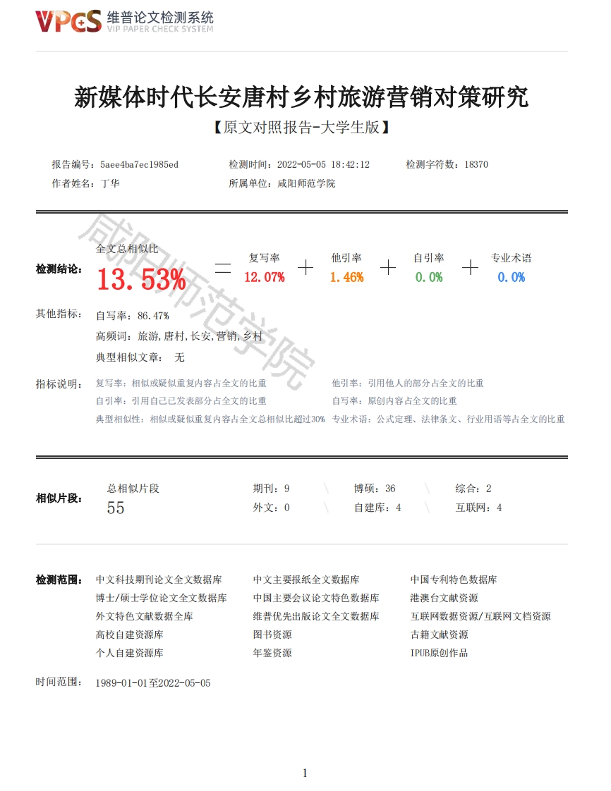 维普论文检测系统/IP PAPER CHECK SYSTEM新媒体时代长安唐村乡村旅游营销对策研究【原文对照报告-大学生版】报告编号:5aee4ba7ec1985ed检测时间:2022-05-0518:42:12检测字符数:18370作者姓名:丁华所属单位:咸阳师范学院全文总相似比复写率他引率自引率专业术语检测结论:13.53%12.07%1.46%0.0%0.0%其他指标:自写率:86.47%高频词:旅游唐村,长安,营销,乡村典型相似文章:无指标说明:复写率:相似或疑似重复内容占全文的比重他引率:引用他人的部分占全文的比重自引率:引用自己已发表部分占全文的比重自写率:原创内容占全文的比重典型相似性:相似或疑似重复内容占全文总相似比超过30%专业术语:公式定理、法律条文、行业用语等占全文的比重总相似片段期刊:9博硕:36综合:2相似片段:55外文:0自建库:4互联网:4检测范围:中文科技期刊论文全文数据库中文主要报纸全文数据库中国专利特色数据库博士/硕士学位论文全文数据库中国主要会议论文特色数据库港澳台文献资源外文特色文献数据全库维普优先出版论文全文数据库互联网数据资源/互联网文档资源高校自建资源库图书资源古籍文献资源个人自建资源库年鉴资源IPUB原创作品时间范围:1989-01-01至2022-05-05维普论文检测系统VIP PAPER CHECK SYSTEM原文对照颜色标注说明:■自写片段■复写片段(相似或疑似重复)引用片段(引用)■专业术语(公式定理、法律条文、行业用语等)摘要新媒体时代背景下长安唐村乡村旅游应当不断深入研究营销策略,促使长安唐村得到长足发展。现阶段人们酷爱休闲放松的乡村旅游,应顺应时代的发展,进而对长安唐村扩大营销,吸引旅游者,形成长安唐村品牌精品化发展。与传统媒介相比较,新媒体在信息传播和产品推广方面有着显著的优势,应积极利用新媒体的优势,不断创新营销手段,打造多样化、专业化的乡村旅游营销模式。本文是对新媒体时代背景下长安唐村乡村旅游营销对策进行深入的研究,并采用文献研究法、实地调研法和问卷调查法等方法进行研究。首先通过4P营销理论对长安唐村营销现状进行分析,并进一步分析长安唐村在新媒体营销中存在的问题,并针对存在的问题结合实际提出新媒体背景下长安唐村乡村旅游营销对策,旨在加强长安唐村知名度的提高及对游客的吸引力,从而实现长安唐村乡村旅游的快速发展。关键词:新媒体:乡村旅游:长安唐村:营销策略AbstractUnder the background of the new media era,the rural tourism of Chang'an Tang Village shouldcontinue to study the marketing strategy in depth,so as to promote the rapid development ofChang'an Tang Village.At this stage,people love leisure and relaxing rural tourism,so they shouldfollow the development of the times,and then expand the marketing of Chang'an Tang Village toattract tourists and form a boutique development of Chang'an Tang Village.Compared with traditionalmedia,new media has significant advantages in information dissemination and product promotion.Weshould actively use the advantages of new media,constantly innovate marketing methods,and create adiversified and professional rural tourism marketing model.This paper conducts an in-depth study onthe rural tourism marketing strategies of Chang'an Tang Village under the background of the newmedia era,and adopts the methods of literature research,field research and questionnaire survey.Firstly,it analyzes the current situation of Chang'an Tang Village's marketing through 4P marketingtheory,and further analyzes the problems existing in Chang'an Tang Village's new media marketing,and puts forward the rural tourism marketing countermeasures in Chang'an Tang Village under thebackground of new media based on the existing problems and the reality.To enhance the popularity ofChang'an Tang Village and its attraction to tourists,so as to realize the rapid development ofChang'an Tang Village's rural tourism.Key words:new media;rural tourism;Chang'an Tang Village;marketing strategy目录Abstract······2维普论文检测系统VIP PAPER CHECK SYSTEM一、绪论······(一)研究背景·············(二)研究目的及意义········(三)国内外现状研究·····(四)研究内容与框架·······(五)研究方法与措施·················二、新媒体背景下乡村旅游产品营销相关概念及理论基础··(二)乡村旅游6(三)旅游营销······三、长安唐村乡村旅游的发展概况6(一)长安唐村乡村旅游发展历程(二)长安唐村乡村旅游资源概况(三)长安唐村乡村旅游市场概况四、长安唐村乡村旅游新媒体营销现状及存在问题12(一)长安唐村乡村旅游新媒体营销现状·········12(二)长安唐村乡村旅游新媒体营销存在问题分析······.15五、新媒体背景下长安唐村市场营销策略···········18(一)深入强化新媒体的互动交流,提升营销质量······18(二)拓宽各大平台推广路径,提高知名度·····18(三)加强新媒体营销团队人才的培养···········18(四)对新媒体平台发布的内容进行规划,实现精准推广19(五)搜索引擎优化·············.19六、结论···········19七、研究不足与展望202122致谢········243