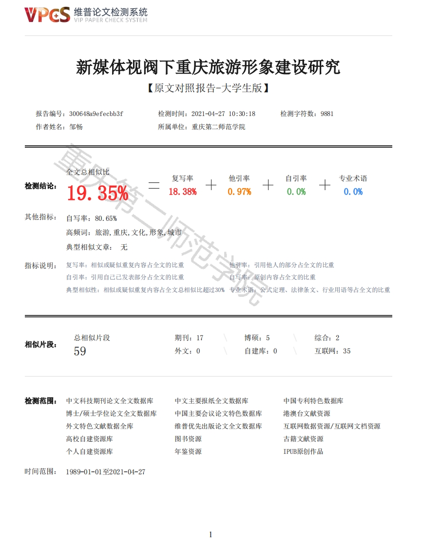 维普论文检测系统VIP PAPER CHECK SYSTEM新媒体视阀下重庆旅游形象建设研究【原文对照报告-大学生版】报告编号:300648a9 efecbb3f检测时间:2021-04-2710:30:18检测字符数:9881作者姓名:邹畅所属单位:重庆第二师范学院全文总相似比复写率他引率自引率专业术语检测结论:19.35%18.38%0.97%0.0%0.0%其他指标:自写率:80.65%高频词:旅游,重庆,文化,形象,城市典型相似文章:无指标说明:复写率:相似或疑似重复内容占全文的比重引用他人的部分占全文的比重自引率:引用自己已发表部分占全文的比重自写率:原创内容占全文的比重典型相似性:相似或疑似重复内容占全文总相似比超过30%专业术语:公式定理、法律条文、行业用语等占全文的比重总相似片段期刊:17博硕:5综合:2相似片段:59外文:0自建库:0互联网:35检测范围:中文科技期刊论文全文数据库中文主要报纸全文数据库中国专利特色数据库博士/硕士学位论文全文数据库中国主要会议论文特色数据库港澳台文献资源外文特色文献数据全库维普优先出版论文全文数据库互联网数据资源/互联网文档资源高校自建资源库图书资源古籍文献资源个人自建资源库年鉴资源IPUB原创作品时间范围:1989-01-01至2021-04-27维普论文检测系统VIP PAPER CHECK SYSTEM原文对照颜色标注说明:■自写片段■复写片段(相似或疑似重复)引用片段(引用)■专业术语(公式定理、法律条文、行业用语等)重庆第二师范学院2019届全日制本科生毕业论文题目新媒体视阀下重庆旅游形象建设研究教学学院旅游与服务管理学院专业年级2017级旅游管理(培越航空)学生姓名邹畅学号1710290002指导教师王文峰职称副教授年2021新媒体视阀下重庆旅游形象建设研究旅游与服务管理学院旅游管理(培越航空合作班)2017级邹畅摘要:随着人们生活水平的不断提高,旅游业发展迅速并且逐渐繁荣起来,在国民经济中所占据的地位也越来越重要。为此,越来越多的城市开始注重旅游形象打造,如何让城市在白热化竞争中脱颖而出,靠的不仅仅是经济、政治、环境等,而是必须挖掘自身城市的优势、特点、亮点,重视和强调城市旅游形象在城市建设和发展中的重要作用。本文探讨重庆旅游城市形象建设,从特色文化培育、文旅形象宣传、特色品牌打造以及服务水平提升入手,通过发挥新媒体传播不受时间、空间限制的属性,同时平台众多,参与度广,受众多等优势,将重庆进行全方位展示,打造重庆特色旅游城市形象。关键词:新媒体;旅游形象建设:重庆旅游形象:Abstract:With the continuous improvement of people's living standards,tourism develops rapidlyand flourishes gradually,and plays an increasingly important role in the national economy.To thisend,more and more cities began to pay attention to the image of tourism,how to make the city standout in the white-hot competition,not only by the economy,politics,environment,but must dig theirown city's advantages,characteristics,highlights,pay attention to and emphasize the importantrole of city tourism image in the city construction and development.This paper discusses chongqingtourism city image construction,from the characteristic culture,tour image promotion andcharacteristic branding and service level,through the play to the new media is not restricted bytime,space,the properties of the numerous platforms at the same time,wide participation,withmany advantages,such as will be displayed,chongqing chongqing characteristics of city tourismimage.2维普论文检测系统VIP PAPER CHECK SYSTEMKey words:new media;tourism image construction;tourism image of Chongqing目录一、重庆旅游形象建设现状1(一)网红景点的打卡热潮1(二)重庆明星的大力推广1(三)政府民众的协同合作2二、重庆旅游形象建设存在问题2(一)旅游形象定位还不够精准2(二)文化环境形象还有待升华(三)文旅品牌形象还有待挖掘4(四)旅游服务水平还有待提高5三、新媒体视阀下重庆旅游形象建设策略6(一)科学定位,挖掘培育特色文化价值6(二)丰富载体,加强文旅形象宣传推广6(三)统整资源,打造文旅特色品牌工程7(四)引育结合,提升文旅服务能力水平8四、结语9参考文献9致谢10一、重庆旅游形象建设现状(一)网红景点的打卡热潮近年来,自媒体时代兴起,各种短视频APP、微博、小红书等成为获取信息的第一选择。其中,重庆旅游的走红大部分便得益于新媒体对其传播。据清华大学国家形象传播研究中心城市品牌研究室发布的《短视频与城市形象研究白皮书》统计。2018年,重庆市城市形象短视频播放量在抖音APP高居全国第一,吸引众多旅游者目光的,例如穿楼而过的李子坝轻轨站:夜晚灯光绚丽的洪崖洞:惊险刺激的万盛奥陶纪等景点。同时,重庆独特的地理环境也吸引了电影、电视剧将其选择取景地,《少年的你》、《从你的全世界路过》等也带动了地点成为影迷或游客的打卡胜地。重庆市在抖音等短视频APP爆红的现象直观的反映出了新媒体在城市旅游形象的塑造中起到了重要作用,山城重庆以其独特的魅力,在这波移动互联网的短视频风口中拔得头筹,塑造出了极具吸引力的旅游品牌。(二)重庆明星的大力推广重庆的爆火除了美食、美景,还有人。重庆的明星数量不在于多,但他们在自己专业的领域上大力推广重庆,让重庆旅游形象更加鲜明的呈现在观众、粉丝眼前,增加了其对重庆这座城市的好奇心与好感度。TFboys中的王俊凯、王源都是重庆本地人,他们会在工作的平台上发布说重庆话的视频,还会创作出重庆话的r即,带有重