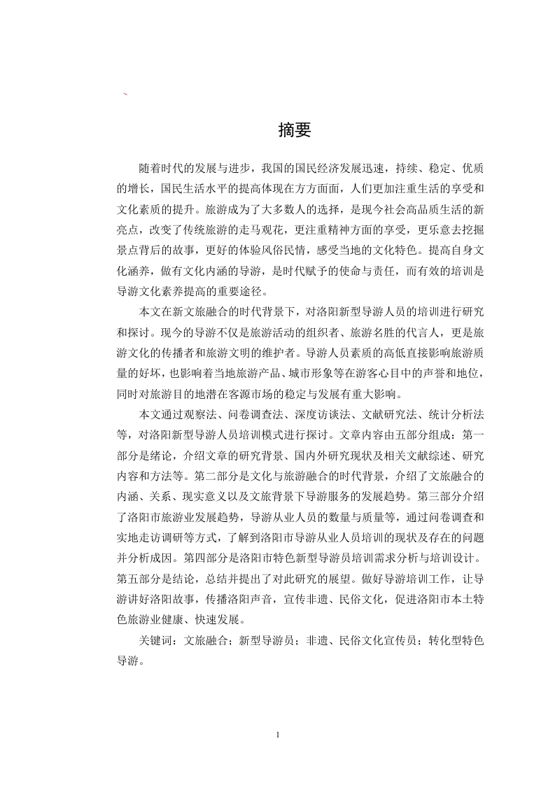 摘要随着时代的发展与进步,我国的国民经济发展迅速,持续、稳定、优质的增长,国民生活水平的提高体现在方方面面,人们更加注重生活的享受和文化素质的提升。旅游成为了大多数人的选择,是现今社会高品质生活的新亮点,改变了传统旅游的走马观花,更注重精神方面的享受,更乐意去挖掘景点背后的故事,更好的体验风俗民情,感受当地的文化特色。提高自身文化涵养,做有文化内涵的导游,是时代赋予的使命与责任,而有效的培训是导游文化素养提高的重要途径。本文在新文旅融合的时代背景下,对洛阳新型导游人员的培训进行研究和探讨。现今的导游不仅是旅游活动的组织者、旅游名胜的代言人,更是旅游文化的传播者和旅游文明的维护者。导游人员素质的高低直接影响旅游质量的好坏,也影响着当地旅游产品、城市形象等在游客心目中的声誉和地位,同时对旅游目的地潜在客源市场的稳定与发展有重大影响。本文通过观察法、问卷调查法、深度访谈法、文献研究法、统计分析法等,对洛阳新型导游人员培训模式进行探讨。文章内容由五部分组成:第一部分是绪论,介绍文章的研究背景、国内外研究现状及相关文献综述、研究内容和方法等。第二部分是文化与旅游融合的时代背景,介绍了文旅融合的内涵、关系、现实意义以及文旅背景下导游服务的发展趋势。第三部分介绍了洛阳市旅游业发展趋势,导游从业人员的数量与质量等,通过问卷调查和实地走访调研等方式,了解到洛阳市导游从业人员培训的现状及存在的问题并分析成因。第四部分是洛阳市特色新型导游员培训需求分析与培训设计。第五部分是结论,总结并提出了对此研究的展望。做好导游培训工作,让导游讲好洛阳故事,传播洛阳声音,宣传非遗、民俗文化,促进洛阳市本土特色旅游业健康、快速发展。关键词:文旅融合:新型导游员:非遗、民俗文化宣传员;转化型特色导游。1AbstractWith the development and progress of the times,China's national economy hasdeveloped rapidly,sustained,stable and high-quality growth,and theimprovement of national living standards is reflected in all aspects,and peoplepay more attention to the enjoyment of life and the improvement of culturalquality.Tourism has become the choice of most people,is a new bright spot ofhigh quality life in today's society,has changed the traditional tourism,pays moreattention to the spiritual enjoyment,is more willing to dig the story behind thescenic spots,better experience the customs and people,feel the local culturalcharacteristics.It is the mission and responsibility of the times to improve thecultural self-cultivation and to be a tour guide with cultural connotation,and theeffective training is the tour guide's text important pathway for theimprovement of chemical literacy.Under the background of the integration of Xinwen brigade,this paper studiesand discusses the training of new tour guides in Luoyang.Nowadays tour guidesare not only organizers of tourism activities,spokesmen of tourist attractions,butalso communicators of tourism culture and defenders of tourism civilization.Thequality of tour guides directly affects the quality of tourism,but also affects thereputation and status of local tourism products,city image and so on in the eyesof tourists,at the same time,it has a great impact on the stability anddevelopment of the potential tourist market in tourist destinations.This paper discusses the training mode of new tour guides in Luoyang throughobservation method,questionnaire survey method,in-depth interview method,literature research method and statistical analysis method.The content of thearticle consists of five parts:the first part is the introduction,which introduces theresearch background of the article,the current research situation at home and2abroad,and the relevant literature review,research content and methods,etc.Thesecond part is the background of the integration of culture and tourism,andintroduces the connotation,relationship,practical significance and thedevelopment trend of tour guide service under the background of cultural andtourism integration.The third part introduces the development trend of tourismindustry in Luoyang city,the number and quality of tour guides,etc.Visitresearch and other ways to understand the current situation and existing problemsin the training of tour guide practitioners in Luoyang City and analyze the causes.The fourth part is the training demand analysis and training design of the newtype tour guide in Luoyang.The fifth part is the conclusion,summarizes and putsforward the prospect to this research.Do a good job of guide training,let theguide tell the story of Luoyang,spread the voice of Luoyang,propagate thenon-legacy,folk culture,and promote the healthy and rapid development oftourism with local characteristics in Luoyang.Keywords Cultural and travel integration;new type of tour guide;non-legacy,folkculture propagandists;transformational characteristic tour guide.